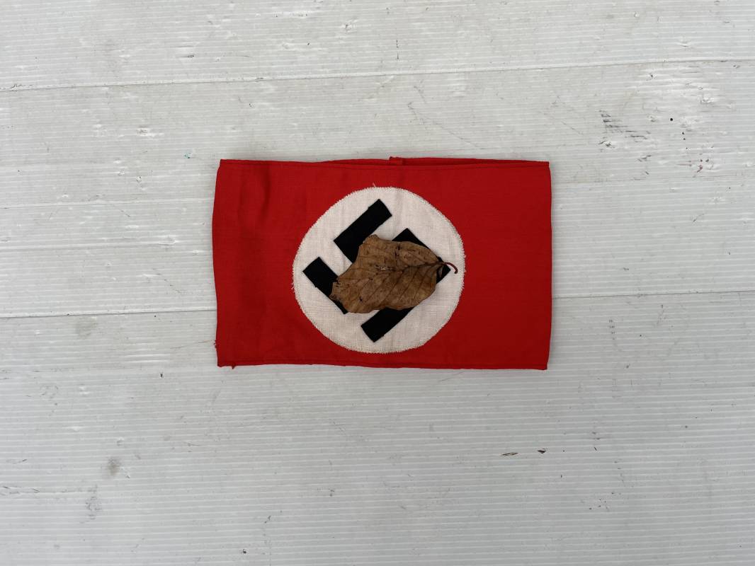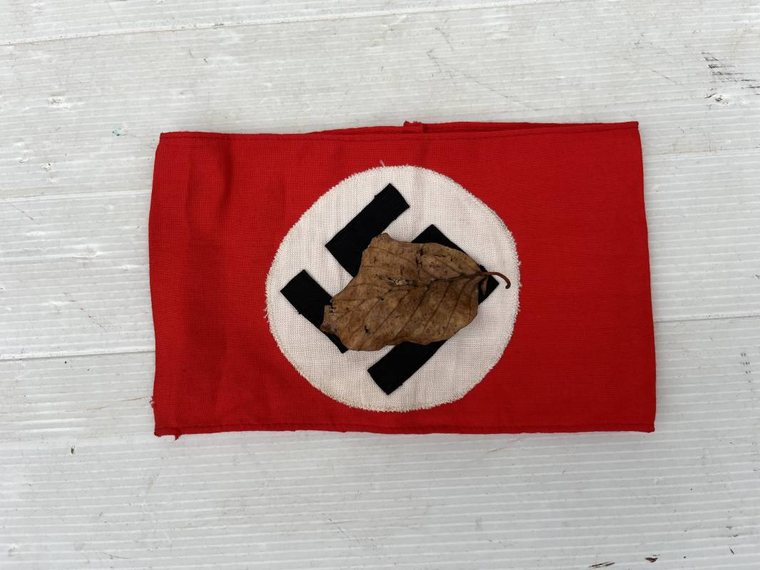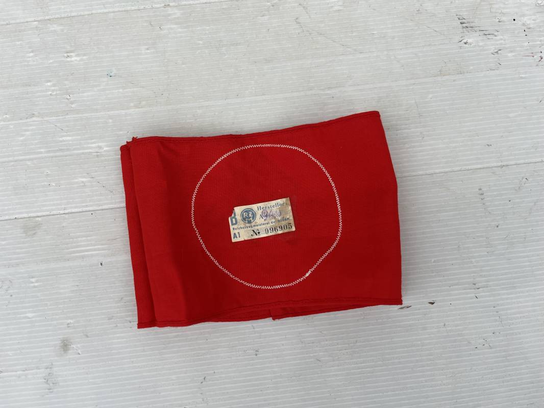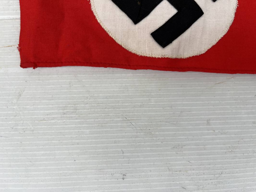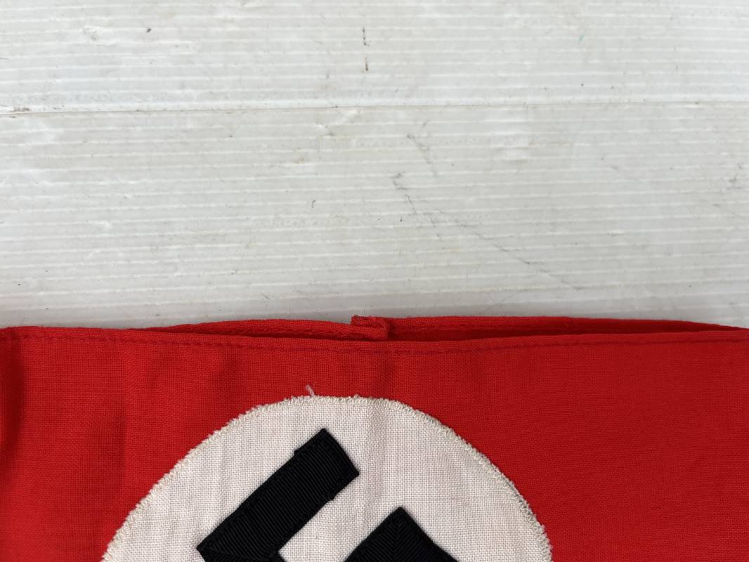 Bon brassard pour personnel du NSDAP (SA, NSKK, RAD...) Brassard en coton rouge, rond blanc cousu. Croix cousue en coton satiné noir. Etiquette papier RZM code fabricant 940 . Dimensions a plat : 192mmx112mm. Trés Légèrement porté en parfait état. Ref 21211