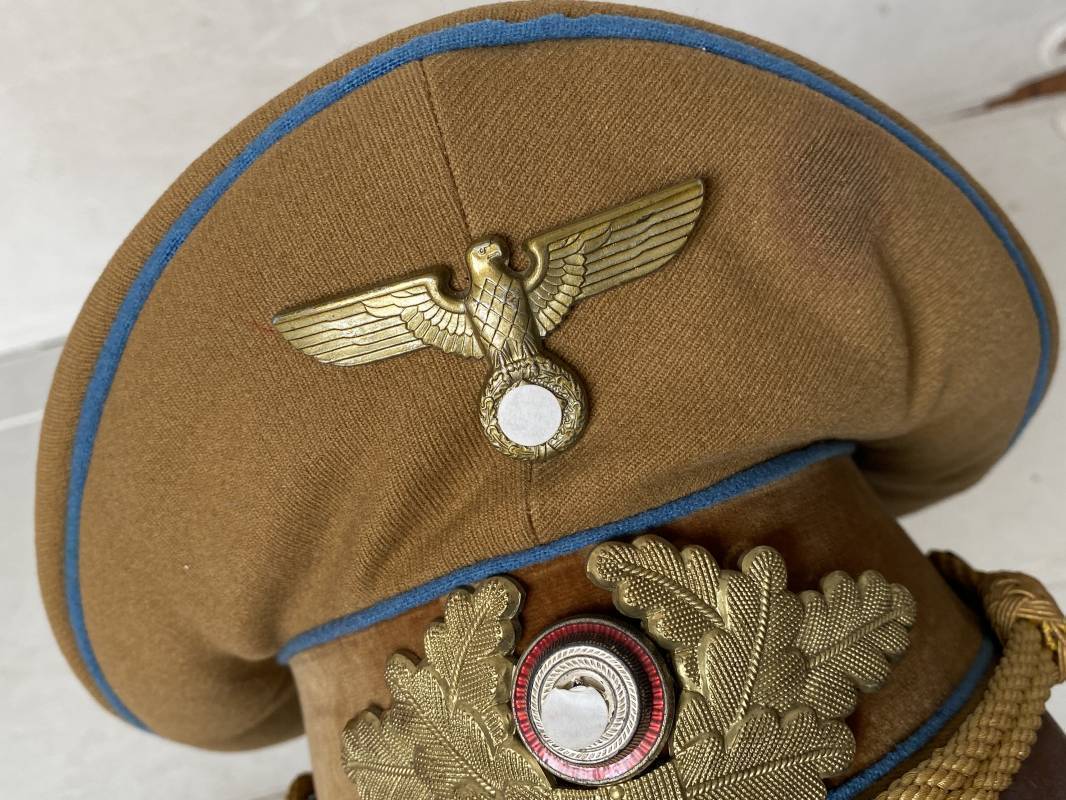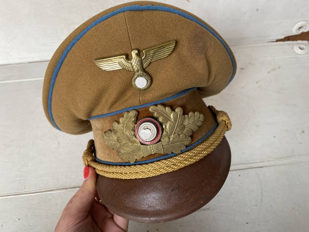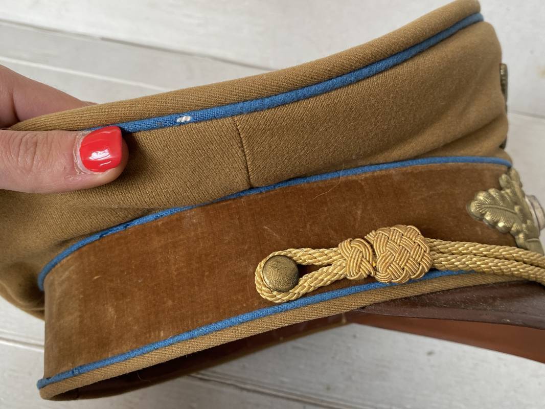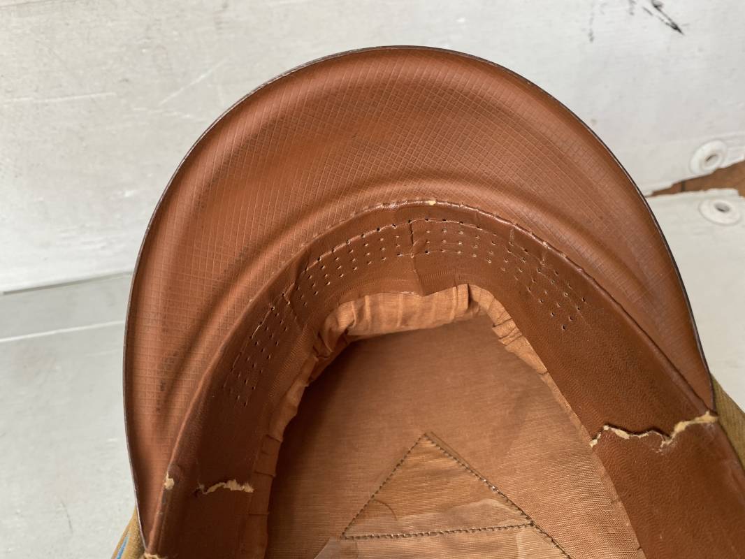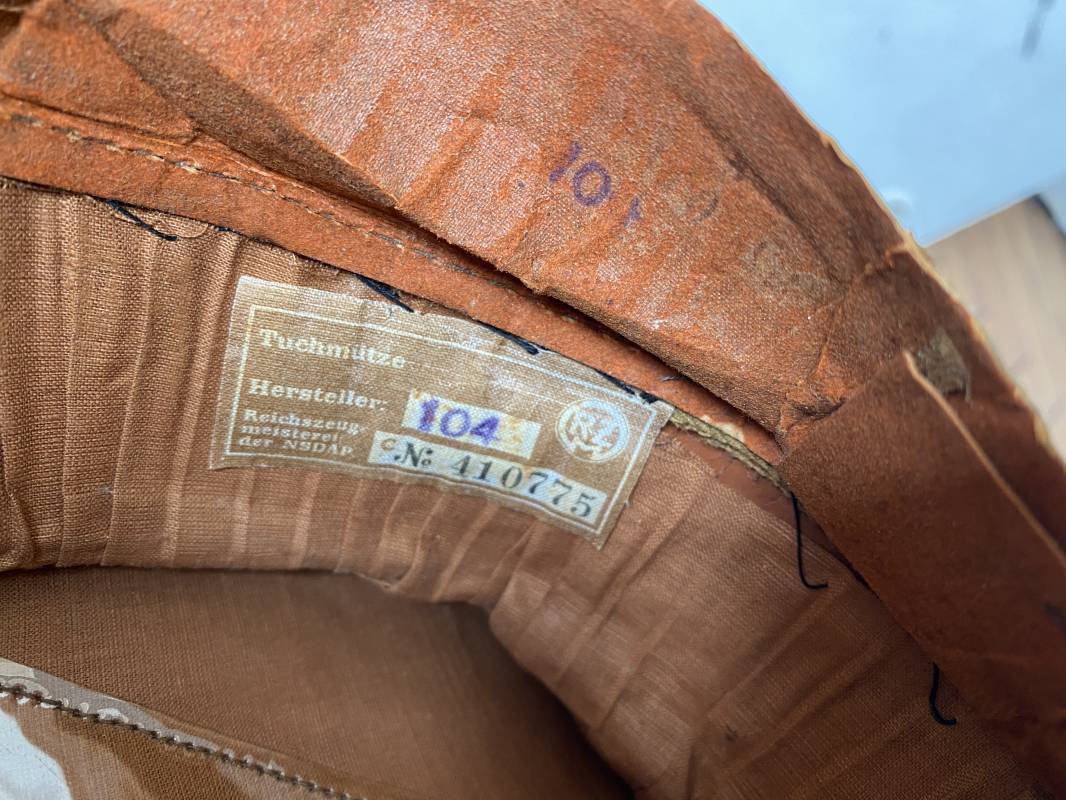 Très belle casquette modèle 1939 d'un Directeur Politique du NSDAP. 'Politische Leiter'. Casquette en gabardine brune. Liseré bleu clair des Orstgruppen. Insignes métalliques dorés aigle et cocarde. Insigne émaillé du NSDAP. Bandeau de coiffe en velours brun. Jugulaire torsadée dorée. Visière en fibre vulcanisée marron. Revers quadrillé brun. Intérieur de la coiffe doublé en coton marron. Rhodoid sans marquage. Bandeau de coiffe en carton/cuir brun (alkor). Deux déchirures sur bandeau (voir photo). Etiquette RZM avec code fabricant ( hersteller 104 ) sous bandeau . Casquette légèrement portée en parfait état. Belle forme haute. Taille 56 1939/45. Ref 16489