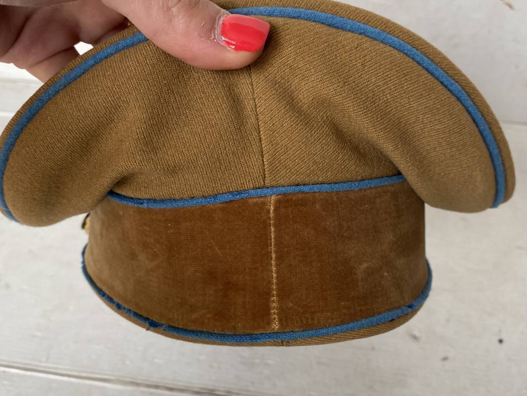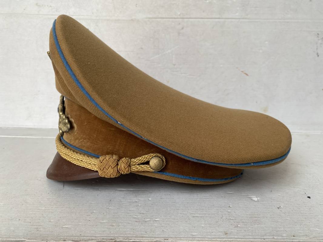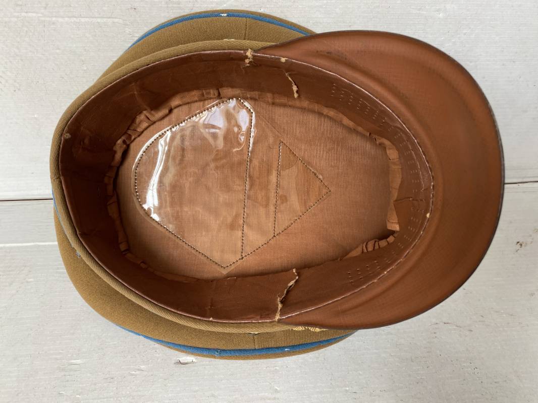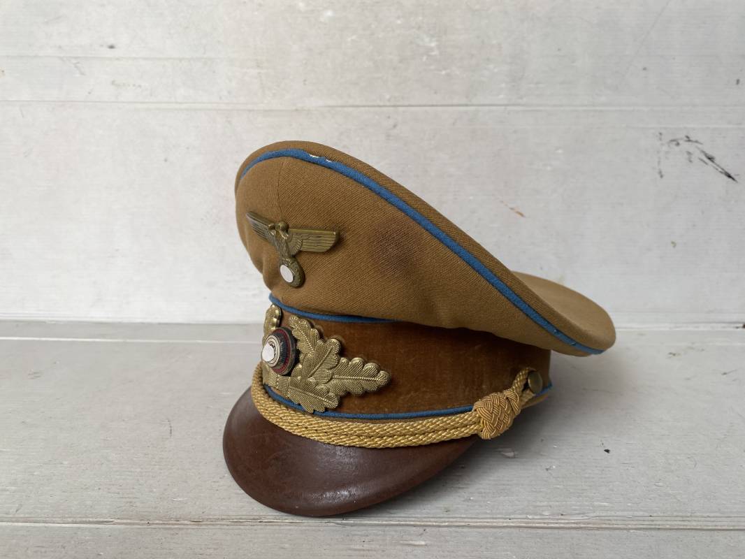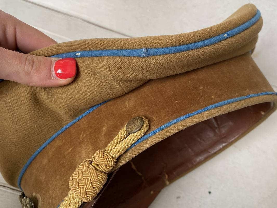 Très belle casquette modèle 1939 d'un Directeur Politique du NSDAP. 'Politische Leiter'. Casquette en gabardine brune. Liseré bleu clair des Orstgruppen. Insignes métalliques dorés aigle et cocarde. Insigne émaillé du NSDAP. Bandeau de coiffe en velours brun. Jugulaire torsadée dorée. Visière en fibre vulcanisée marron. Revers quadrillé brun. Intérieur de la coiffe doublé en coton marron. Rhodoid sans marquage. Bandeau de coiffe en carton/cuir brun (alkor). Deux déchirures sur bandeau (voir photo). Etiquette RZM avec code fabricant ( hersteller 104 ) sous bandeau . Casquette légèrement portée en parfait état. Belle forme haute. Taille 56 1939/45. Ref 16489