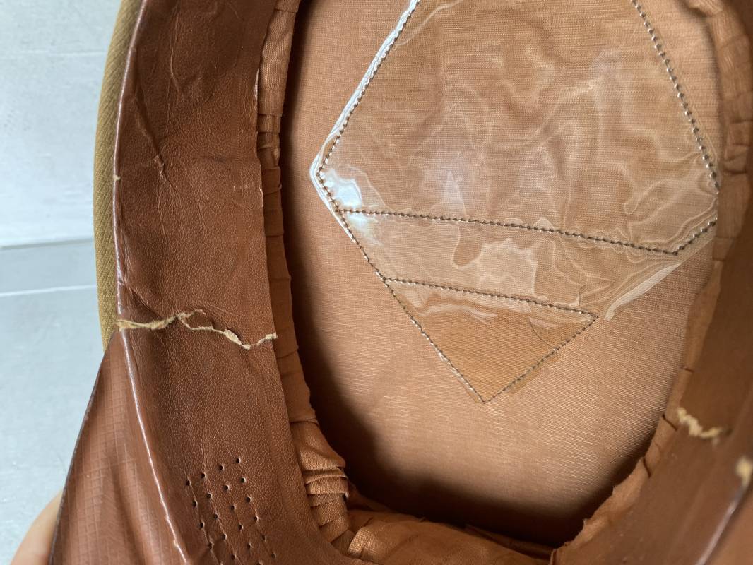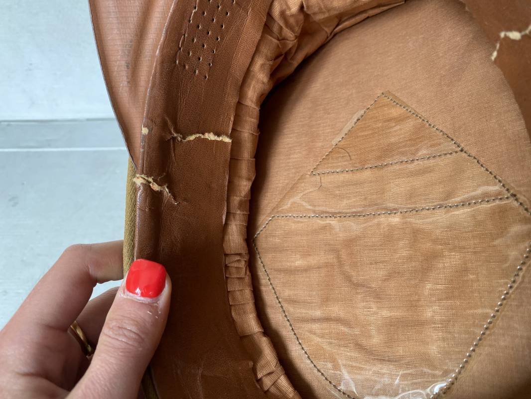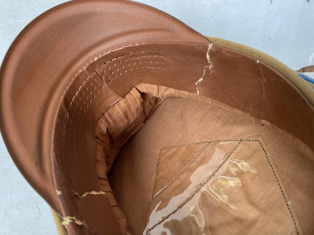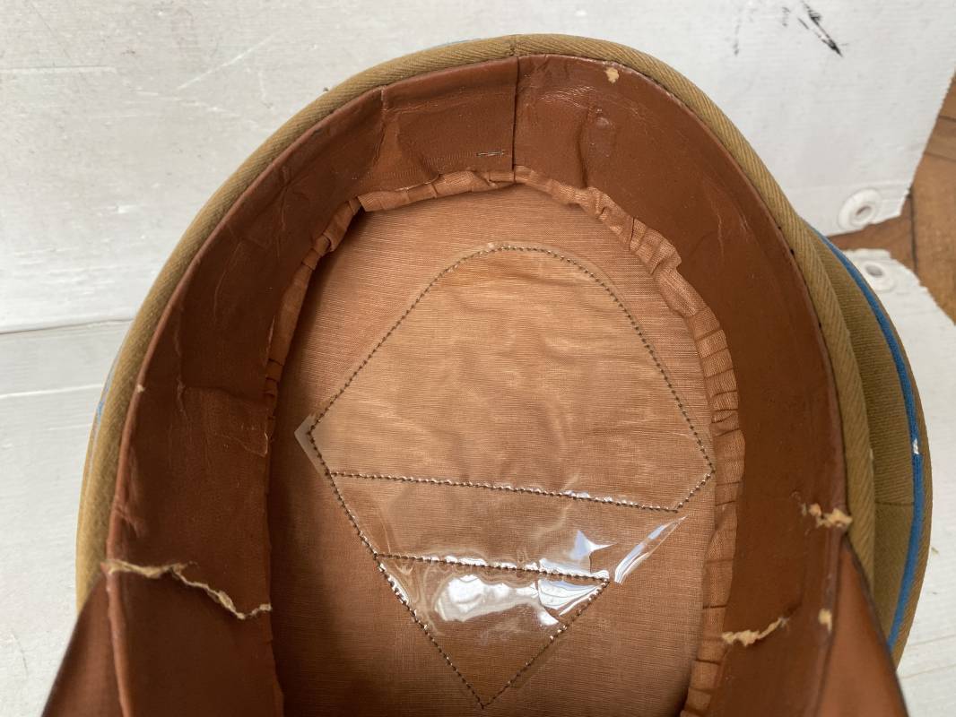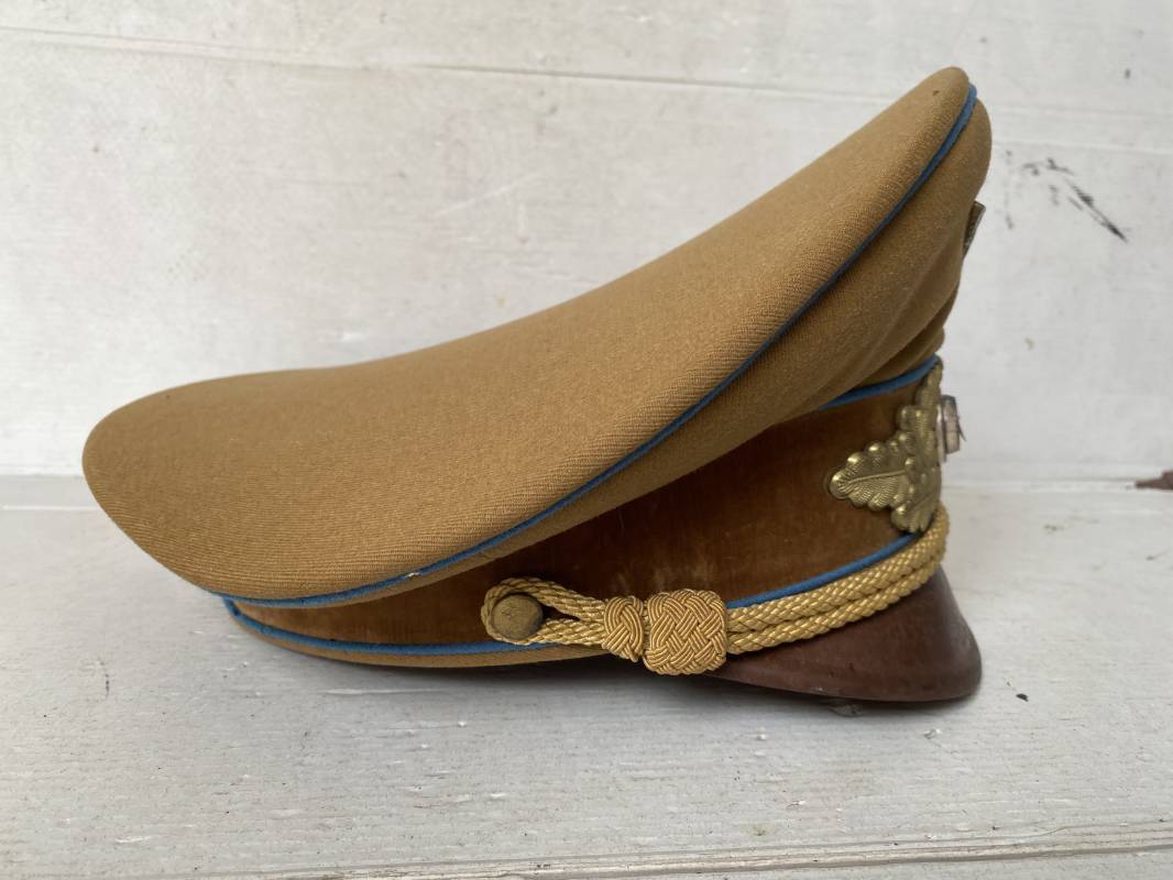 Très belle casquette modèle 1939 d'un Directeur Politique du NSDAP. 'Politische Leiter'. Casquette en gabardine brune. Liseré bleu clair des Orstgruppen. Insignes métalliques dorés aigle et cocarde. Insigne émaillé du NSDAP. Bandeau de coiffe en velours brun. Jugulaire torsadée dorée. Visière en fibre vulcanisée marron. Revers quadrillé brun. Intérieur de la coiffe doublé en coton marron. Rhodoid sans marquage. Bandeau de coiffe en carton/cuir brun (alkor). Deux déchirures sur bandeau (voir photo). Etiquette RZM avec code fabricant ( hersteller 104 ) sous bandeau . Casquette légèrement portée en parfait état. Belle forme haute. Taille 56 1939/45. Ref 16489