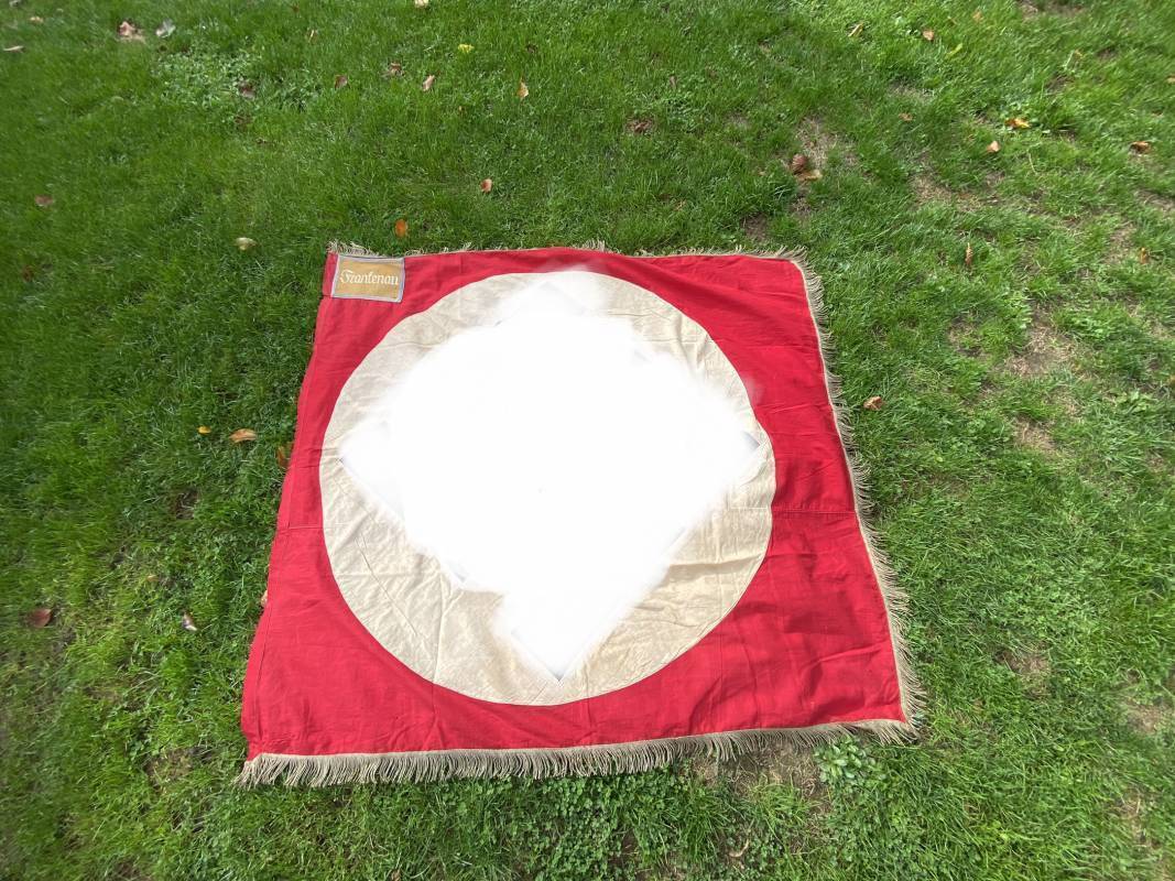 Rare drapeau de la ville de 'Frankenau' Orst Grupp. Drapeau du NSDAP à franges argent. Dimensions 125x135cm. Drapeau en coton imprimé rouge, rond et croix cousus. Double faces. Mention ' Frankenau' brodé sur rectangle de tissu marron clair avec galon bleu ciel d'un Orstgrupp. Drapeau utilisé en bon état.100 % dans son jus avec traces d'utilisation . Anneaux metalliques de fixation manquants et remplacés par des anneaux plastiques contemporains . ( voir photos ) Rare drapeau retrouvé en succession familiale dans le Nord de la France. Ce drapeau a été ramené d'Allemagne par un vétéran de la 1ére Armée francaise en 1945.Pièce historique 1935/45. Ref 16225
