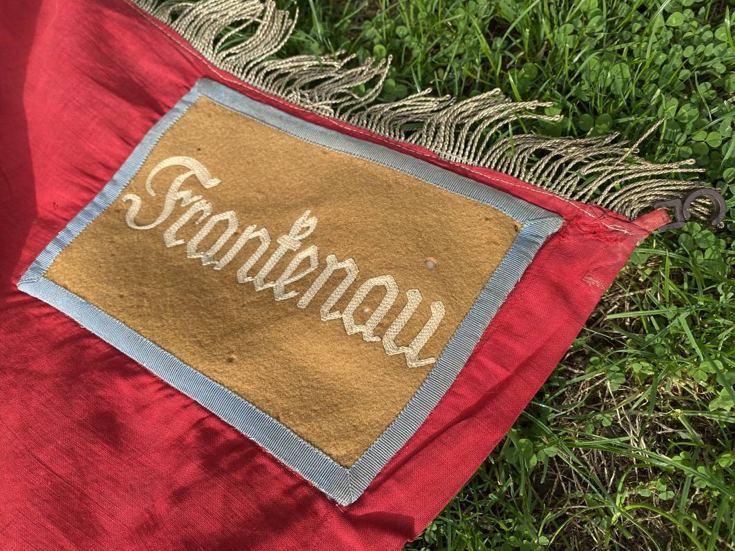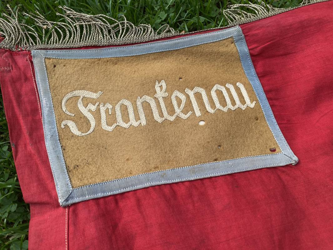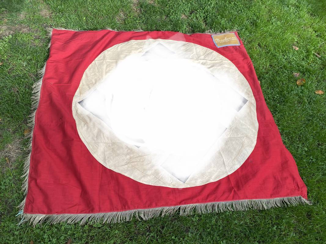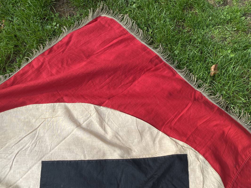 Rare drapeau de la ville de 'Frankenau' Orst Grupp. Drapeau du NSDAP à franges argent. Dimensions 125x135cm. Drapeau en coton imprimé rouge, rond et croix cousus. Double faces. Mention ' Frankenau' brodé sur rectangle de tissu marron clair avec galon bleu ciel d'un Orstgrupp. Drapeau utilisé en bon état.100 % dans son jus avec traces d'utilisation . Anneaux metalliques de fixation manquants et remplacés par des anneaux plastiques contemporains . ( voir photos ) Rare drapeau retrouvé en succession familiale dans le Nord de la France. Ce drapeau a été ramené d'Allemagne par un vétéran de la 1ére Armée francaise en 1945.Pièce historique 1935/45. Ref 16225