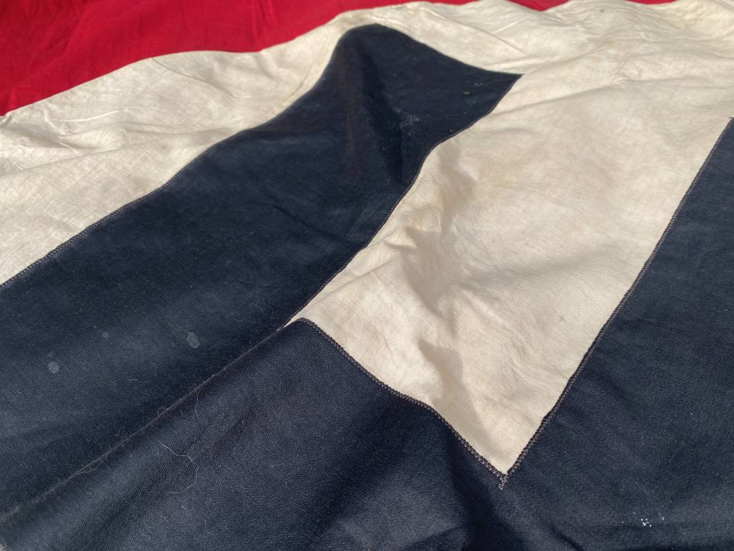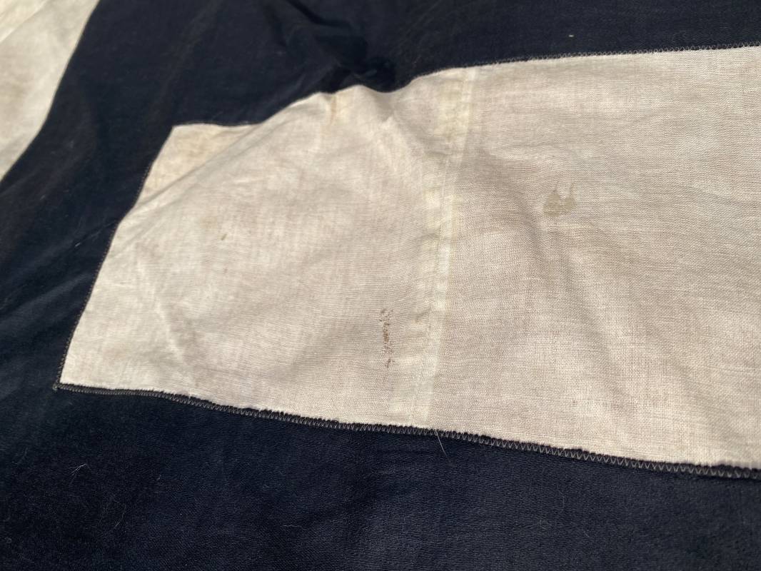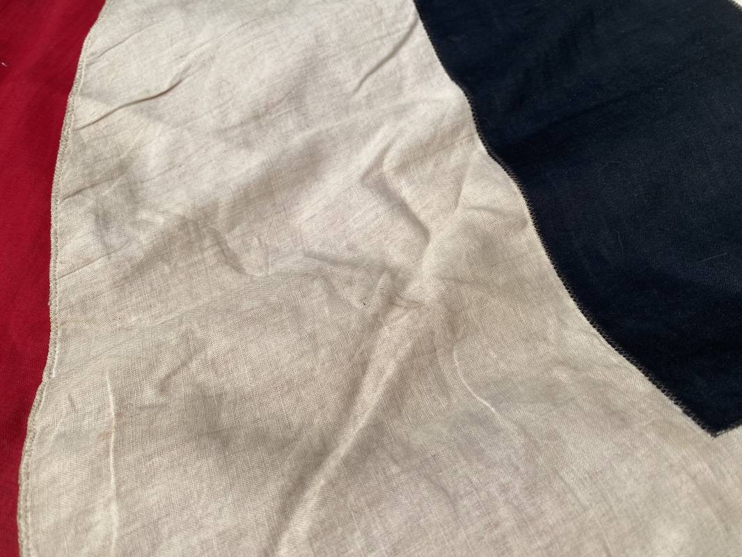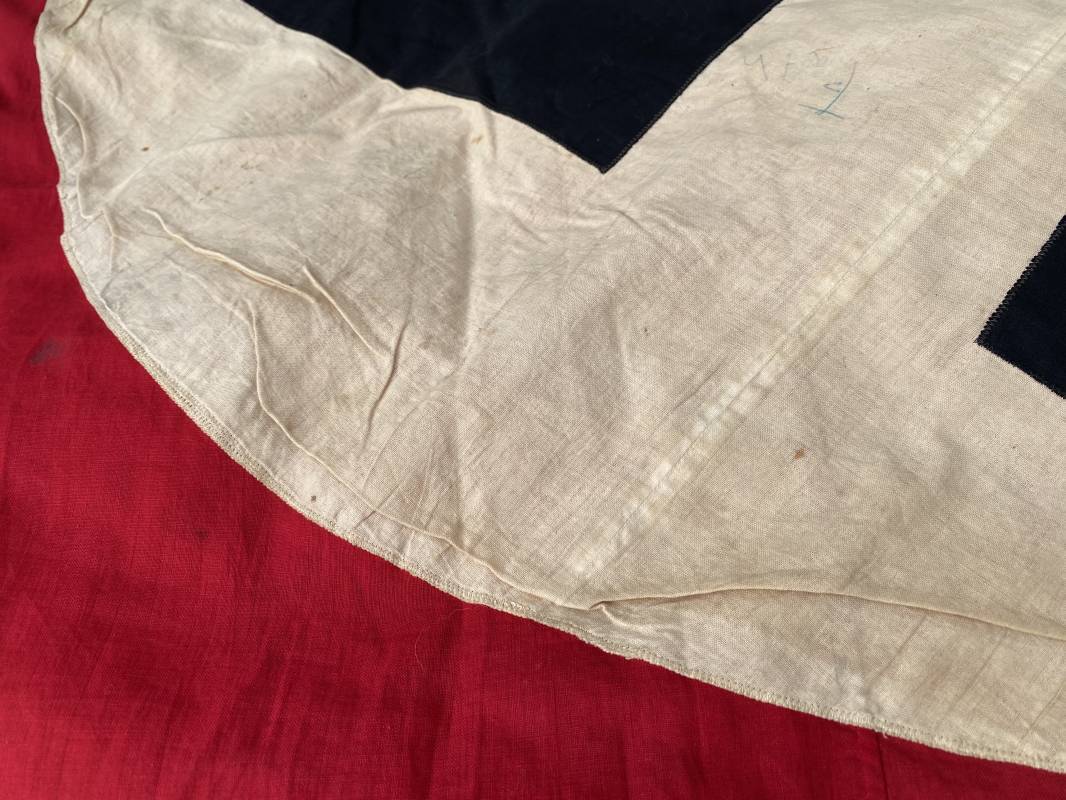 Rare drapeau de la ville de 'Frankenau' Orst Grupp. Drapeau du NSDAP à franges argent. Dimensions 125x135cm. Drapeau en coton imprimé rouge, rond et croix cousus. Double faces. Mention ' Frankenau' brodé sur rectangle de tissu marron clair avec galon bleu ciel d'un Orstgrupp. Drapeau utilisé en bon état.100 % dans son jus avec traces d'utilisation . Anneaux metalliques de fixation manquants et remplacés par des anneaux plastiques contemporains . ( voir photos ) Rare drapeau retrouvé en succession familiale dans le Nord de la France. Ce drapeau a été ramené d'Allemagne par un vétéran de la 1ére Armée francaise en 1945.Pièce historique 1935/45. Ref 16225