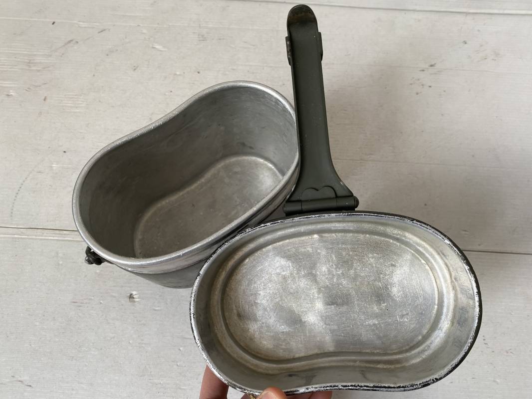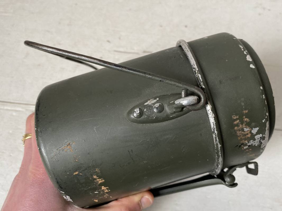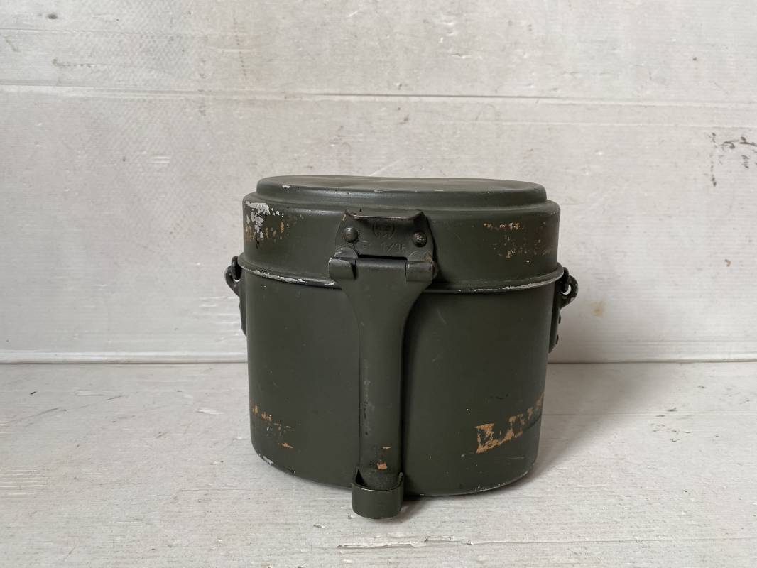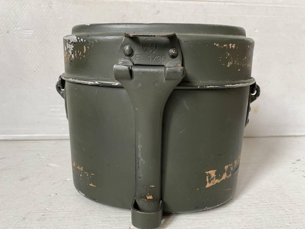 Gamelle individuelle modèle 1931 en alu du NSDAP ( SA, HJ , NSKK , PL .... ) . Peinture verte qui semble recouvrir une peinture noire d'usinage. Marquage RZM FA 1/36. Poignée et rabat en fer. Légèrement utilisé en parfait état 1935/45. Ref 14297