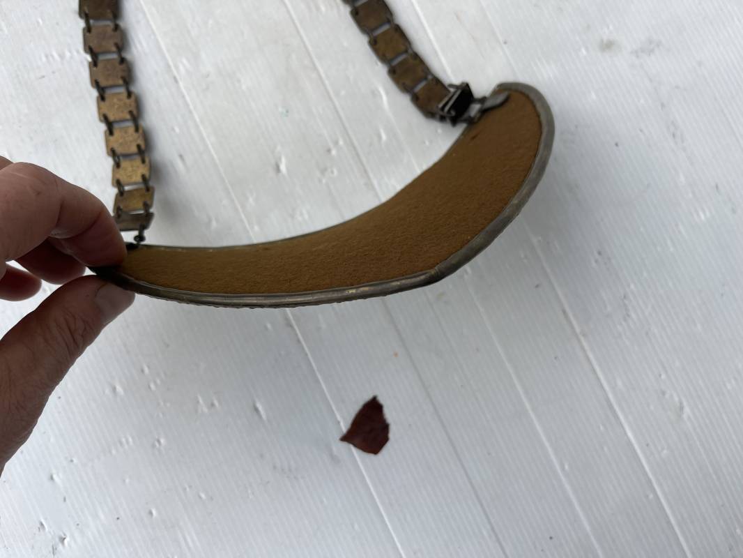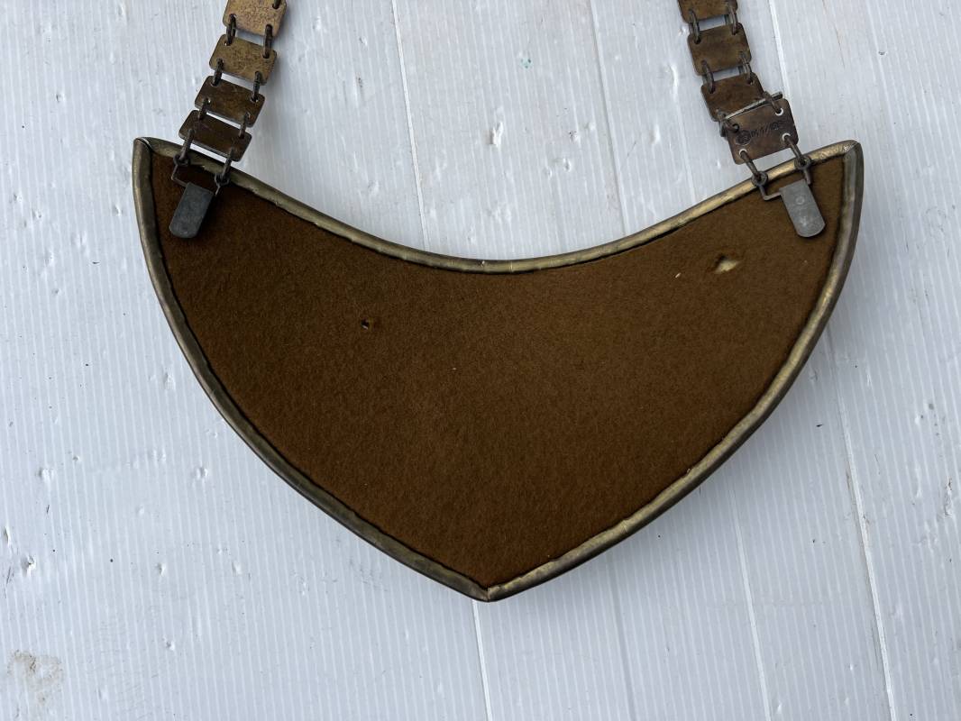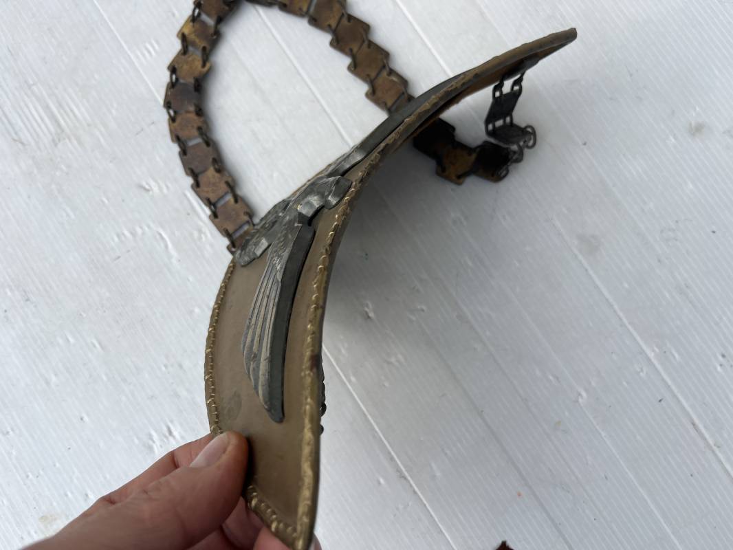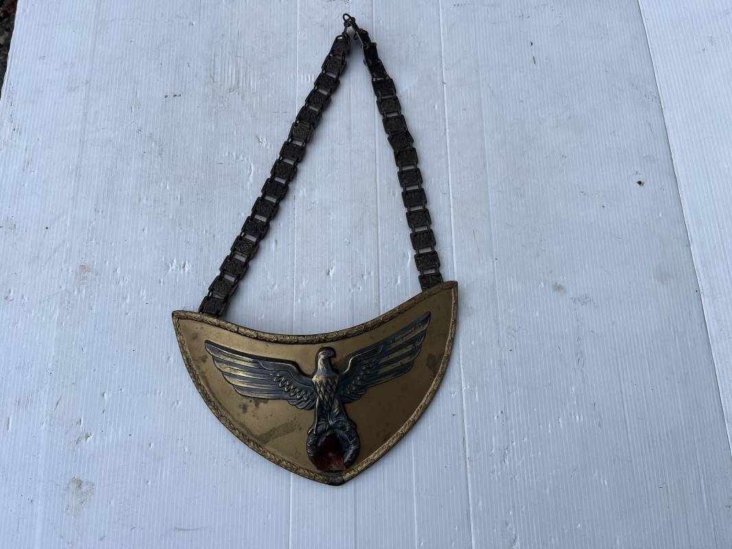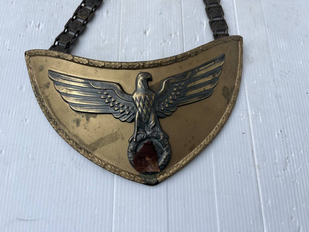 Rare Hausse col Porte drapeau d un Directeur Politique Politische Leiter du NSDAP . Hausse col en métal doré avec aigle du NSDAP en son centre , contour avec motifs reliefs a feuilles de chène Revers en drap marron Deux crochets metallique de fixation . Chainette de dotation a maillons et motifs aigle et croix , marquage fabricant RZM M1/128 . Trés belle hausse col legerement portée en parfait état 1935/45 Ref 21203