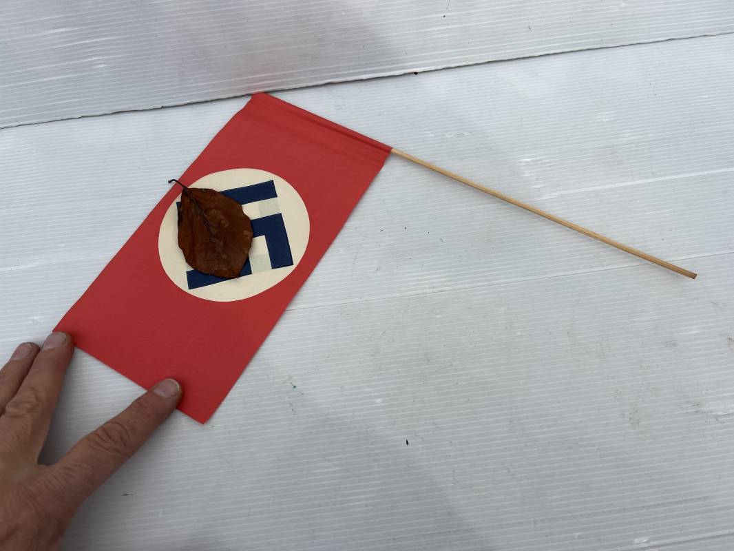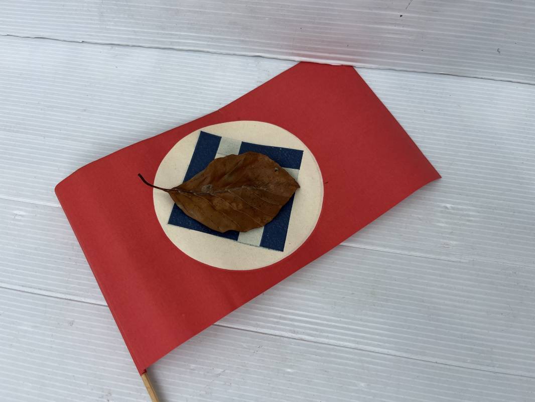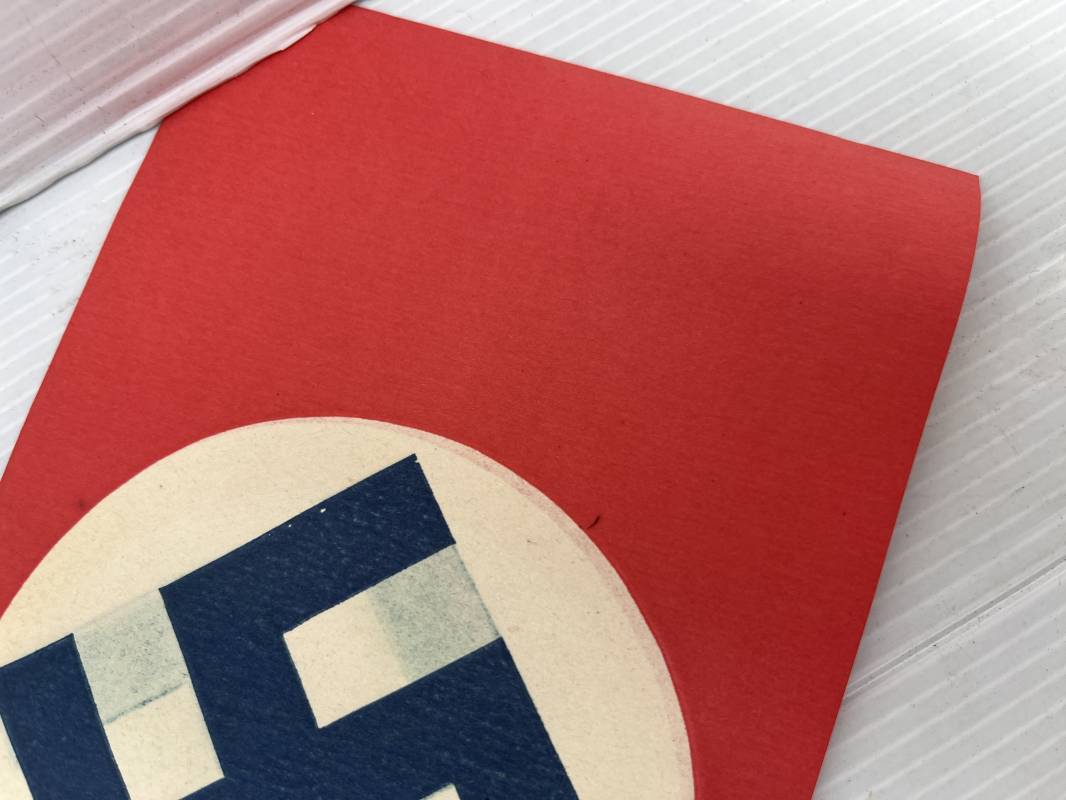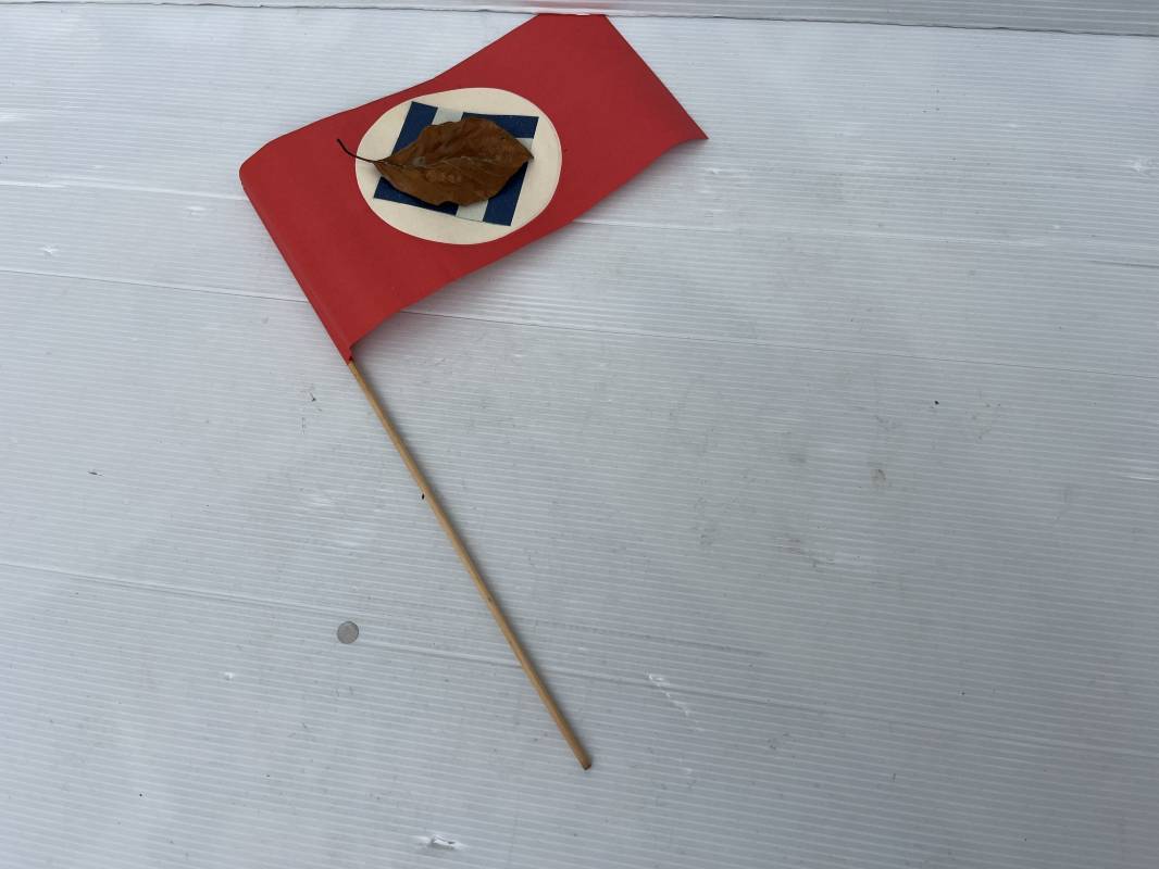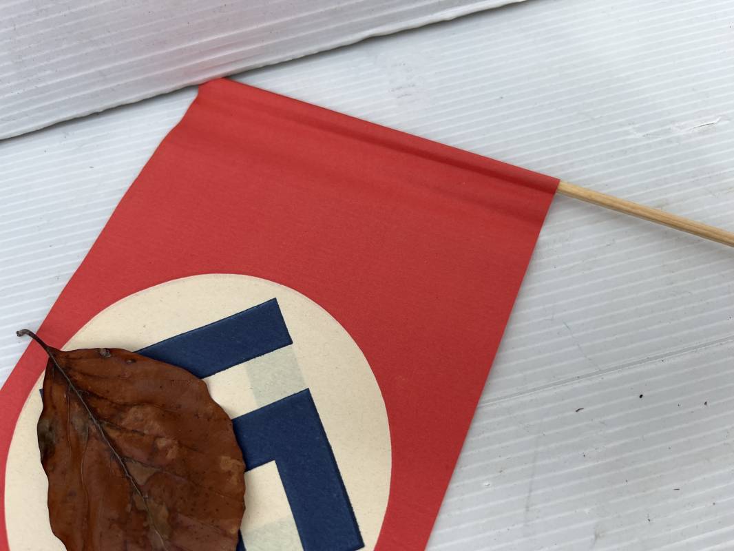 Petit drapeau de propagande du NSDAP . Drapeau en papier double faces dimensions 225X120 mm manche bois longueur 35 cm . Superbe état . Drapeau distribué a la population civile pour les défilé ou manifestation du parti .Drapeau trouvé dans un déballage en allemagne ( Dortmund ) 1933/45 Ref 22127