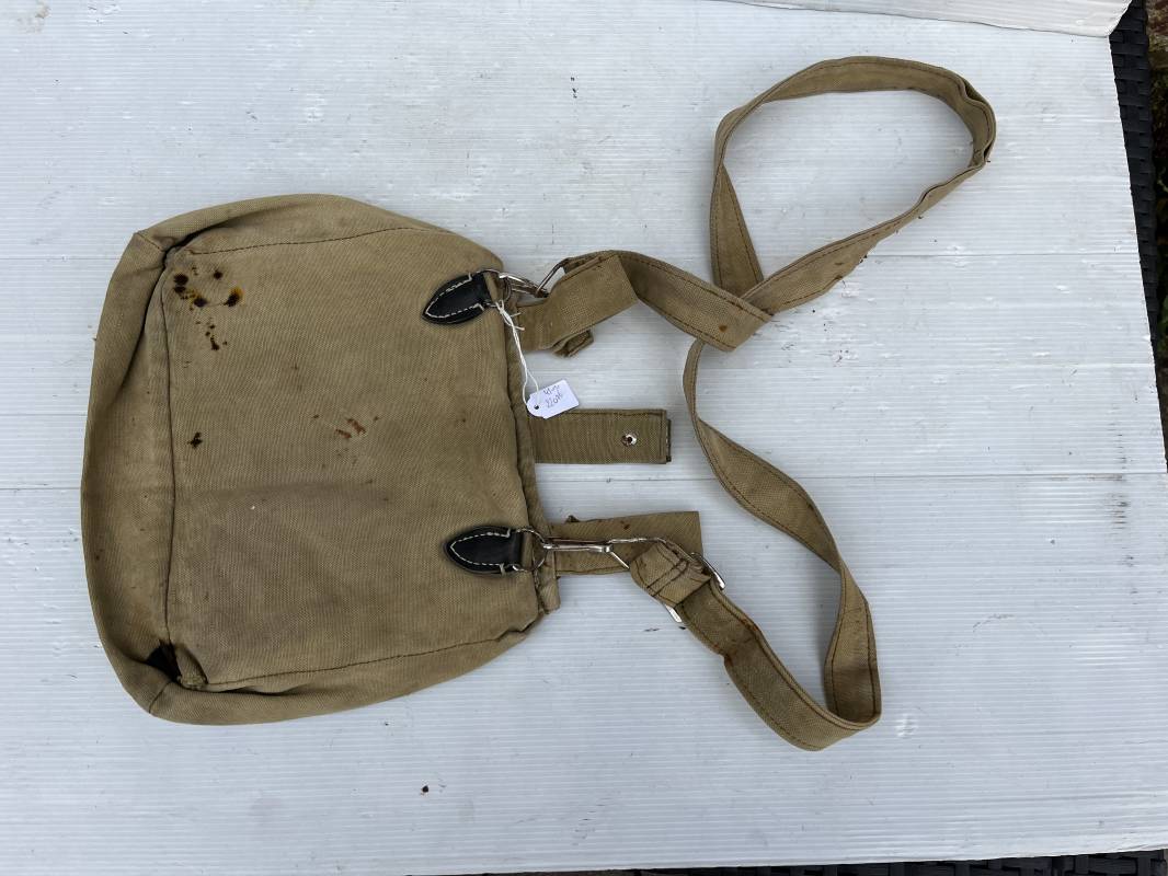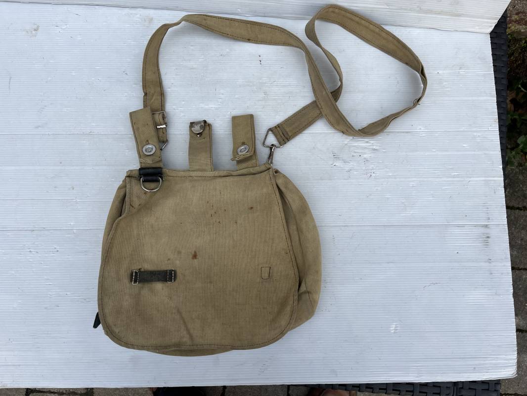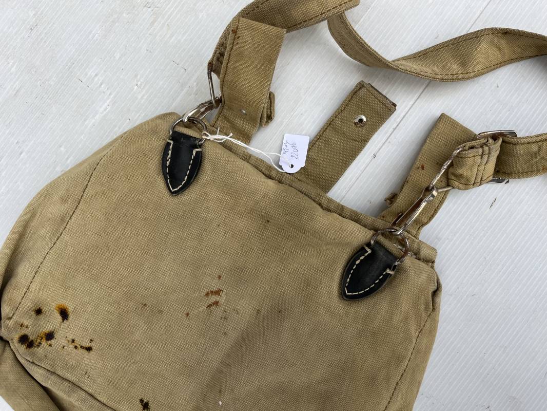Sac a pain ( brotbeutel ) et sa bretelle pour membre du parti NSDAP ( SA, HJ , NSKK, PL ... ) . Sac en toile de couleur brune . Passants tissu pour ceinturon . Boutons alu , anneau en fer , bretelles avec crochets et boucles métalliques en fer nickelé . Porté en bon état 1935/45 Ref 21744