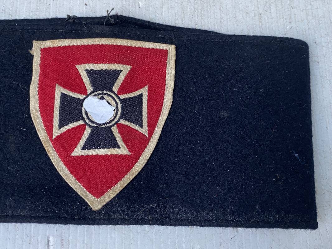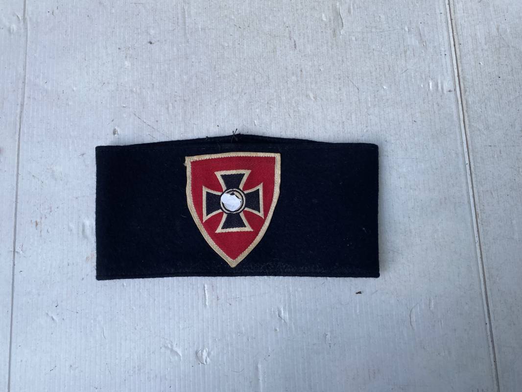 Brassard d'association ancien combattant allemand ( N.S ReichsKriegerbund) . Brassard en drap noir . Insigne écu en coton tissé bevo . Fond rouge et croix de malte . Dimensions a plat 183X85 mm . Lègèrement porté en bel état 1935/45 Ref 18734