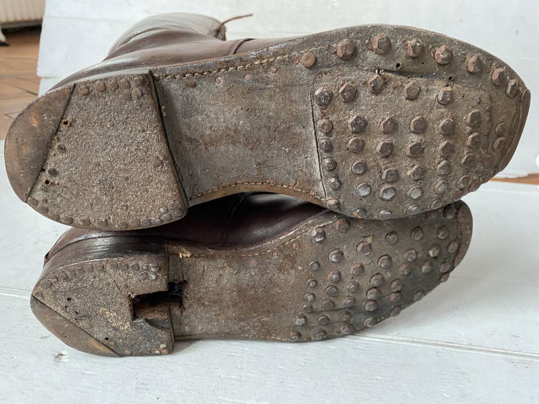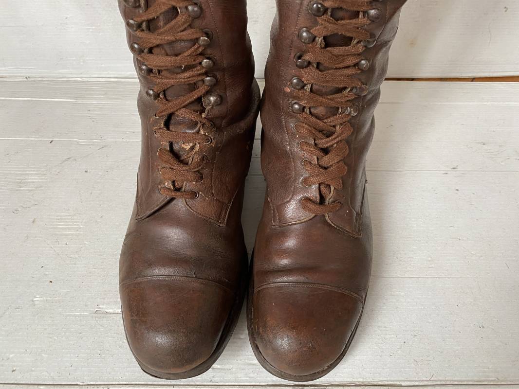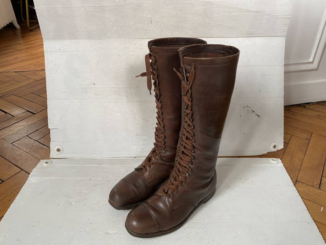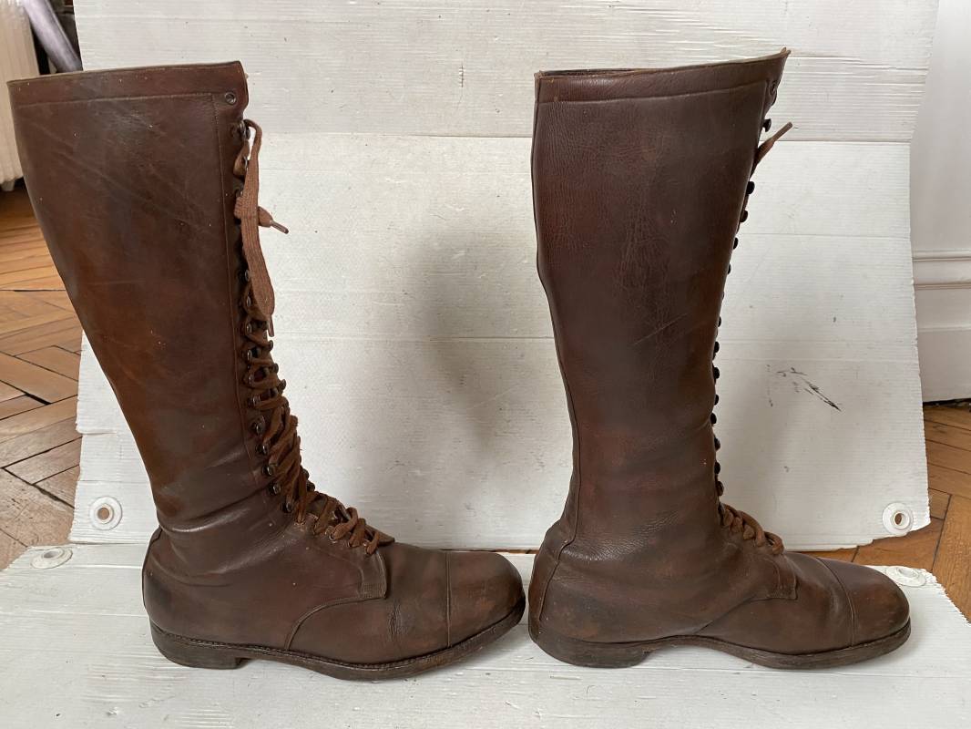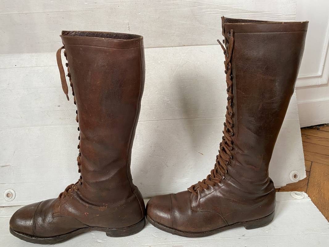 Belle paire de bottes cloutées à lacets d'un officier. Bottes du type "colonial" ou "aviateur" avec crochets et oeillets métalliques. Lacets en coton marron. Hauteur 40cm. Semelles et talons en cuir, cloutage d'origine. Longueur semelles 29,5cm. Pointure 43 environ. A noté : un trou dans semelle pour support d'un mannequin. Cuir souple, bottes légèrement portées en bel état 1915/40. Ref 15488