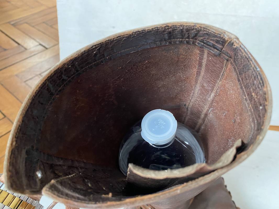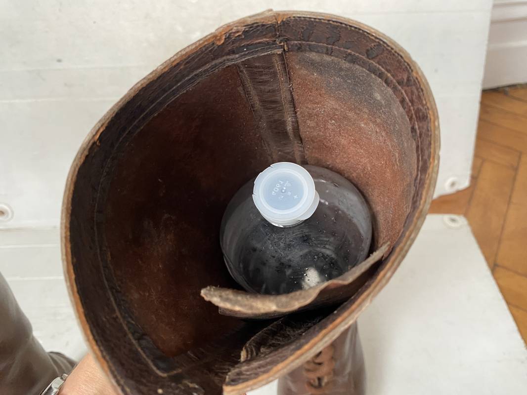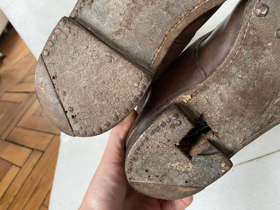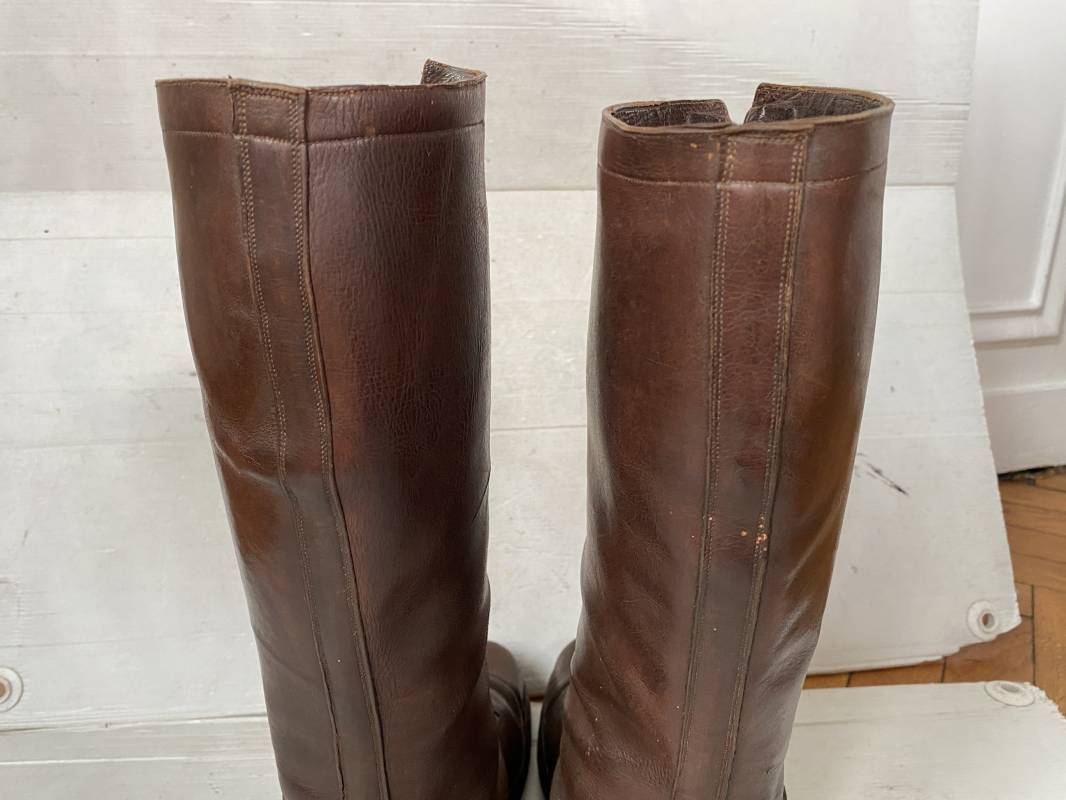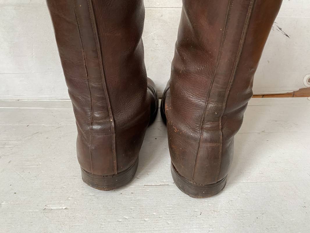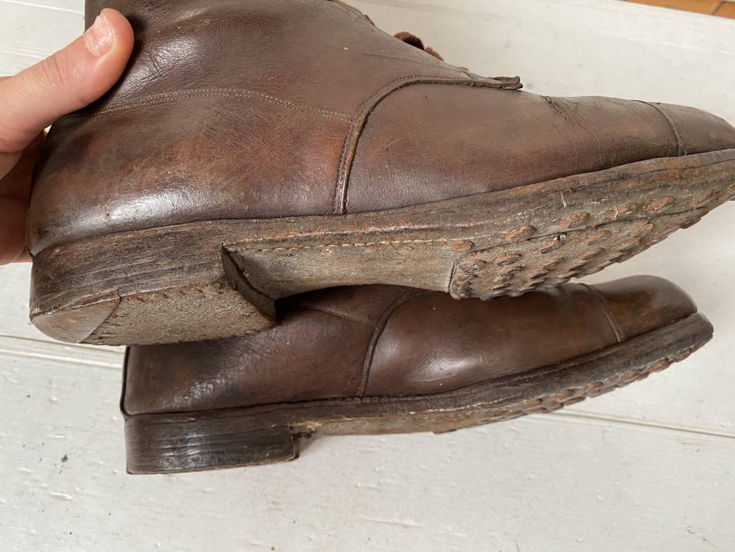 Belle paire de bottes cloutées à lacets d'un officier. Bottes du type "colonial" ou "aviateur" avec crochets et oeillets métalliques. Lacets en coton marron. Hauteur 40cm. Semelles et talons en cuir, cloutage d'origine. Longueur semelles 29,5cm. Pointure 43 environ. A noté : un trou dans semelle pour support d'un mannequin. Cuir souple, bottes légèrement portées en bel état 1915/40. Ref 15488