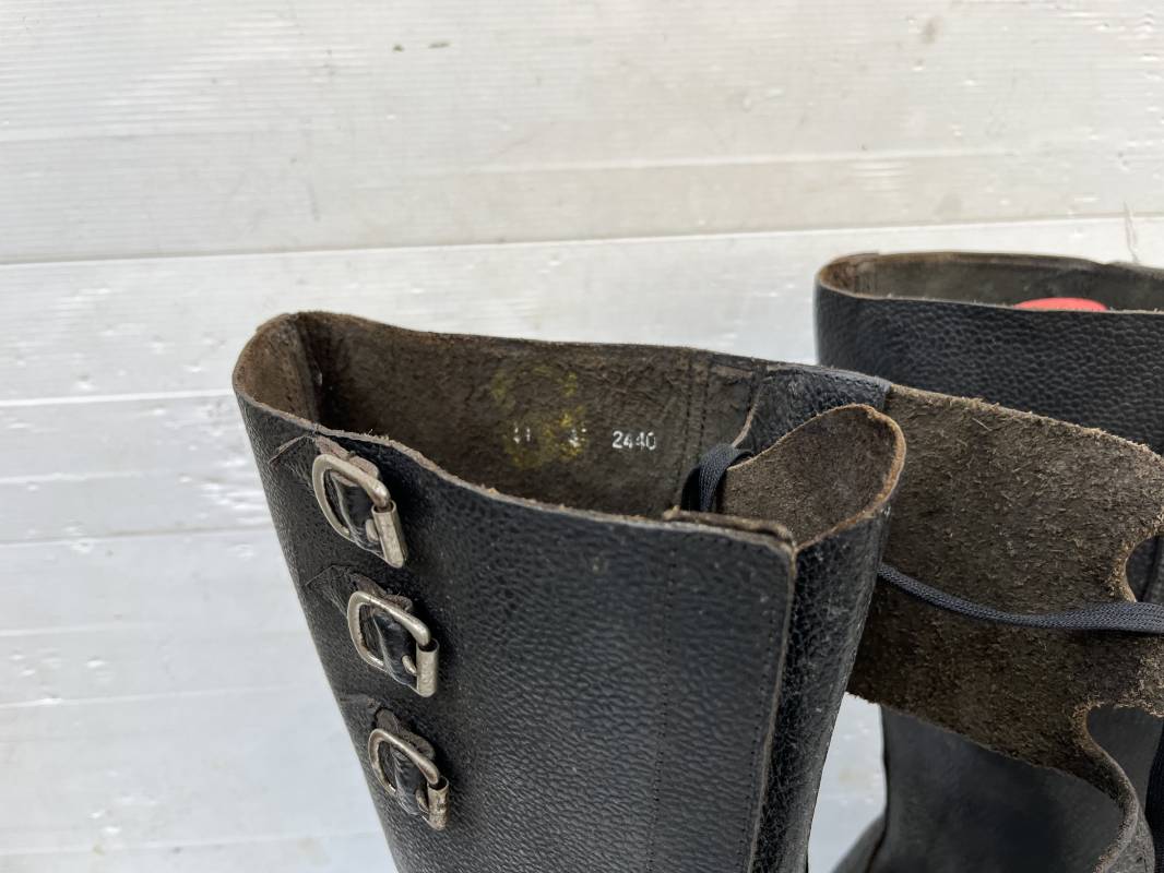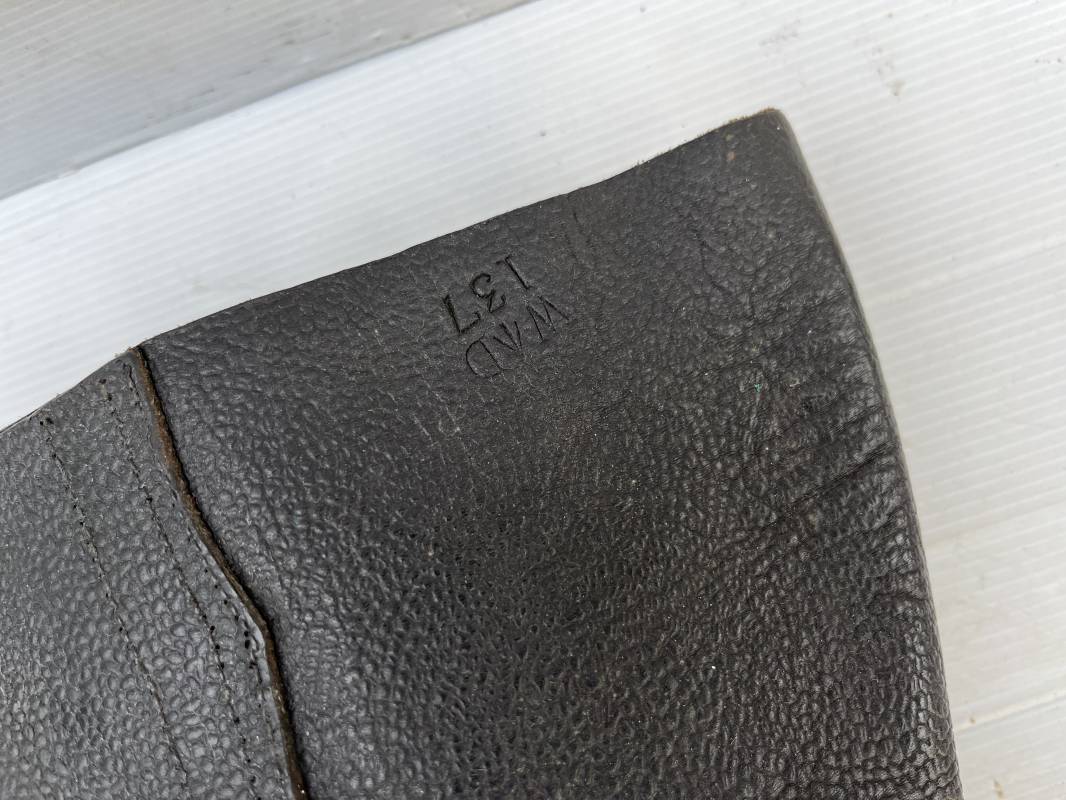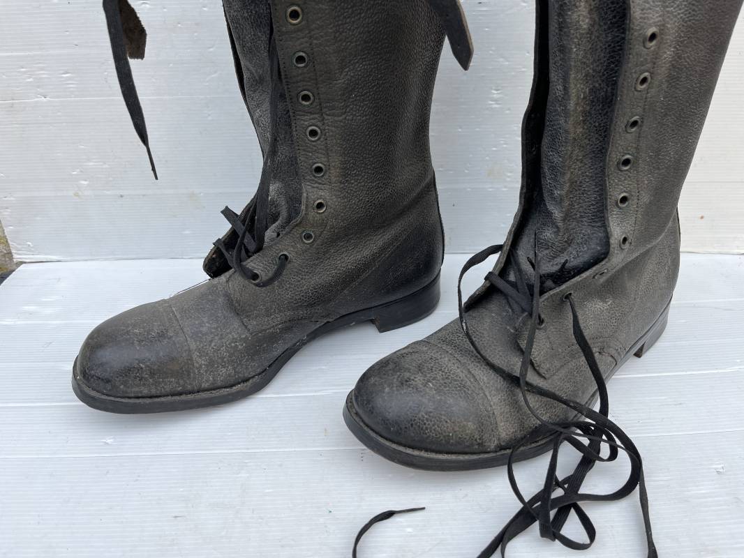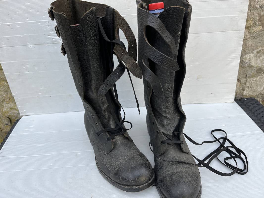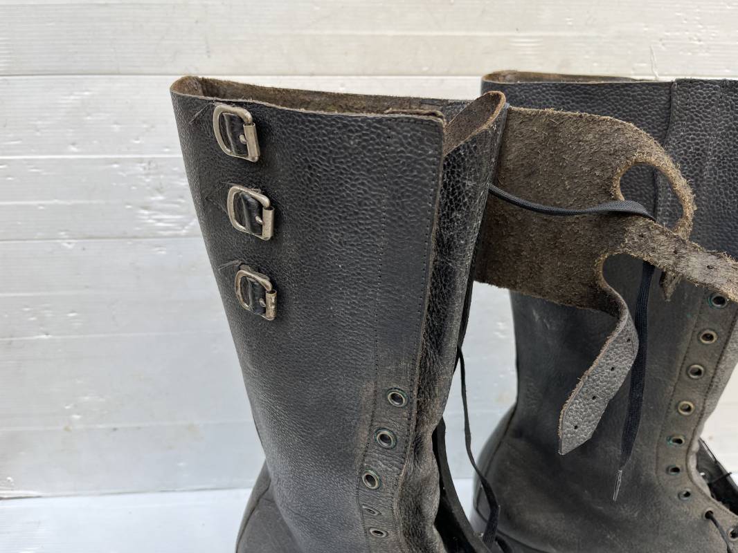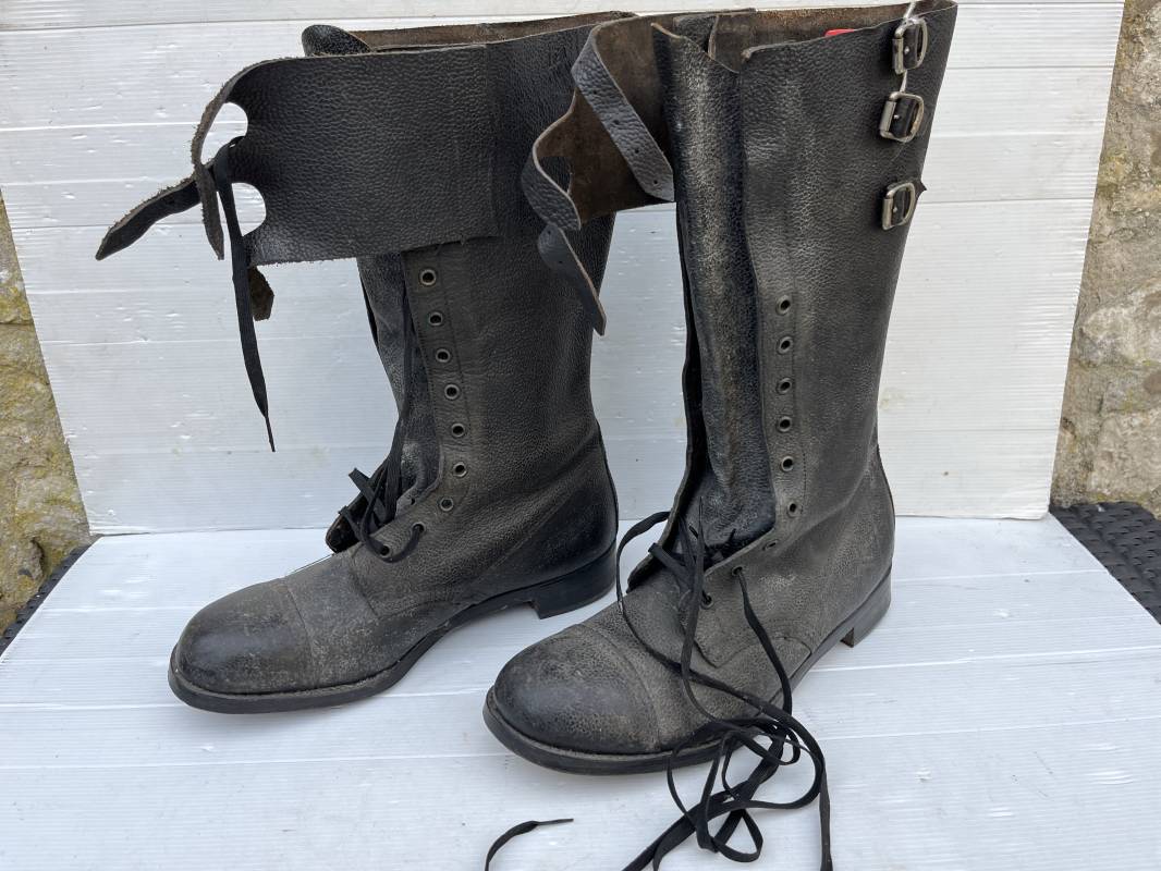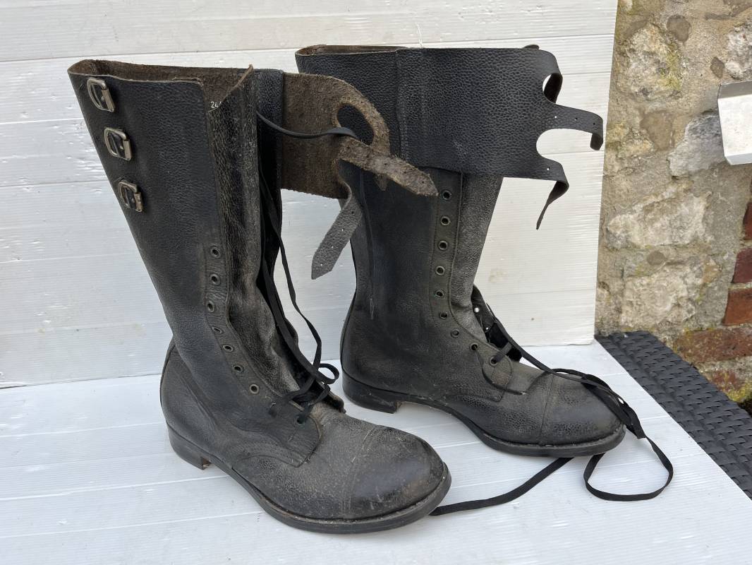 Trés belle paire de bottes des troupeS motorisées en cuir grenelé noir . Cette paire a été trouvée dans la région de Caen ( 14) . Paire de bottes de dotation pour motard . Oeillets métalliques et lacets en coton noir d origines . Trois pattes de fermetures en cuir sur les hauts de chaques tiges et boucles métalliques . Bouts en cuir renforcé . Semelles et talons d origines en cuir lisse avec cloutage arrasé . Talons avec fer en U . Semelle droite avec renfort métallique sous le patin . Marquages sous semelles 11 S ( taille 45 ) . Marquages a l interieur des semelles fabricant et daté 1943 . Hauteur bottes 39 cm , longueur semelle 31 cm . Cuir souple . Paire de bottes en superbe état . Aucun défaut . Définitif en collection Ref 21314