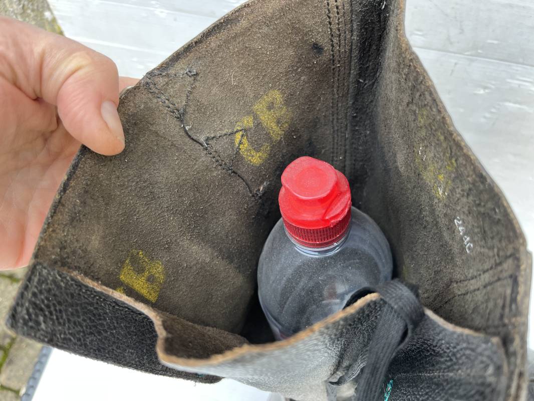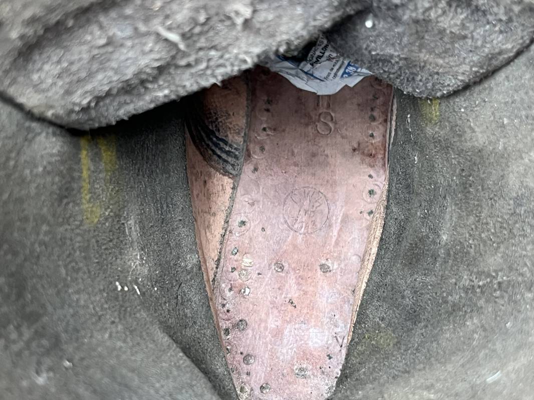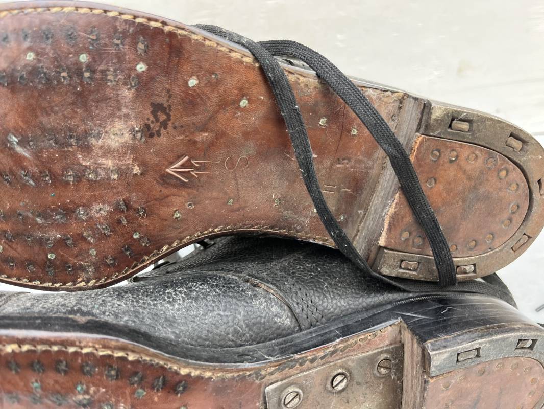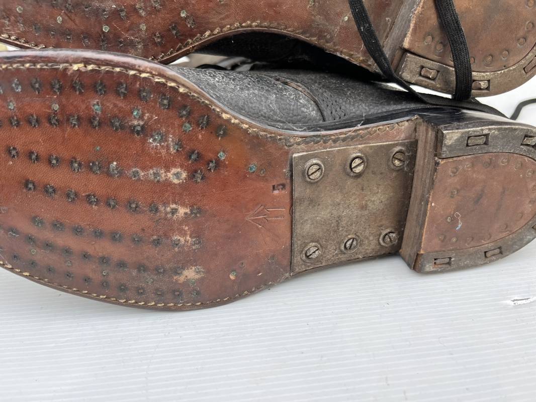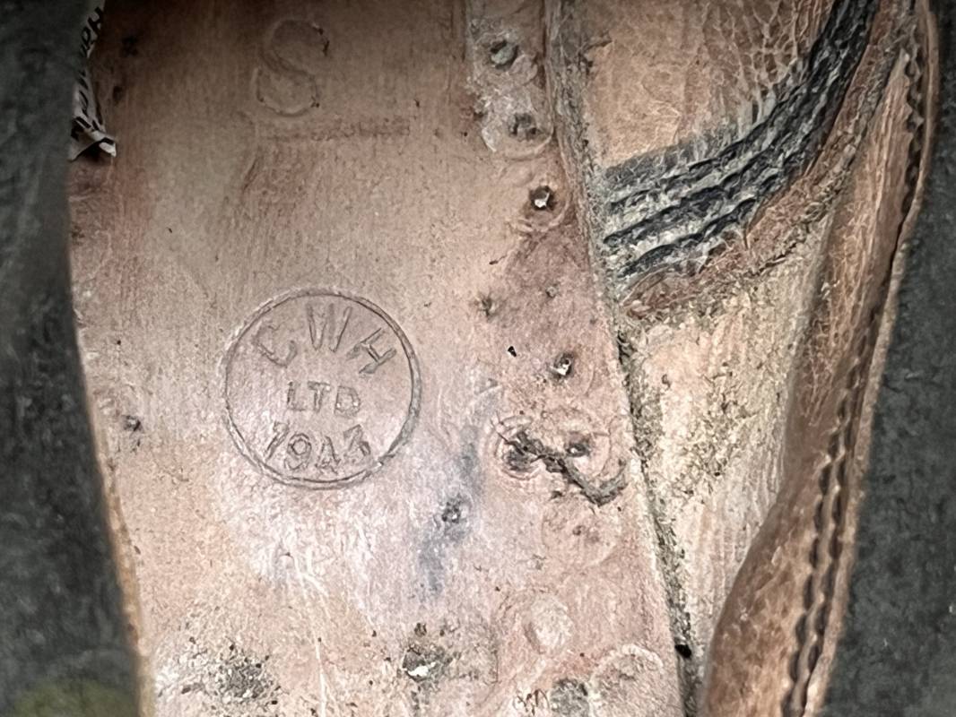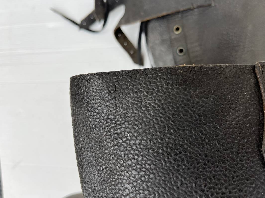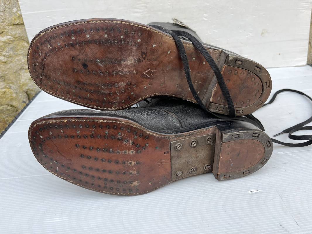 Trés belle paire de bottes des troupeS motorisées en cuir grenelé noir . Cette paire a été trouvée dans la région de Caen ( 14) . Paire de bottes de dotation pour motard . Oeillets métalliques et lacets en coton noir d origines . Trois pattes de fermetures en cuir sur les hauts de chaques tiges et boucles métalliques . Bouts en cuir renforcé . Semelles et talons d origines en cuir lisse avec cloutage arrasé . Talons avec fer en U . Semelle droite avec renfort métallique sous le patin . Marquages sous semelles 11 S ( taille 45 ) . Marquages a l interieur des semelles fabricant et daté 1943 . Hauteur bottes 39 cm , longueur semelle 31 cm . Cuir souple . Paire de bottes en superbe état . Aucun défaut . Définitif en collection Ref 21314