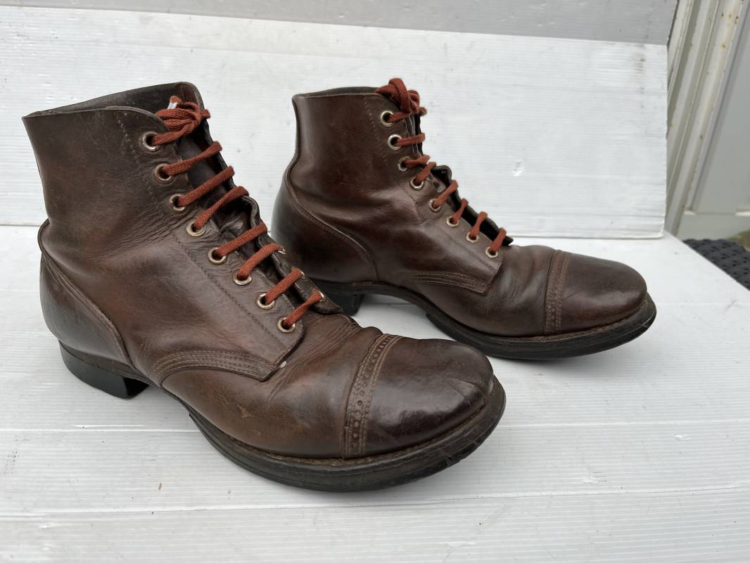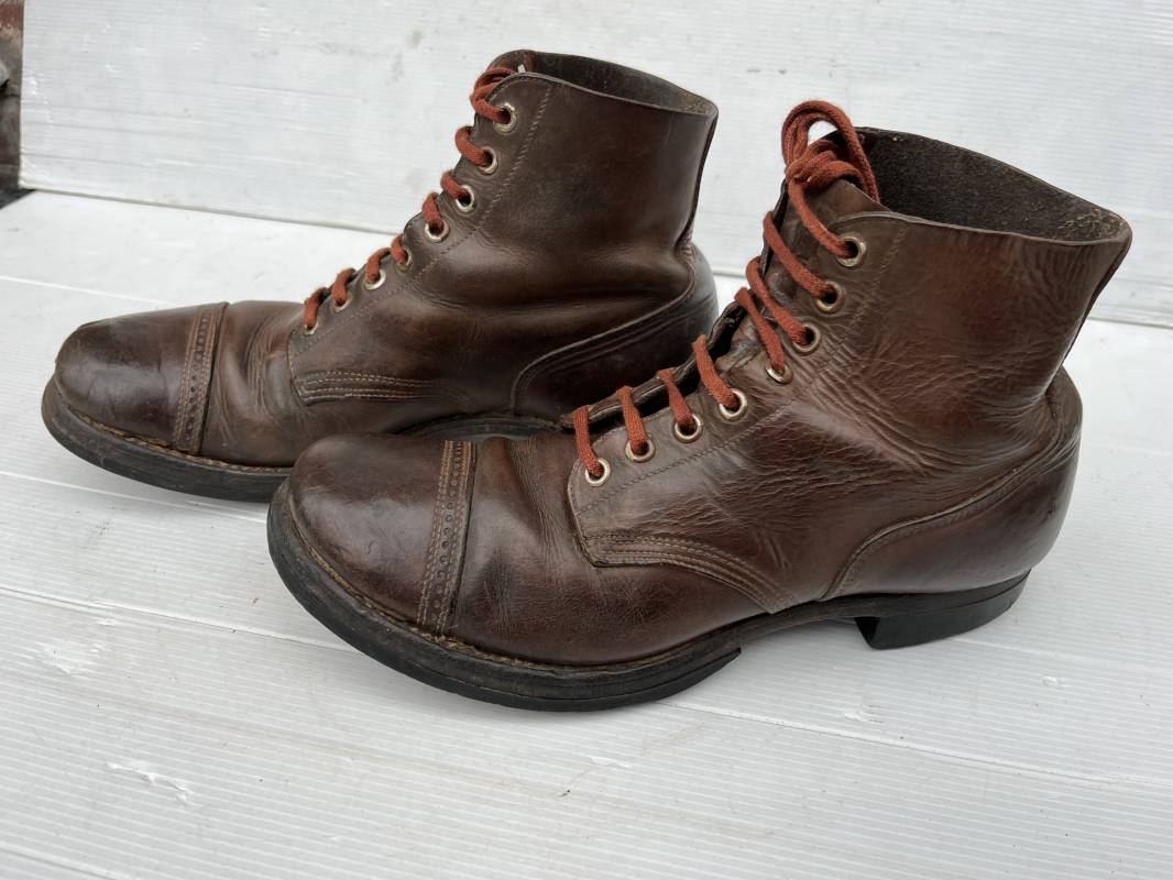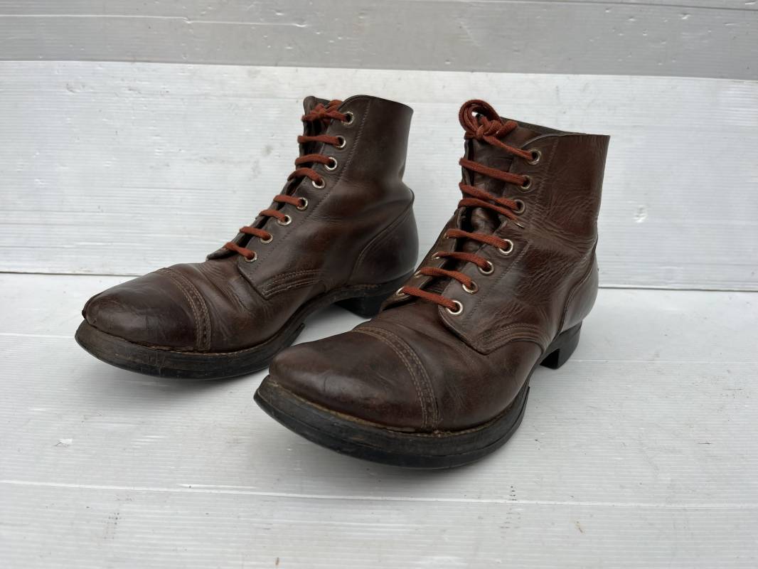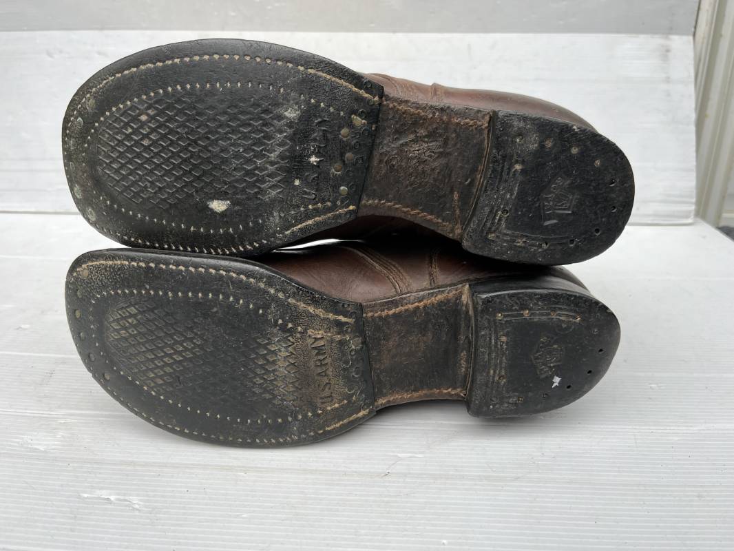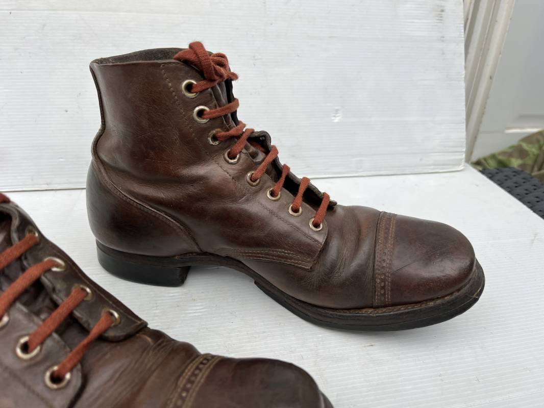 Rare paire de brodequins réglementaires américain , Shoes Service type II avec semelles cuir patins et talons caoutchouc . Paire de brodequins à cuir lisse de couleur brun rouge à bouts rapportés . Oeillets métalliques, lacets en coton marron . Marquages sur les semelles 8 1/2 E . Taille 42. Semelles et Patins , talons d'origines en caoutchouc noir. Marquage US Army et fabricant 'US Royal ', cuir souple. Légèrement porté en parfait état. Très belle paire de brodequins du GI de la Libération 1942/44. Ref 18043