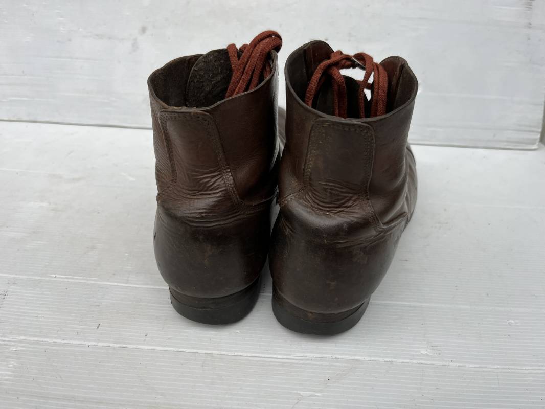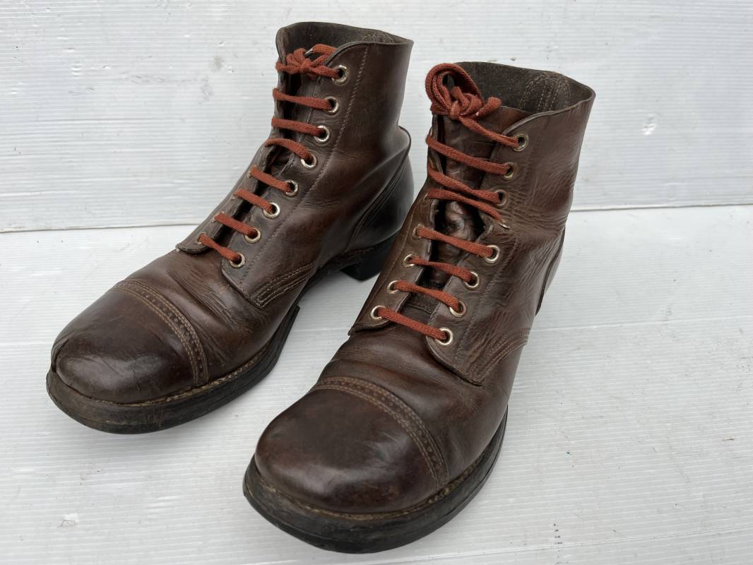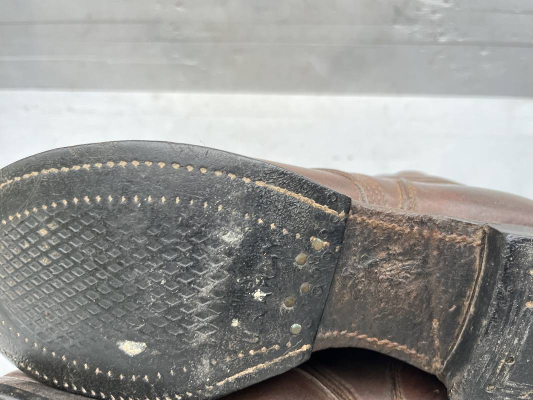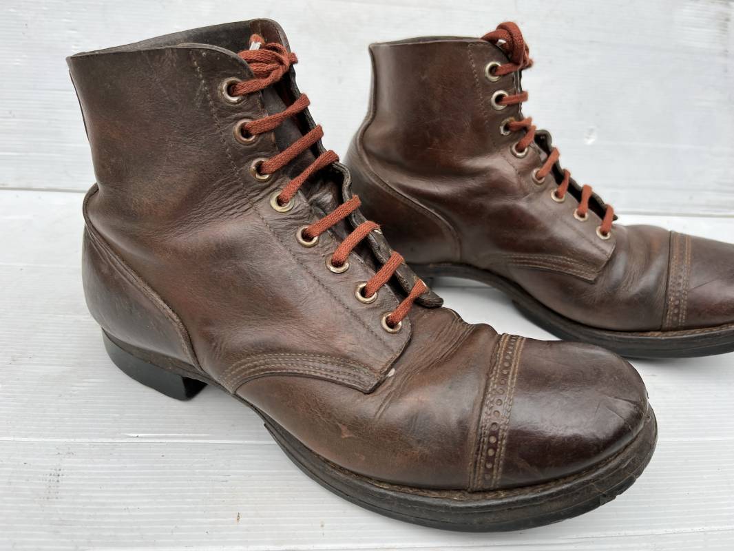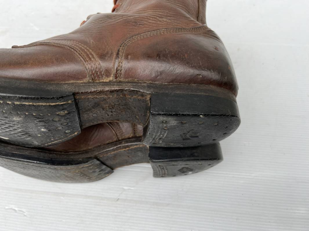 Rare paire de brodequins réglementaires américain , Shoes Service type II avec semelles cuir patins et talons caoutchouc . Paire de brodequins à cuir lisse de couleur brun rouge à bouts rapportés . Oeillets métalliques, lacets en coton marron . Marquages sur les semelles 8 1/2 E . Taille 42. Semelles et Patins , talons d'origines en caoutchouc noir. Marquage US Army et fabricant 'US Royal ', cuir souple. Légèrement porté en parfait état. Très belle paire de brodequins du GI de la Libération 1942/44. Ref 18043