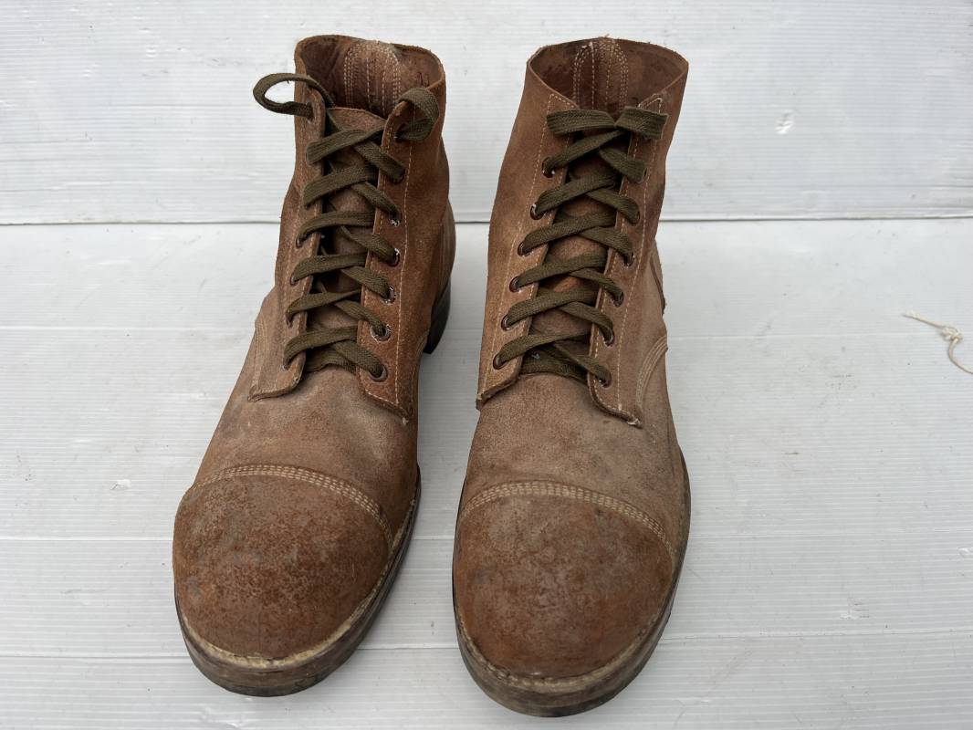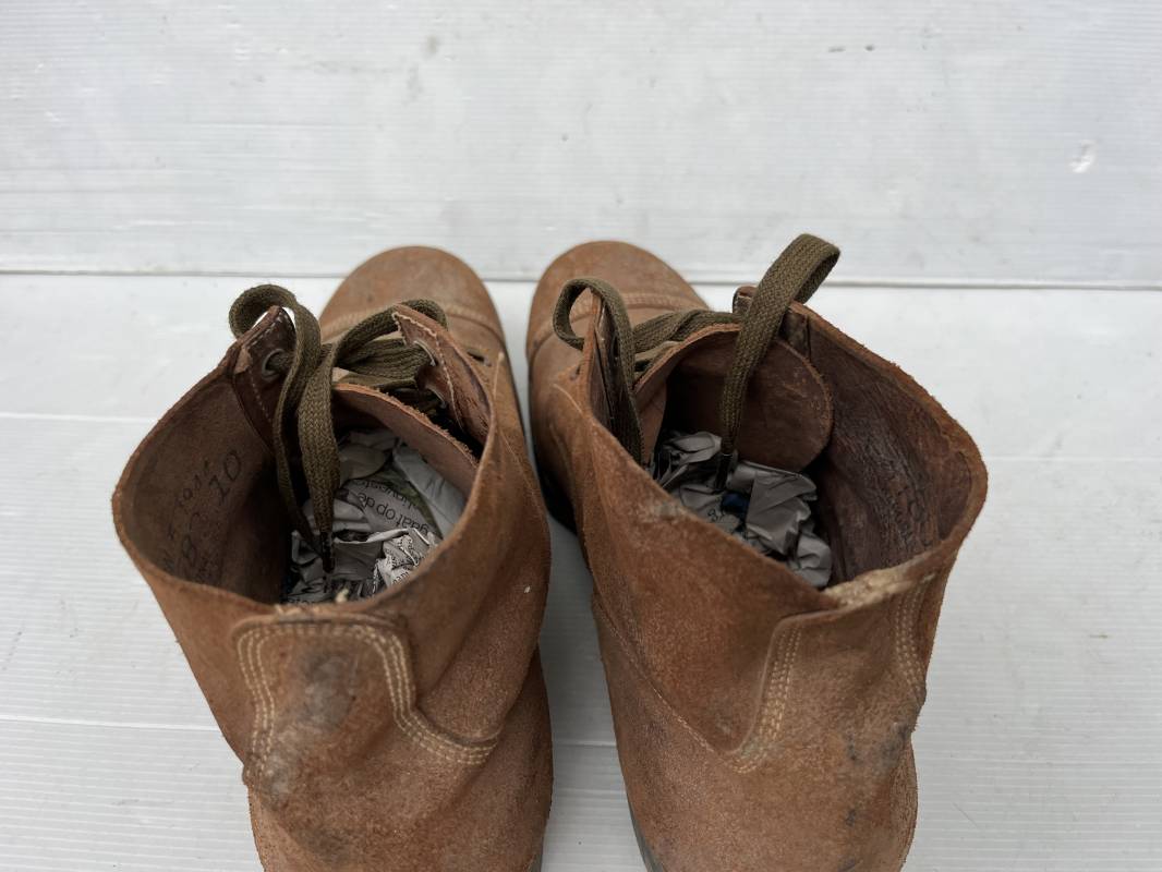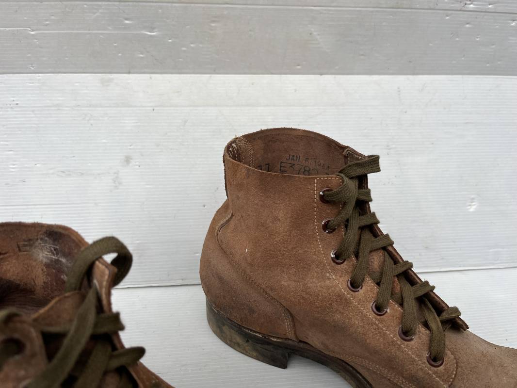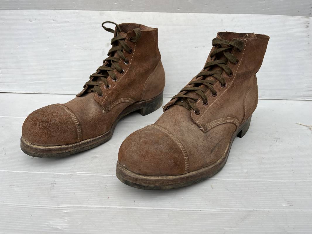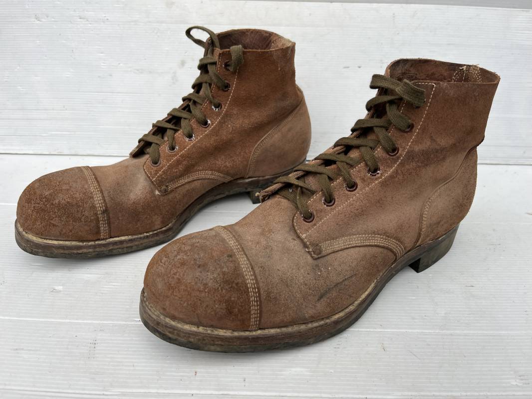 Rare paire de brodequins réglementaires 'Shoes Service type III'. Paire de brodequins en cuir retourné à bouts renforcés. Brodequins à oeillets métalliques marron. Lacets en coton marron. Marquage sur les tiges intèrieures 11 E GY, marquage encre fabricant 'International Shoes Inc 06 Janv 1944'. Cuir souple, taille 45. Renforts par rivets métalliques sur les empeignes. Talons et semelles en caoutchouc 'mono bloc'. Semelles cousues et cloutées. Marquage fabricant sur semelles Ligth Tread . Longueur semelle 32cm pointure 45. Hauteur brodequins 17cm. Légèrement porté en superbe état. Belle paire de brodequins du GI de la Libération 1942/44 Paire de chaussure sans aucun défaut ét définitive en collection Ref 19843