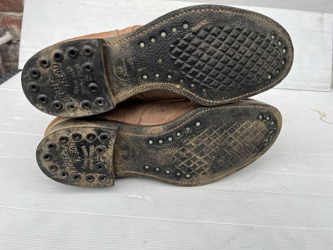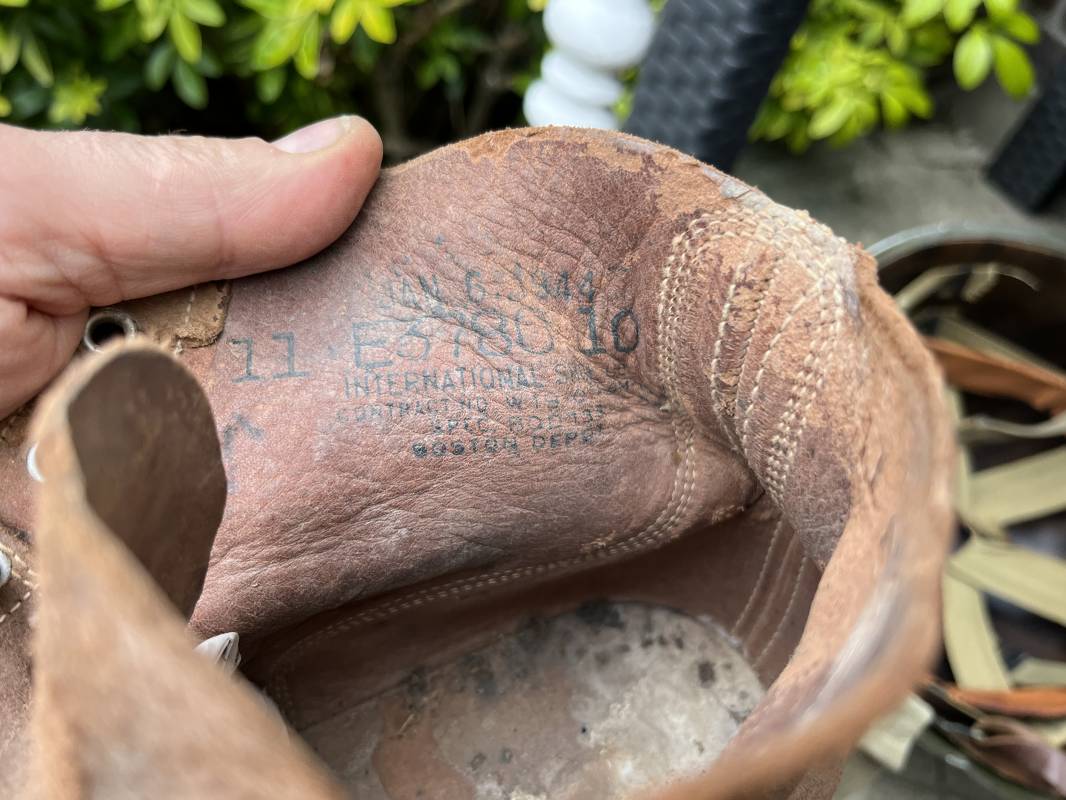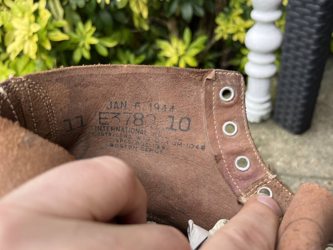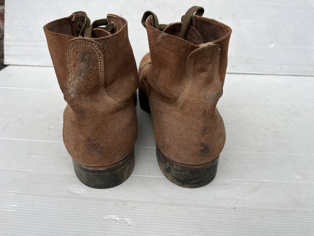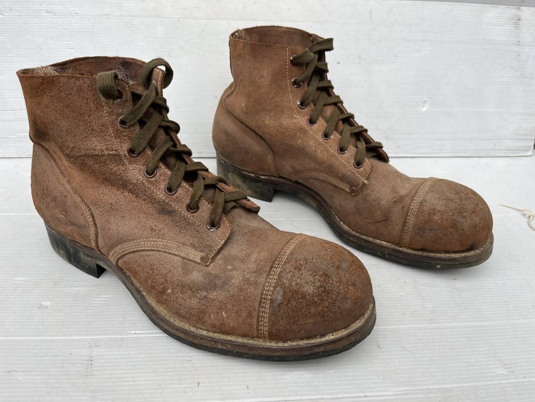 Rare paire de brodequins réglementaires 'Shoes Service type III'. Paire de brodequins en cuir retourné à bouts renforcés. Brodequins à oeillets métalliques marron. Lacets en coton marron. Marquage sur les tiges intèrieures 11 E GY, marquage encre fabricant 'International Shoes Inc 06 Janv 1944'. Cuir souple, taille 45. Renforts par rivets métalliques sur les empeignes. Talons et semelles en caoutchouc 'mono bloc'. Semelles cousues et cloutées. Marquage fabricant sur semelles Ligth Tread . Longueur semelle 32cm pointure 45. Hauteur brodequins 17cm. Légèrement porté en superbe état. Belle paire de brodequins du GI de la Libération 1942/44 Paire de chaussure sans aucun défaut ét définitive en collection Ref 19843