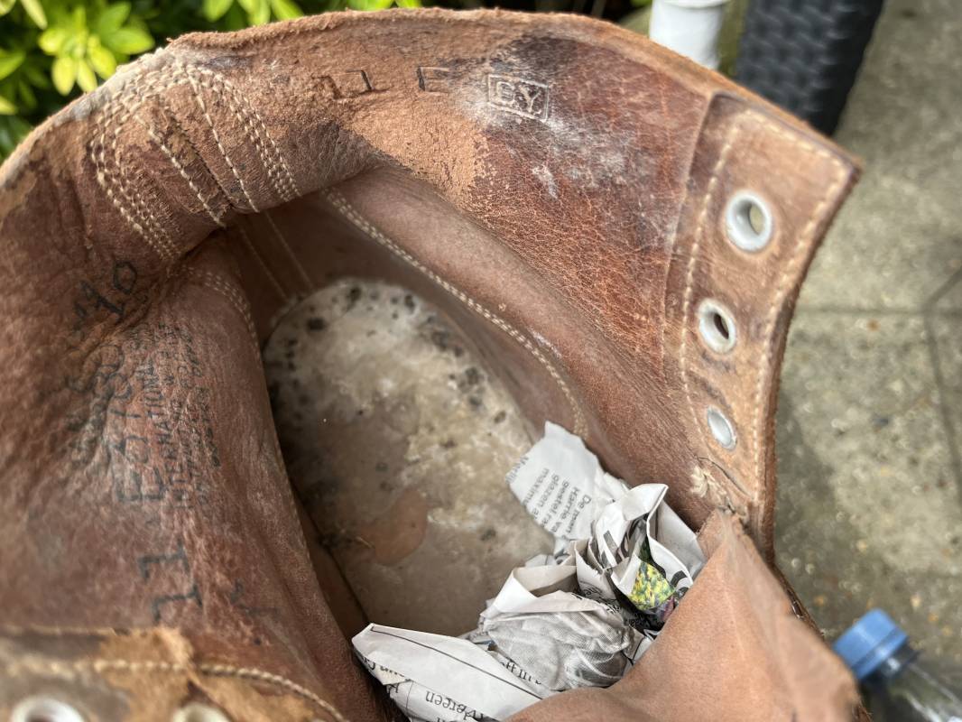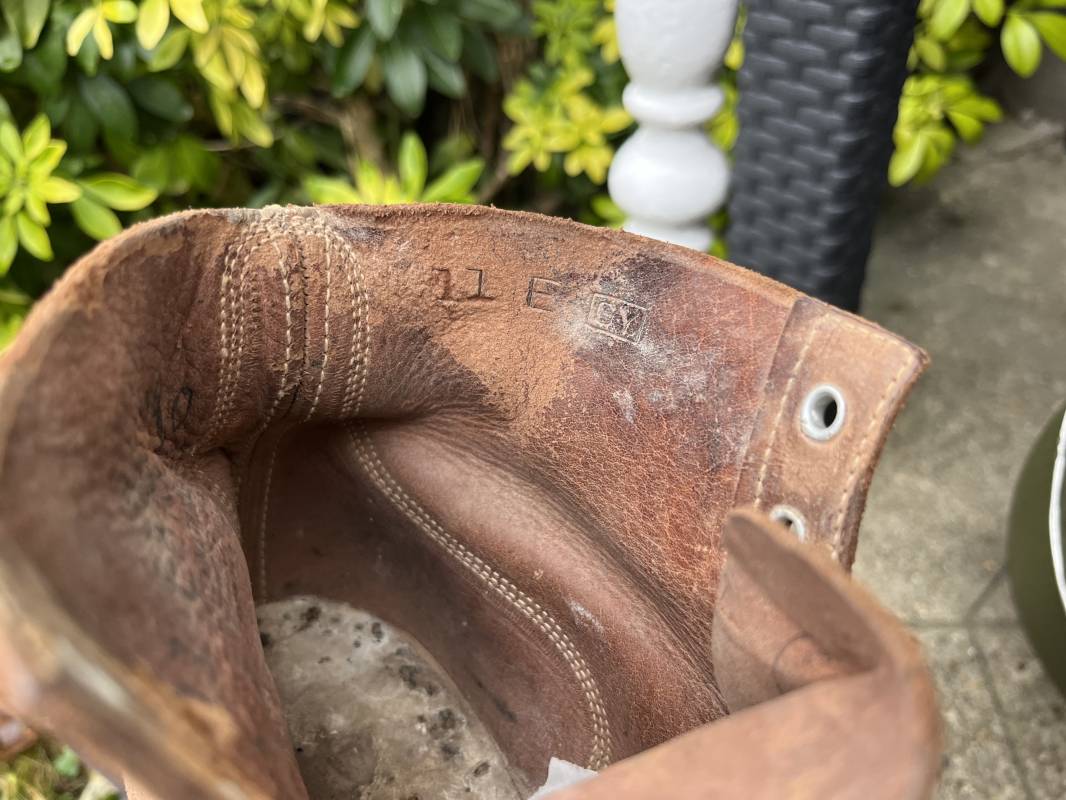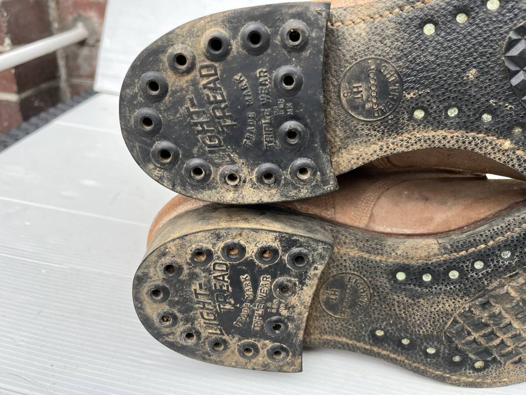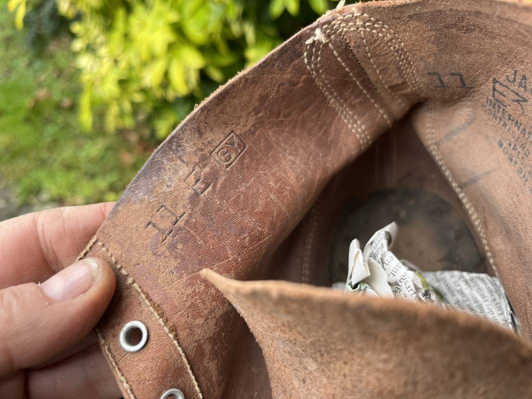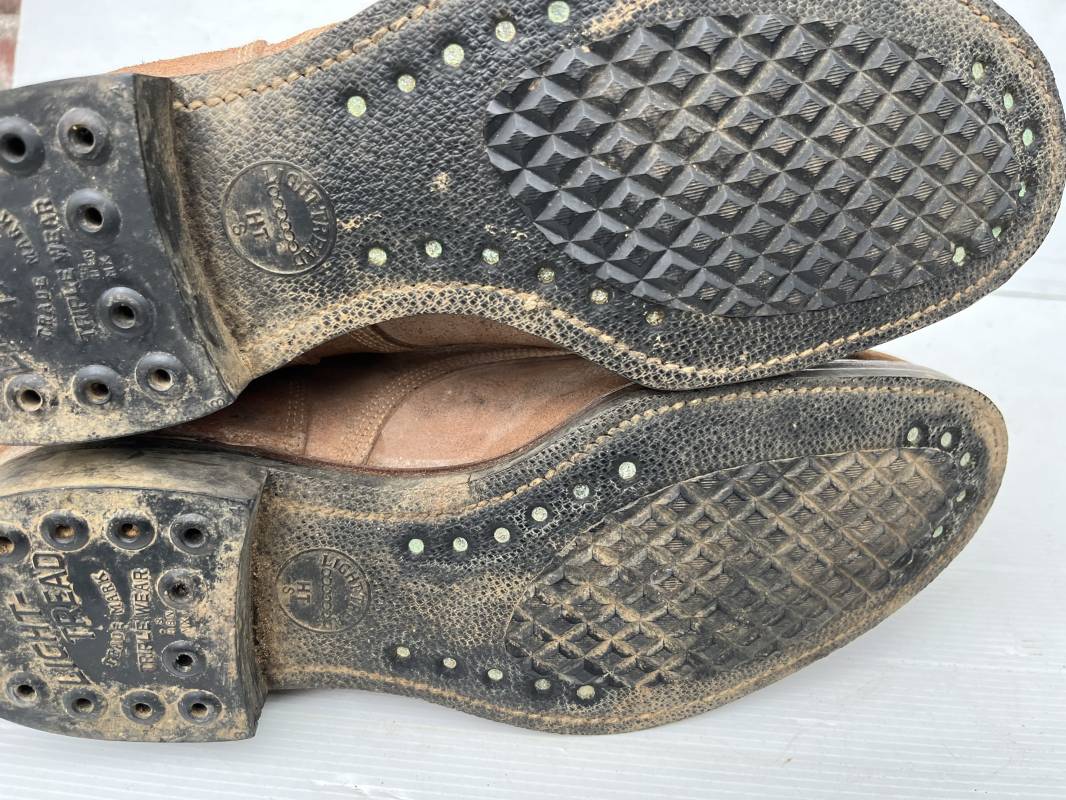 Rare paire de brodequins réglementaires 'Shoes Service type III'. Paire de brodequins en cuir retourné à bouts renforcés. Brodequins à oeillets métalliques marron. Lacets en coton marron. Marquage sur les tiges intèrieures 11 E GY, marquage encre fabricant 'International Shoes Inc 06 Janv 1944'. Cuir souple, taille 45. Renforts par rivets métalliques sur les empeignes. Talons et semelles en caoutchouc 'mono bloc'. Semelles cousues et cloutées. Marquage fabricant sur semelles Ligth Tread . Longueur semelle 32cm pointure 45. Hauteur brodequins 17cm. Légèrement porté en superbe état. Belle paire de brodequins du GI de la Libération 1942/44 Paire de chaussure sans aucun défaut ét définitive en collection Ref 19843