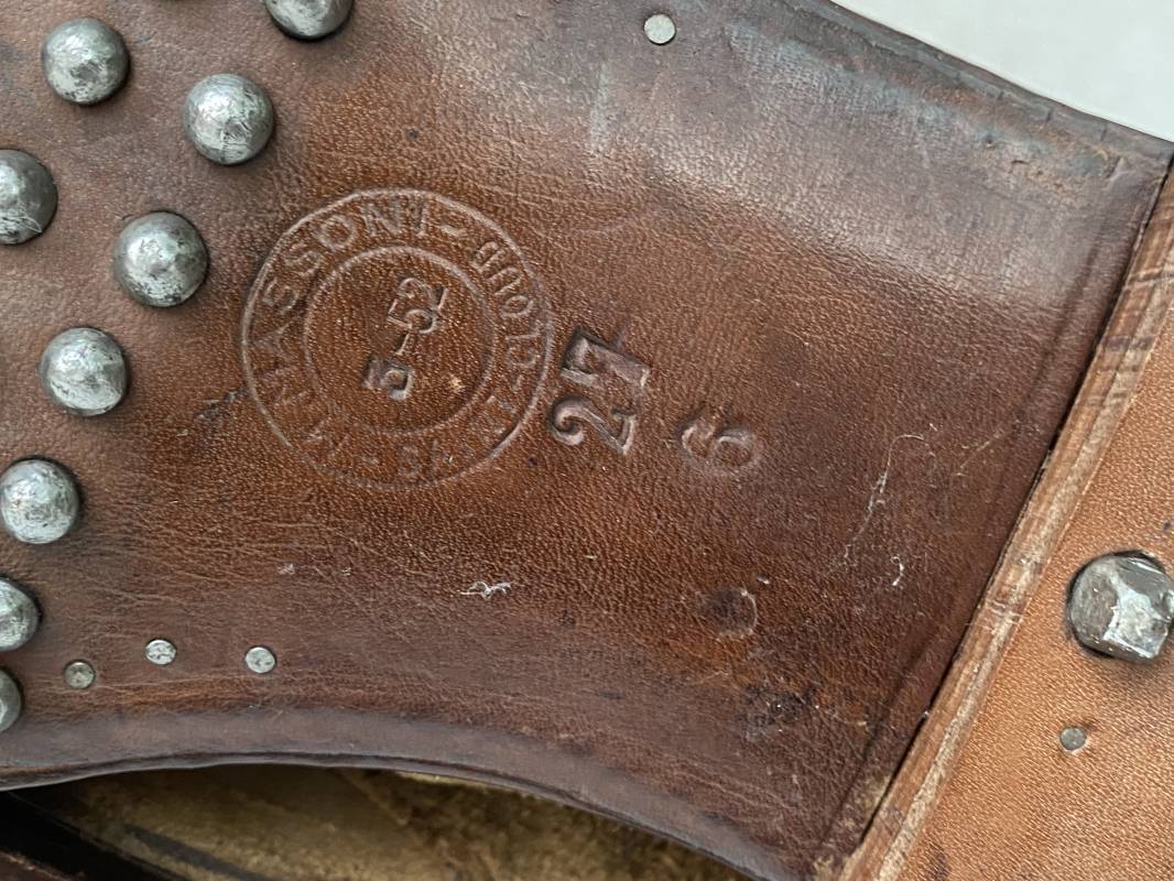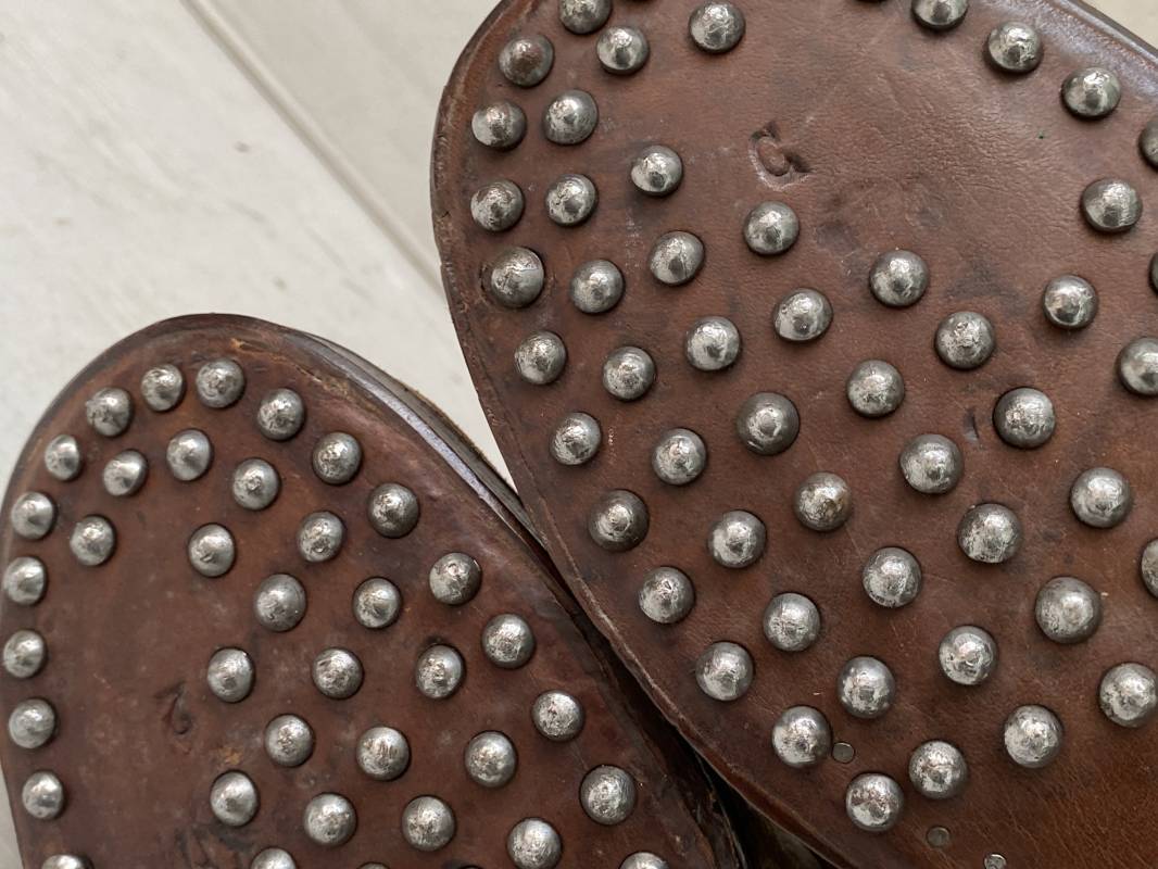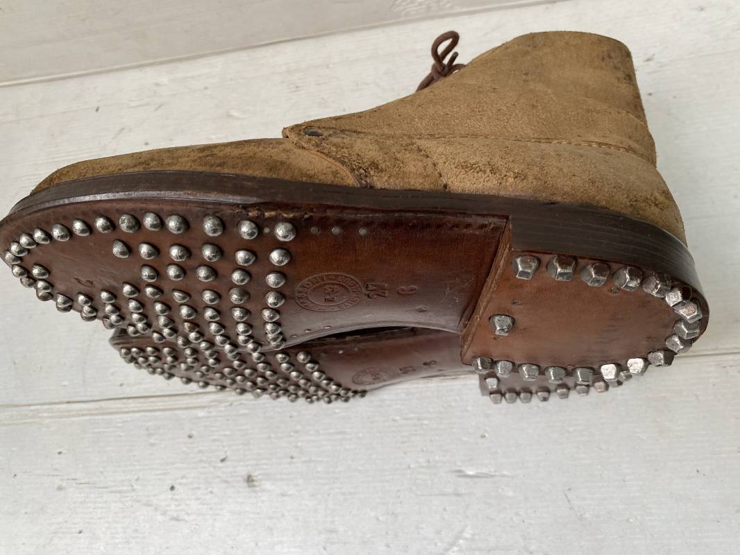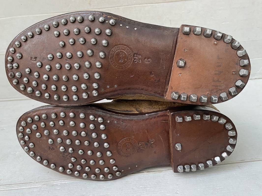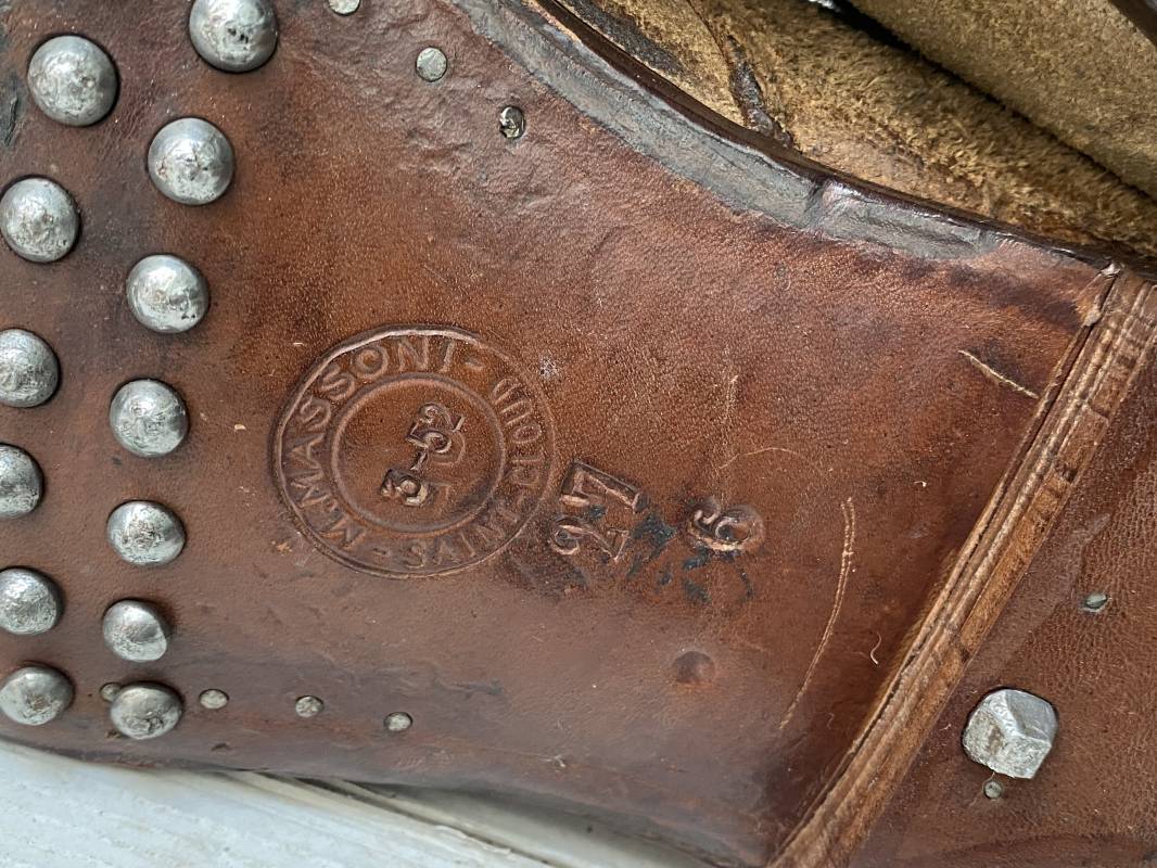 Superbe paire de brodequins cloutés modèle 1917 en cuir fauve. Oeillets et rivets métalliques. Lacets en coton marron. Semelles et talons cloutés d'origine. Marquage fabricant M. Masson Saint Cloud 3/1952. Taille 27 pointure 43 environ. Longueur semelles 30cm, cuir souple. Paire en superbe état. Ref 18044