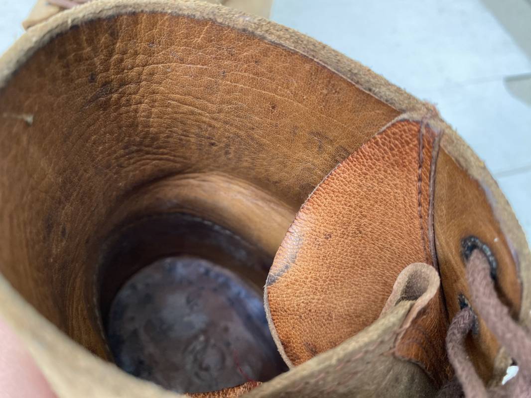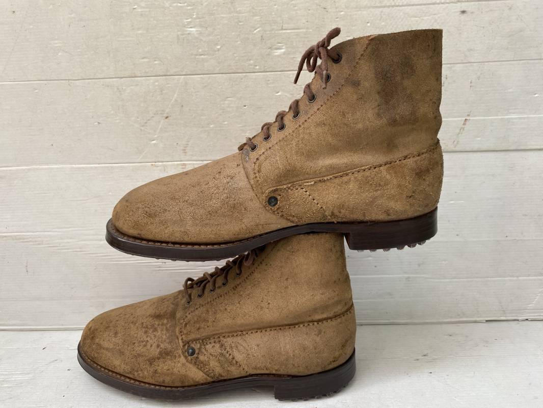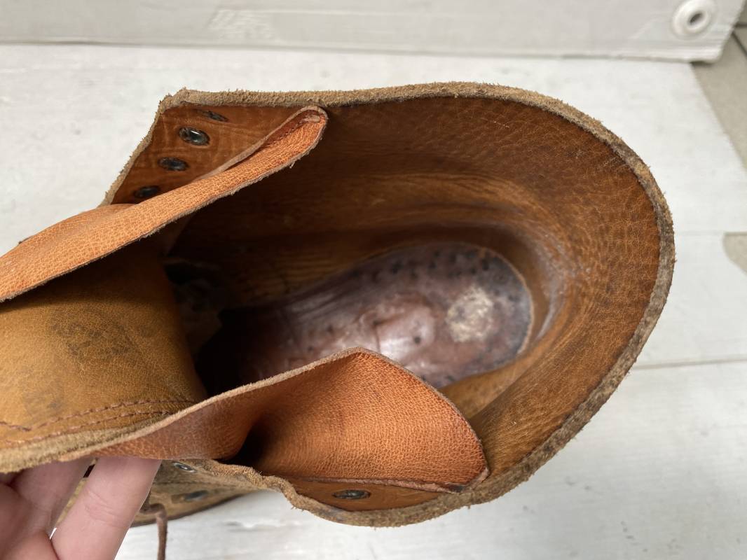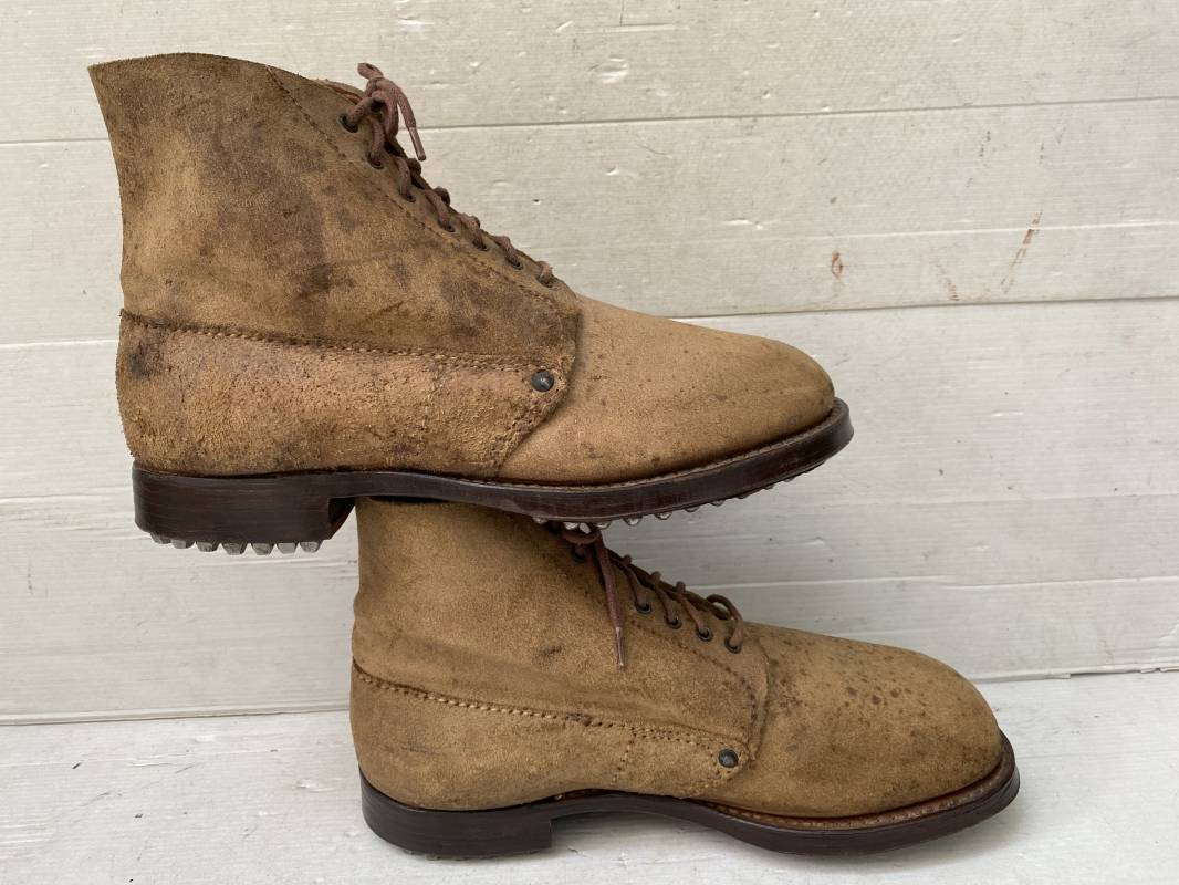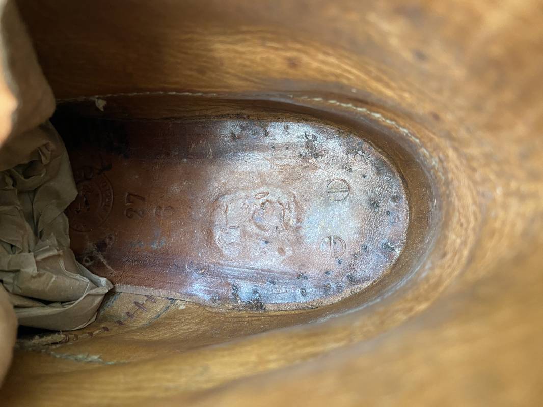 Superbe paire de brodequins cloutés modèle 1917 en cuir fauve. Oeillets et rivets métalliques. Lacets en coton marron. Semelles et talons cloutés d'origine. Marquage fabricant M. Masson Saint Cloud 3/1952. Taille 27 pointure 43 environ. Longueur semelles 30cm, cuir souple. Paire en superbe état. Ref 18044