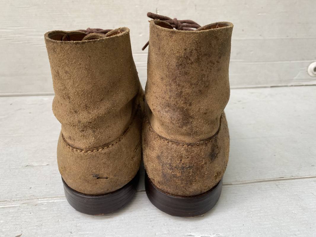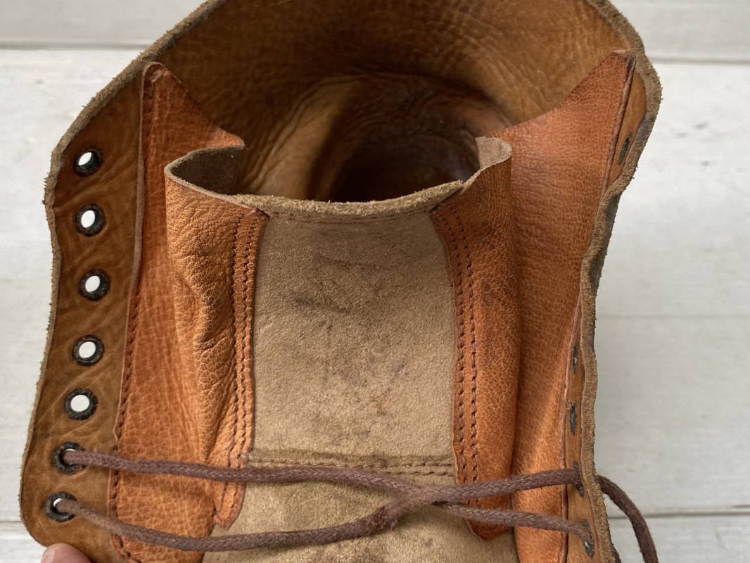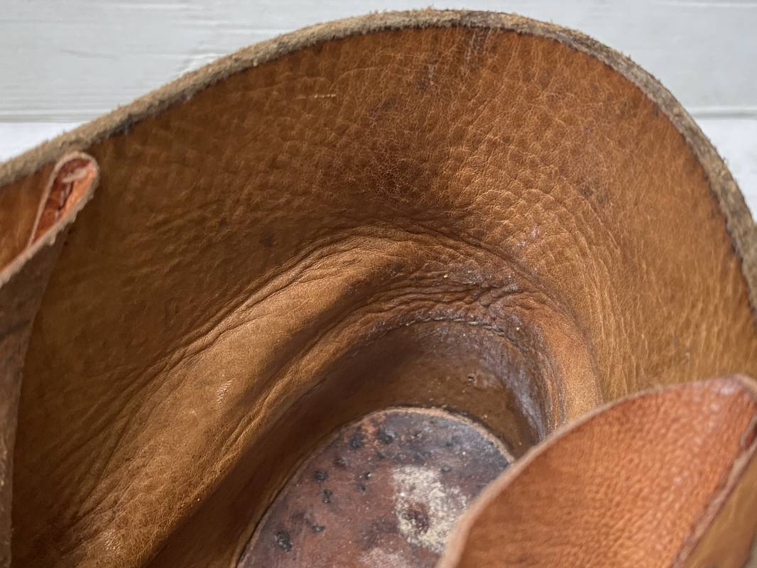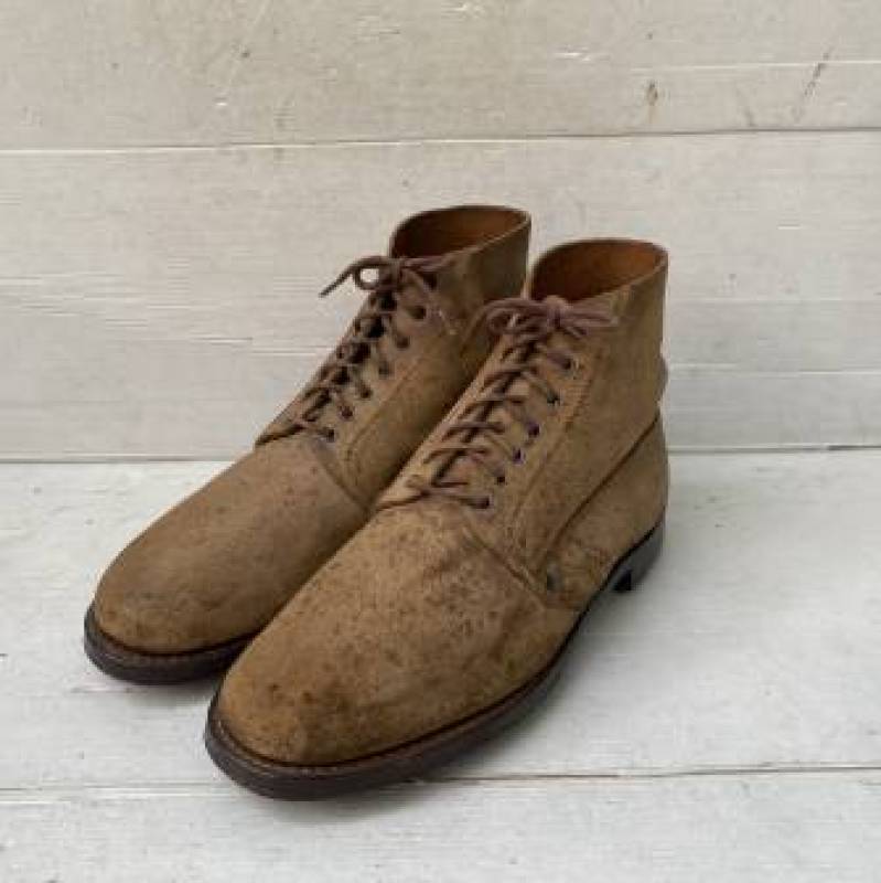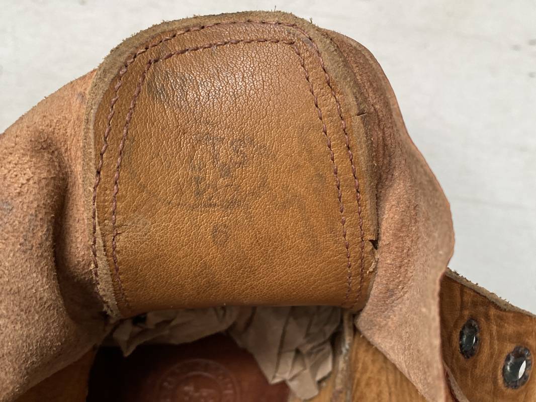 Superbe paire de brodequins cloutés modèle 1917 en cuir fauve. Oeillets et rivets métalliques. Lacets en coton marron. Semelles et talons cloutés d'origine. Marquage fabricant M. Masson Saint Cloud 3/1952. Taille 27 pointure 43 environ. Longueur semelles 30cm, cuir souple. Paire en superbe état. Ref 18044