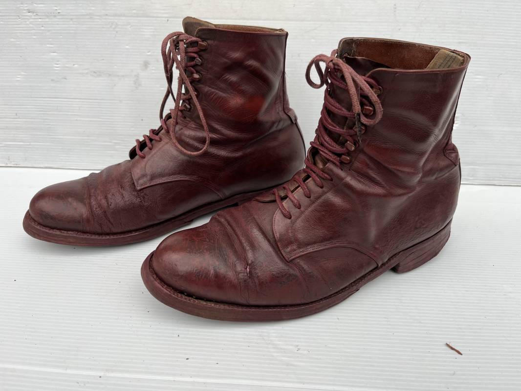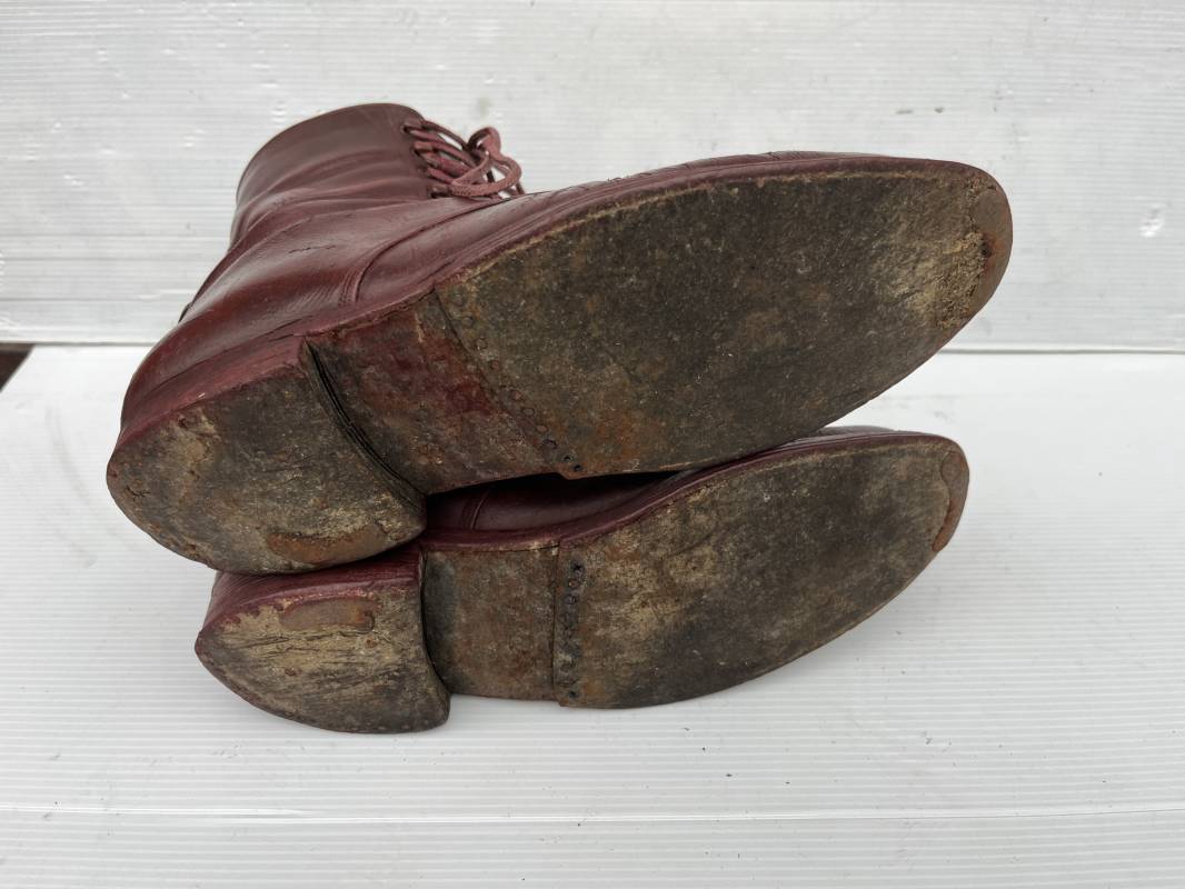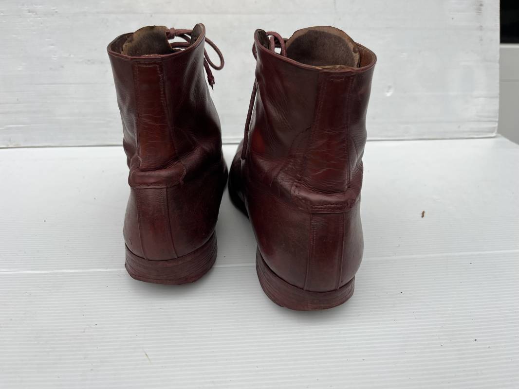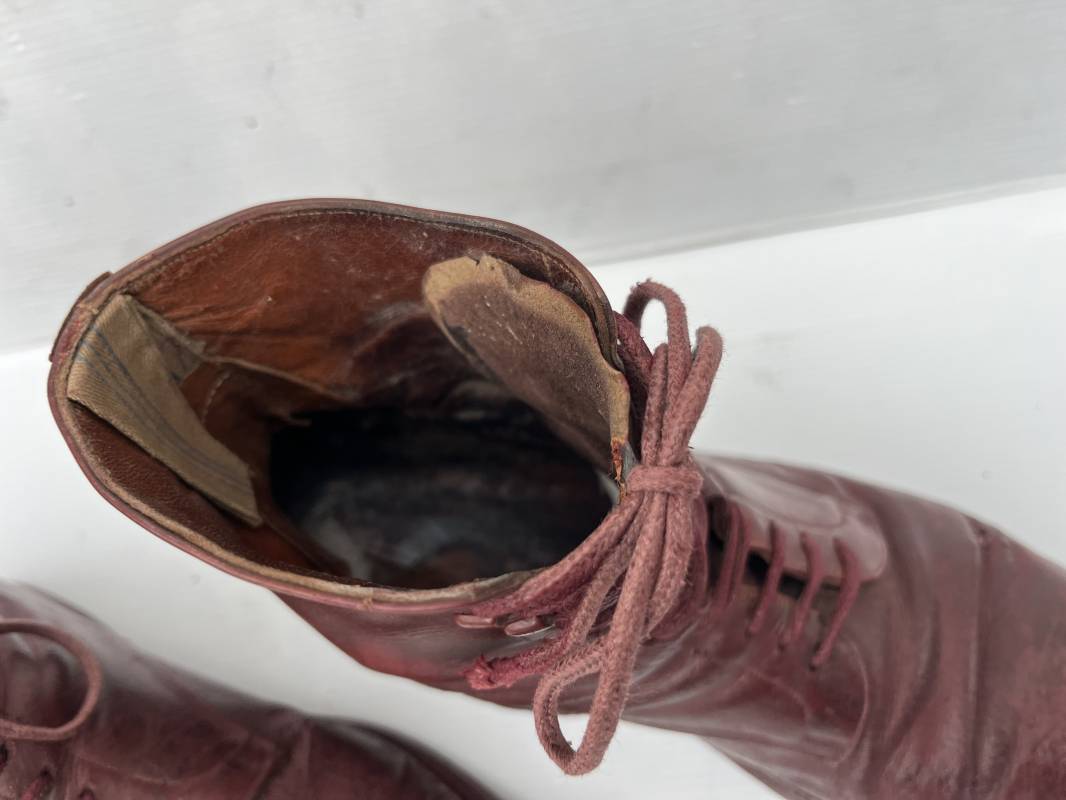 Belle paire de brodequins d un cadre officier ou sous officier . Paire de brodequins en cuir brun rouge . Oeillets et crochets métalliques . Lacets en coton marron . Deux tirettes interieures en coton sur chaque haut de tige arrière . Hauteur brodequins 17 cm . Talons et semelles en cuir lisse dorigine Longueur semelle 27 cm . Pointure 42 environ . Paire portée en bon état 1915/18 Ref 21841