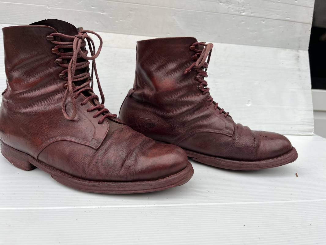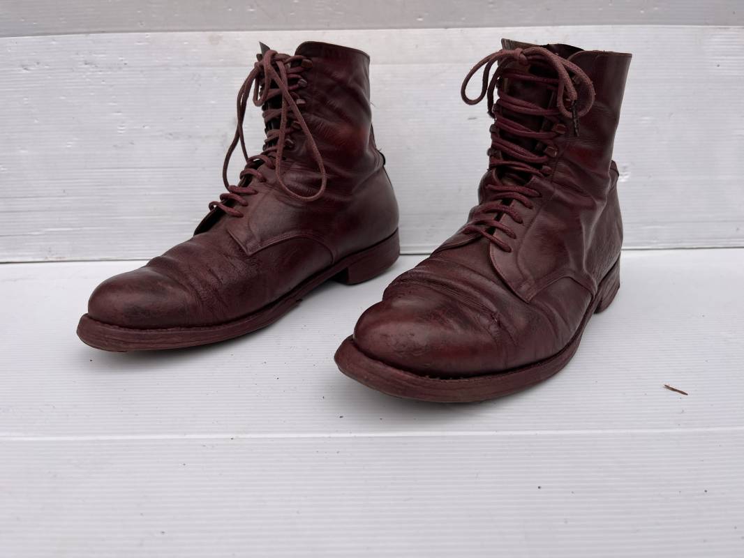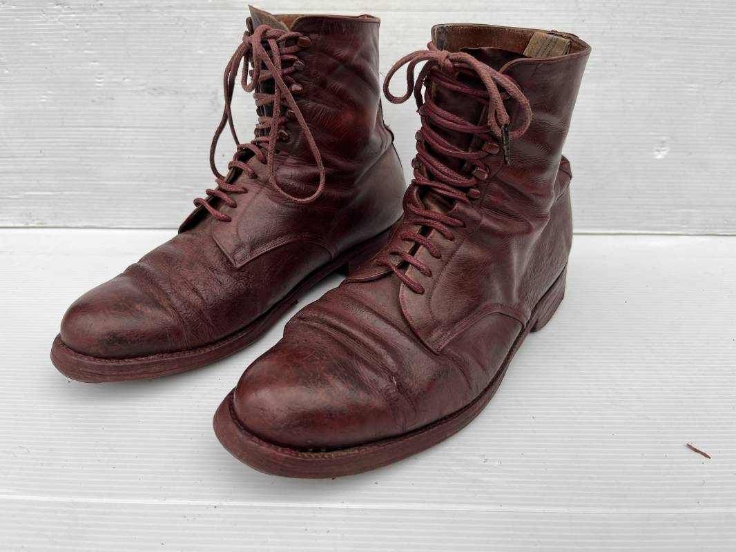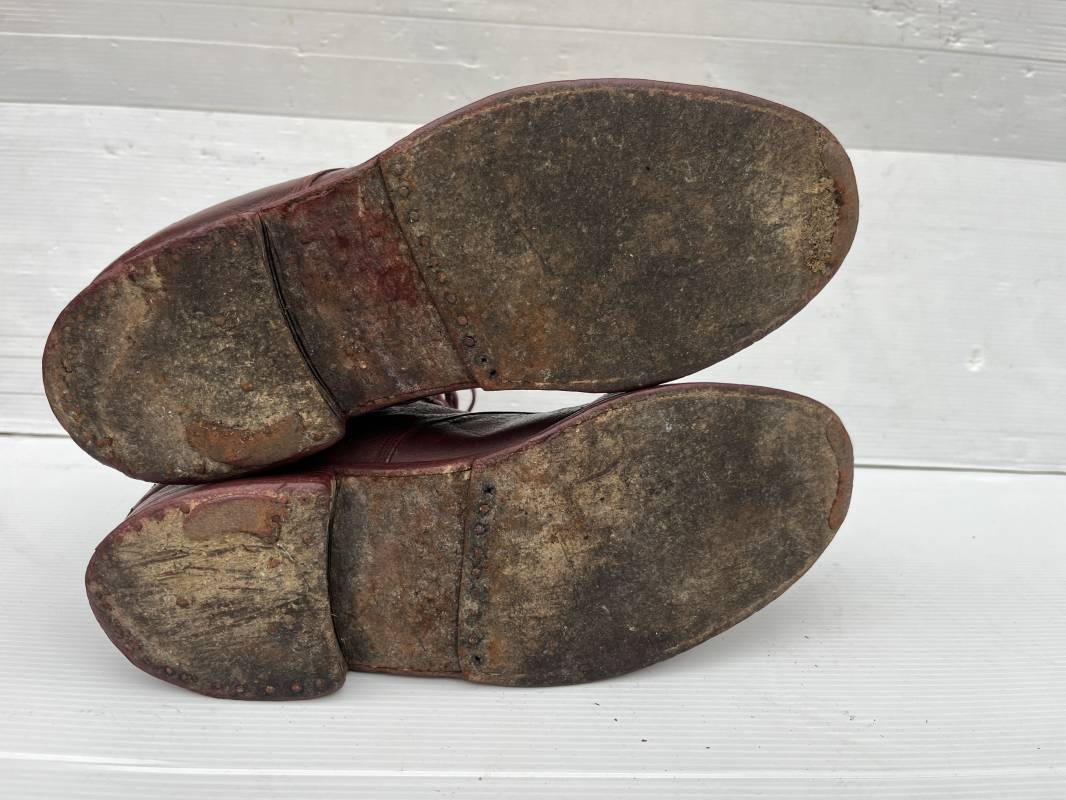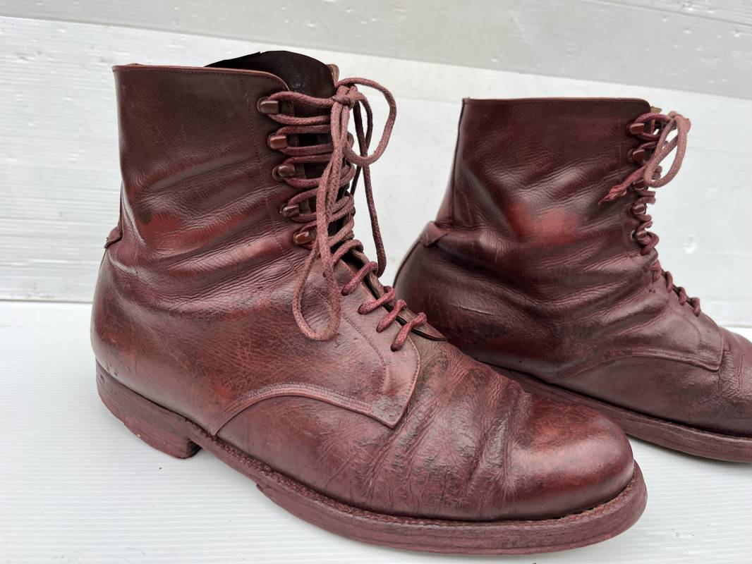 Belle paire de brodequins d un cadre officier ou sous officier . Paire de brodequins en cuir brun rouge . Oeillets et crochets métalliques . Lacets en coton marron . Deux tirettes interieures en coton sur chaque haut de tige arrière . Hauteur brodequins 17 cm . Talons et semelles en cuir lisse dorigine Longueur semelle 27 cm . Pointure 42 environ . Paire portée en bon état 1915/18 Ref 21841