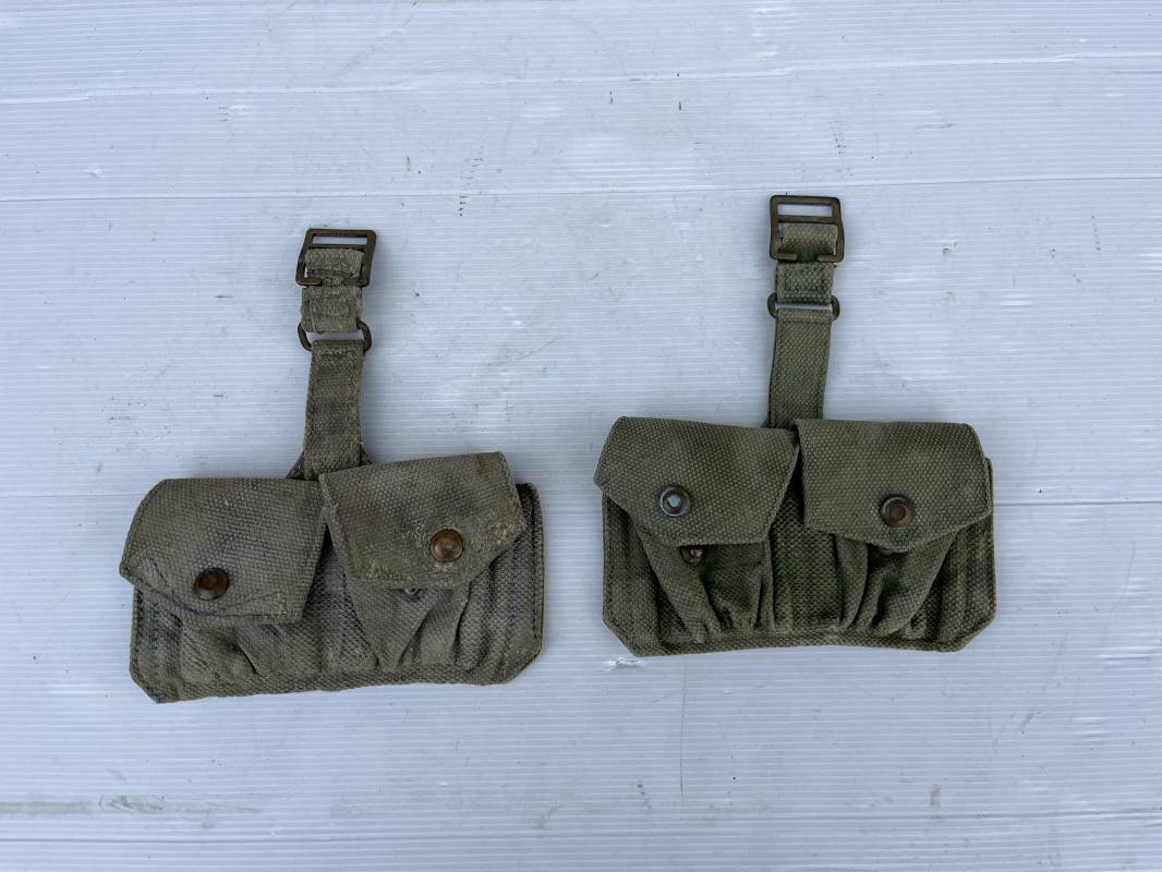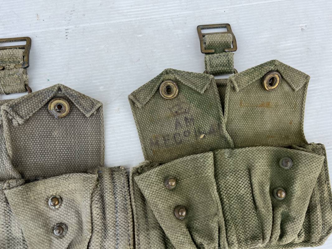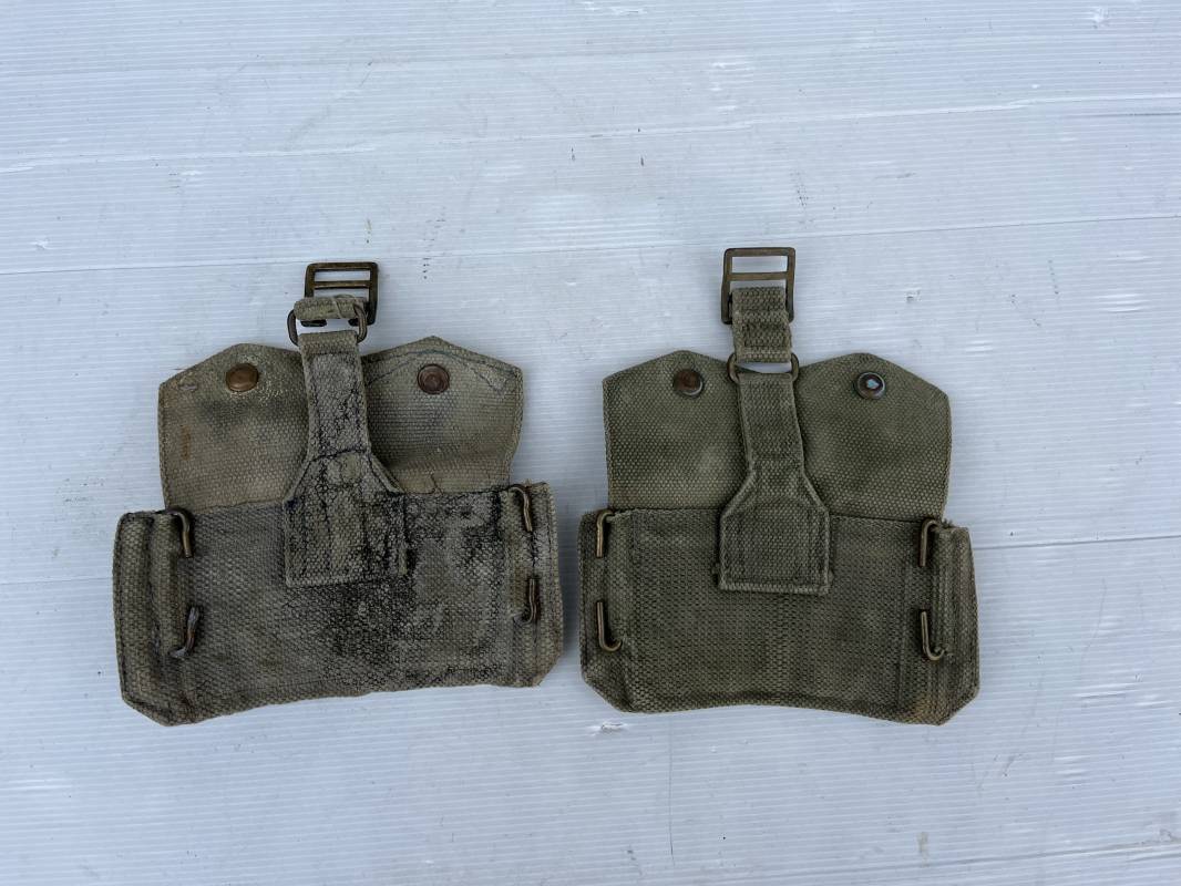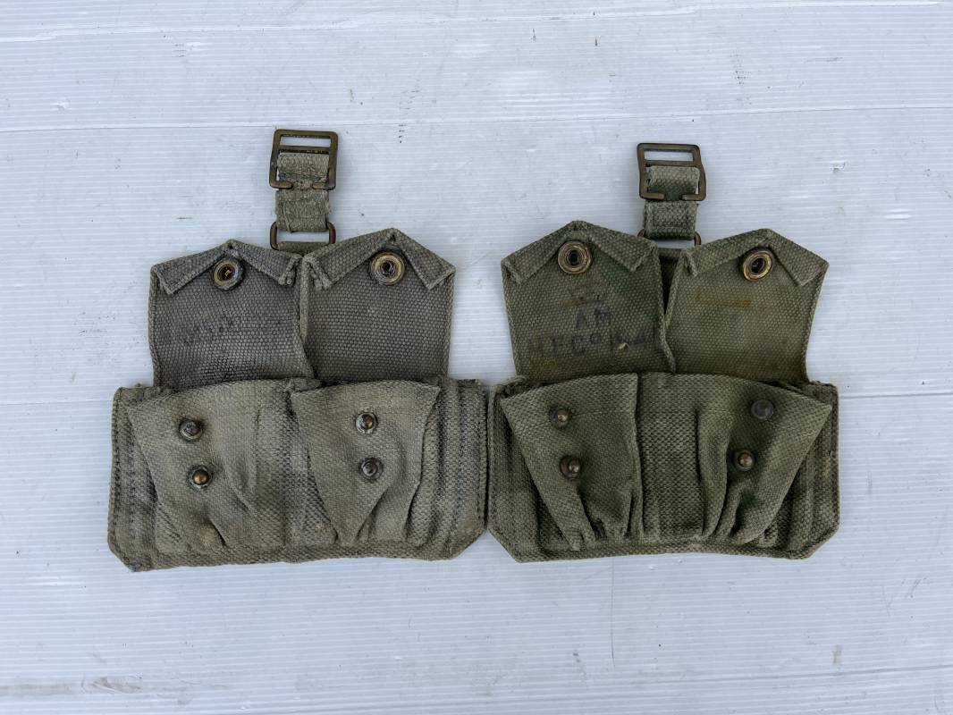 Paire de cartouchières pour le fusil SMLE. Pochettes en coton filé blancoté. Rabats avec boutons pression. Crochets et passants en laiton. Marquage fabricant ME & Co 1941. Paire homogène retrouvée dans le Nord de la France en brocante. Typique Mai/Juin 1940. Porté dans leur jus. Ref 19899