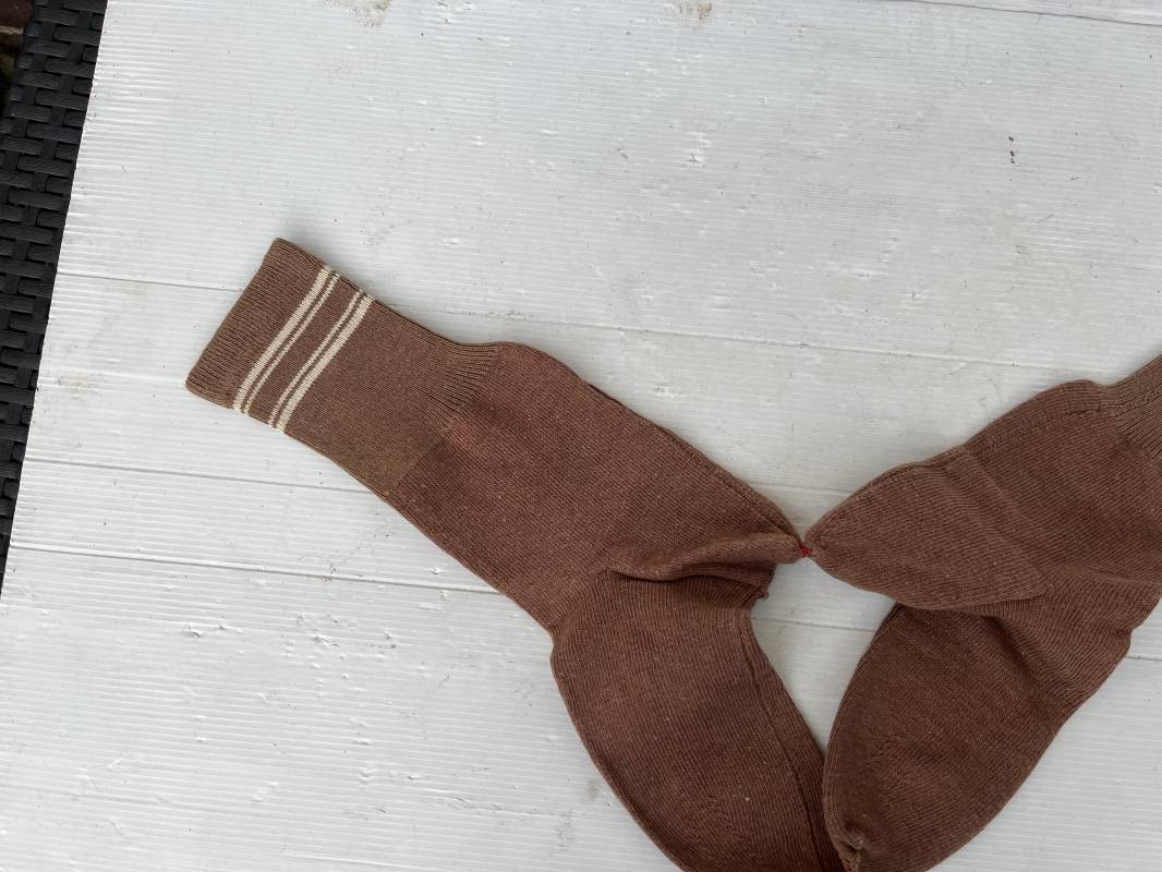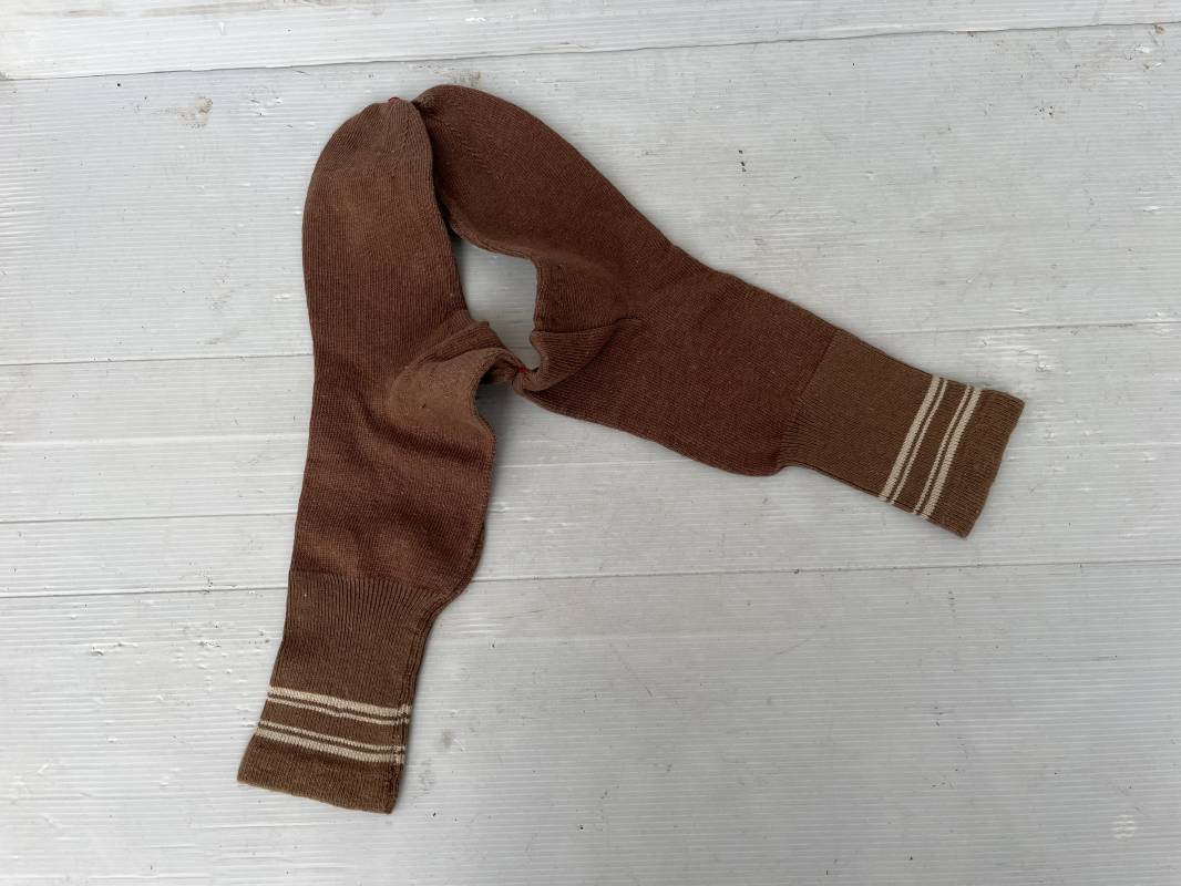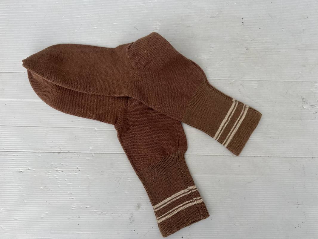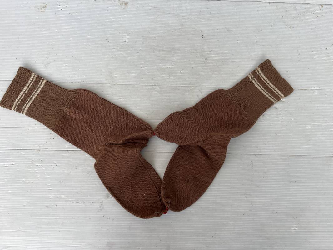Paire de chaussettes troupe réglementaires pour fantassin francais en 1940 . Chaussettes de dotation en laine de couleur marron clair . Bandes de taille . Taille II ( pointure 42/43 ) . Légèrement porté en parfait état . Sous vêtement peu courant Ref 19265