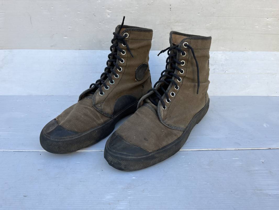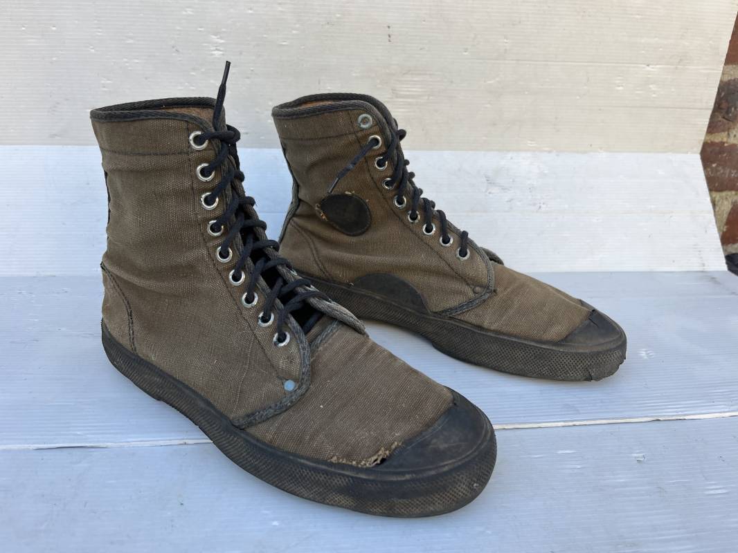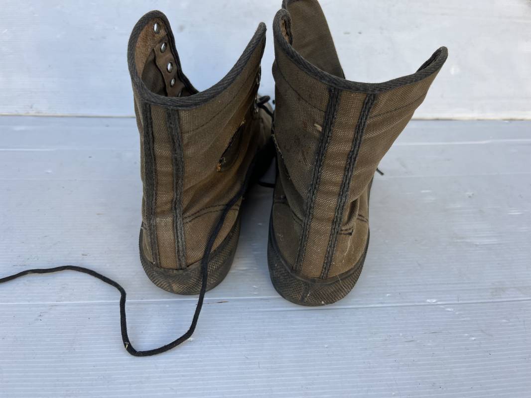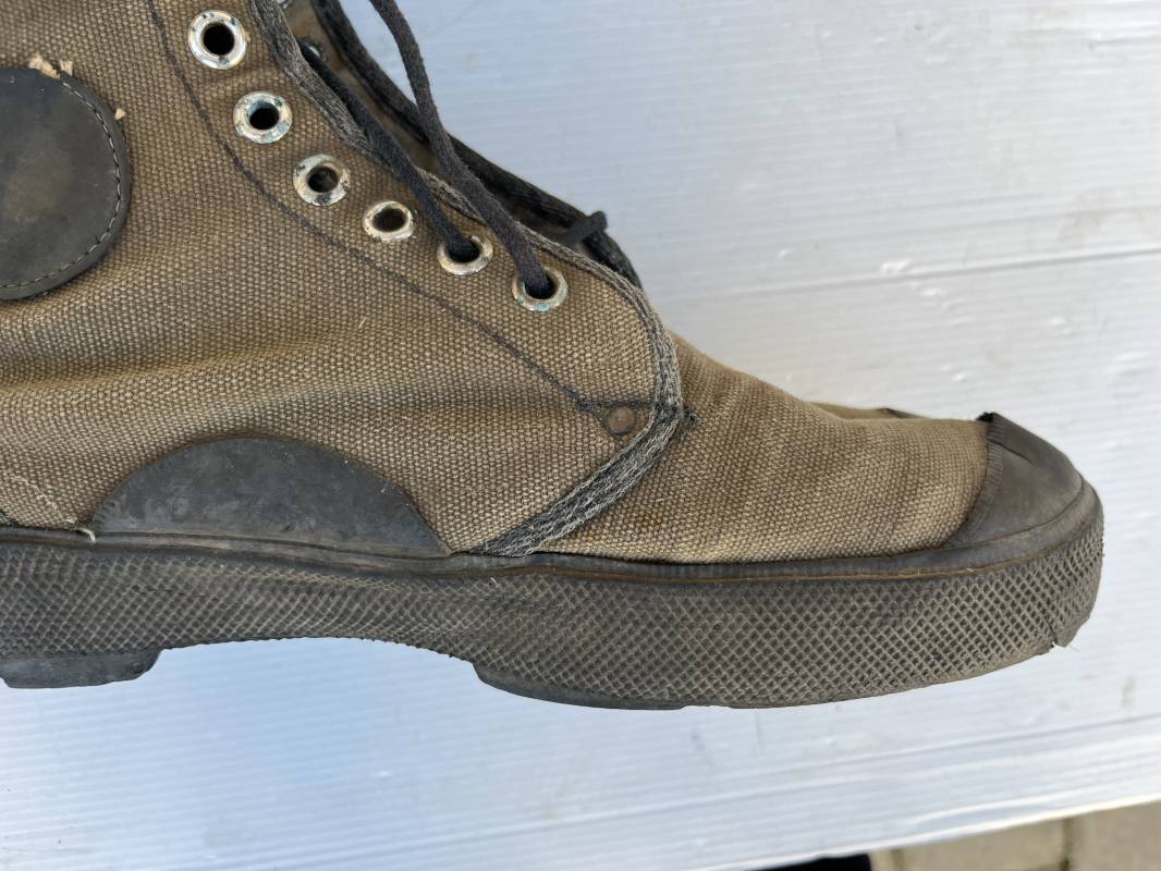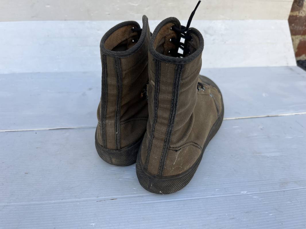 Rare paire de chaussures de brousse 'Extéme Orient' . Paire de chaussures en toile kaki et caoutchouc . Neuf oeillets en métal nickelé , lacets en coton noir . Deux rivets metalliques de renfort sur chaque empeignes . Semelles et talons mono bloc en caoutchouc noir à crampons specifiques en forme de A . Marquage 'Made in India' sur le talon . Hauteur chaussure 16 cm , longueur semelles 28 cm . Pointure 27 Taille 42 . paire légérement portée en bel état ; A noté petit trou sur pied droit a la jonction du renfort de caoutchouc et toile sur le dessus du pied ( voir photos ) Rare paire de chaussures de brousse typique des troupes combattantes en Extréme orient 1945/55 Ref 21367