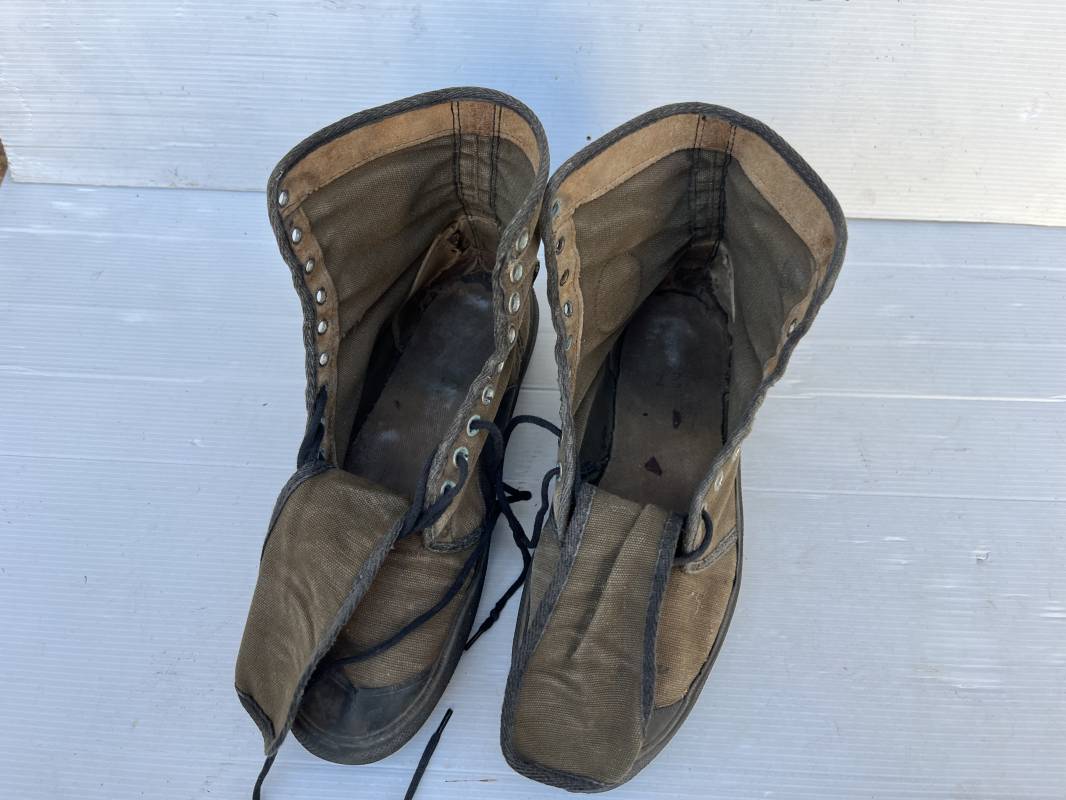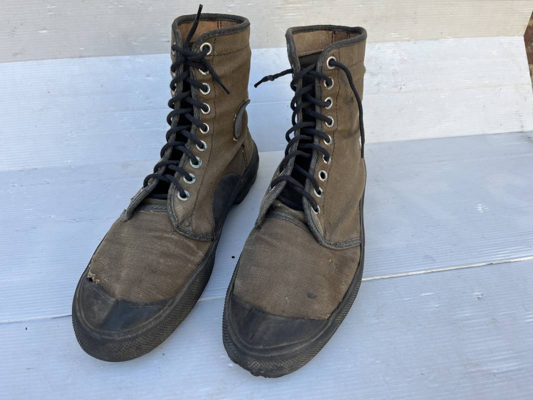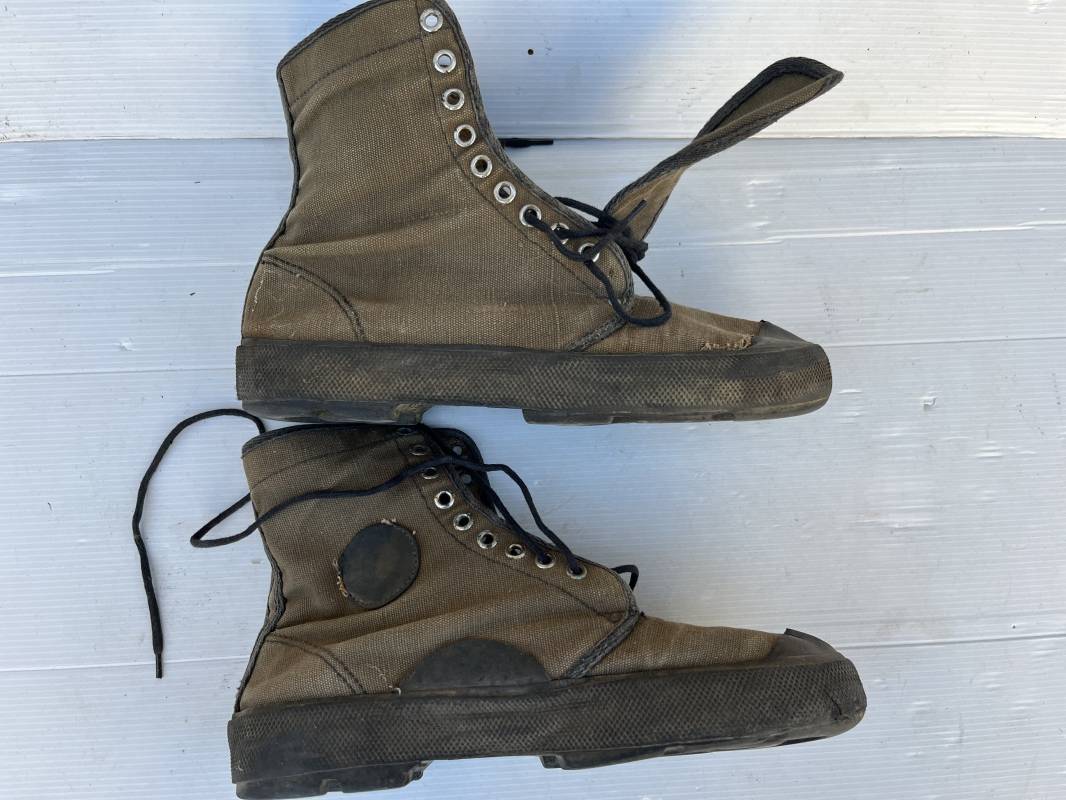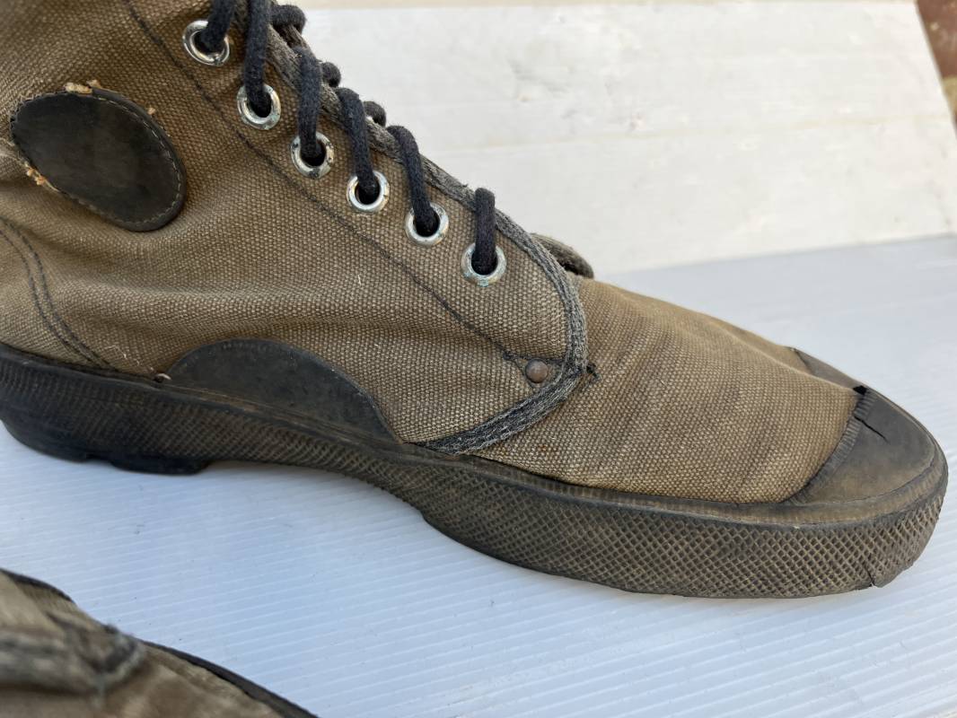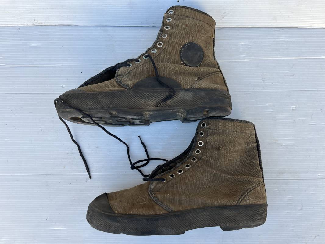 Rare paire de chaussures de brousse 'Extéme Orient' . Paire de chaussures en toile kaki et caoutchouc . Neuf oeillets en métal nickelé , lacets en coton noir . Deux rivets metalliques de renfort sur chaque empeignes . Semelles et talons mono bloc en caoutchouc noir à crampons specifiques en forme de A . Marquage 'Made in India' sur le talon . Hauteur chaussure 16 cm , longueur semelles 28 cm . Pointure 27 Taille 42 . paire légérement portée en bel état ; A noté petit trou sur pied droit a la jonction du renfort de caoutchouc et toile sur le dessus du pied ( voir photos ) Rare paire de chaussures de brousse typique des troupes combattantes en Extréme orient 1945/55 Ref 21367