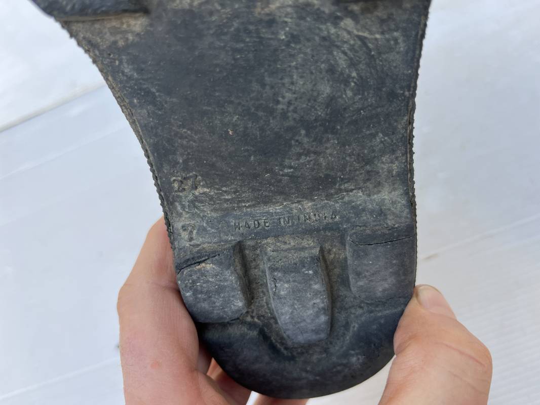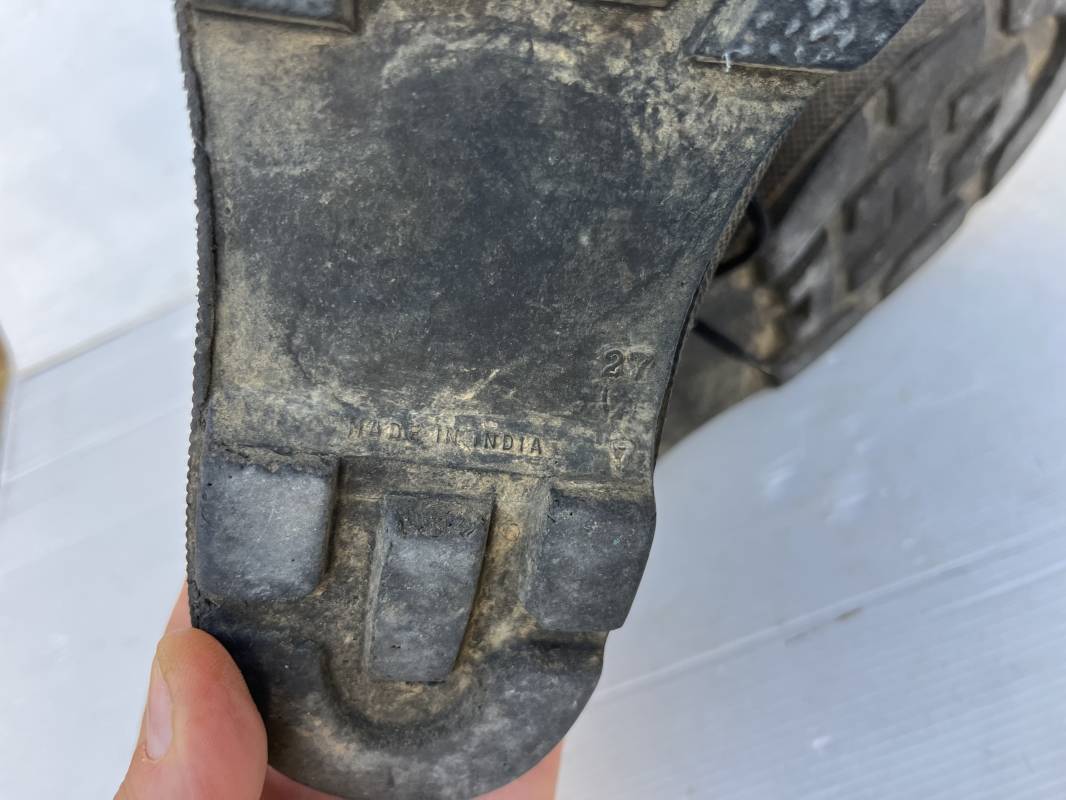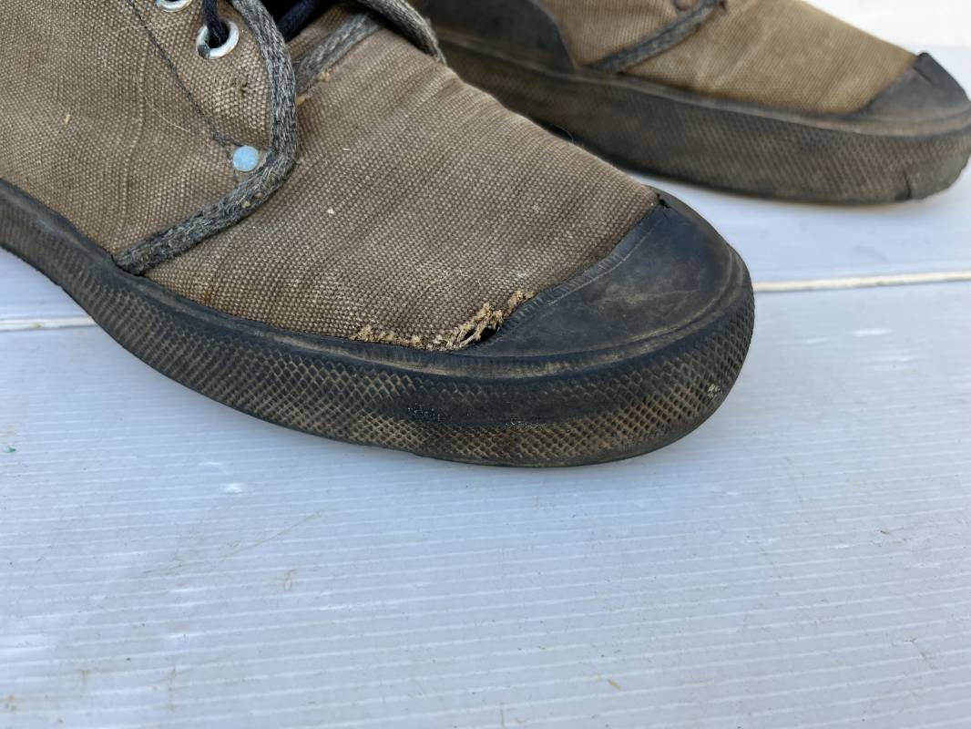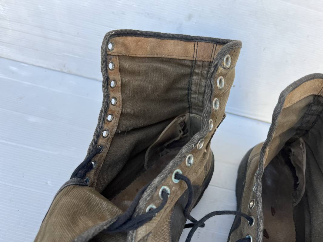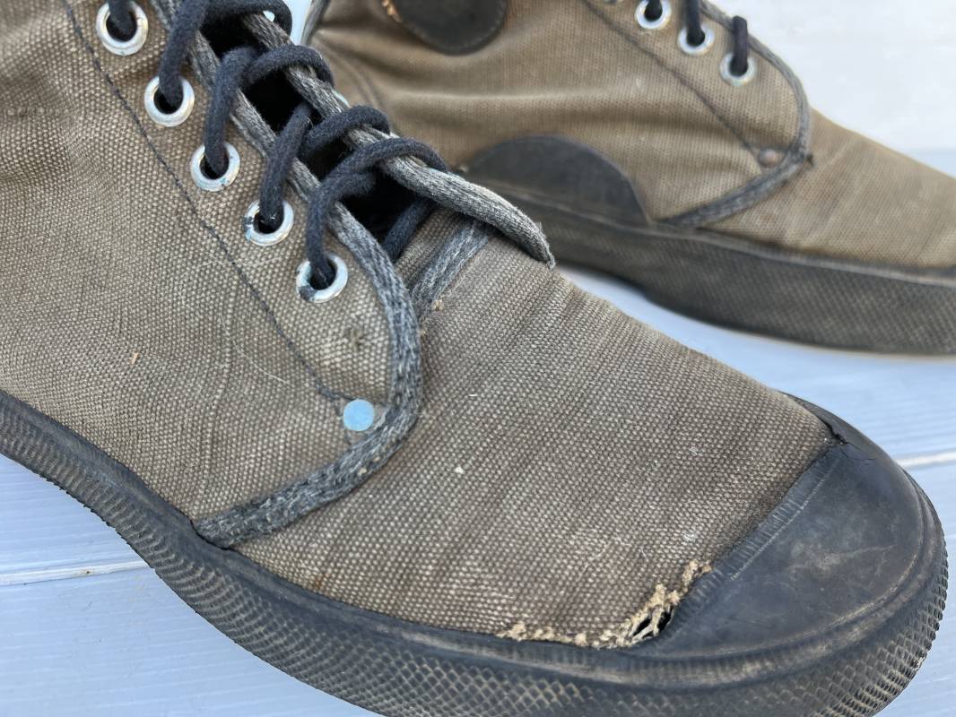 Rare paire de chaussures de brousse 'Extéme Orient' . Paire de chaussures en toile kaki et caoutchouc . Neuf oeillets en métal nickelé , lacets en coton noir . Deux rivets metalliques de renfort sur chaque empeignes . Semelles et talons mono bloc en caoutchouc noir à crampons specifiques en forme de A . Marquage 'Made in India' sur le talon . Hauteur chaussure 16 cm , longueur semelles 28 cm . Pointure 27 Taille 42 . paire légérement portée en bel état ; A noté petit trou sur pied droit a la jonction du renfort de caoutchouc et toile sur le dessus du pied ( voir photos ) Rare paire de chaussures de brousse typique des troupes combattantes en Extréme orient 1945/55 Ref 21367