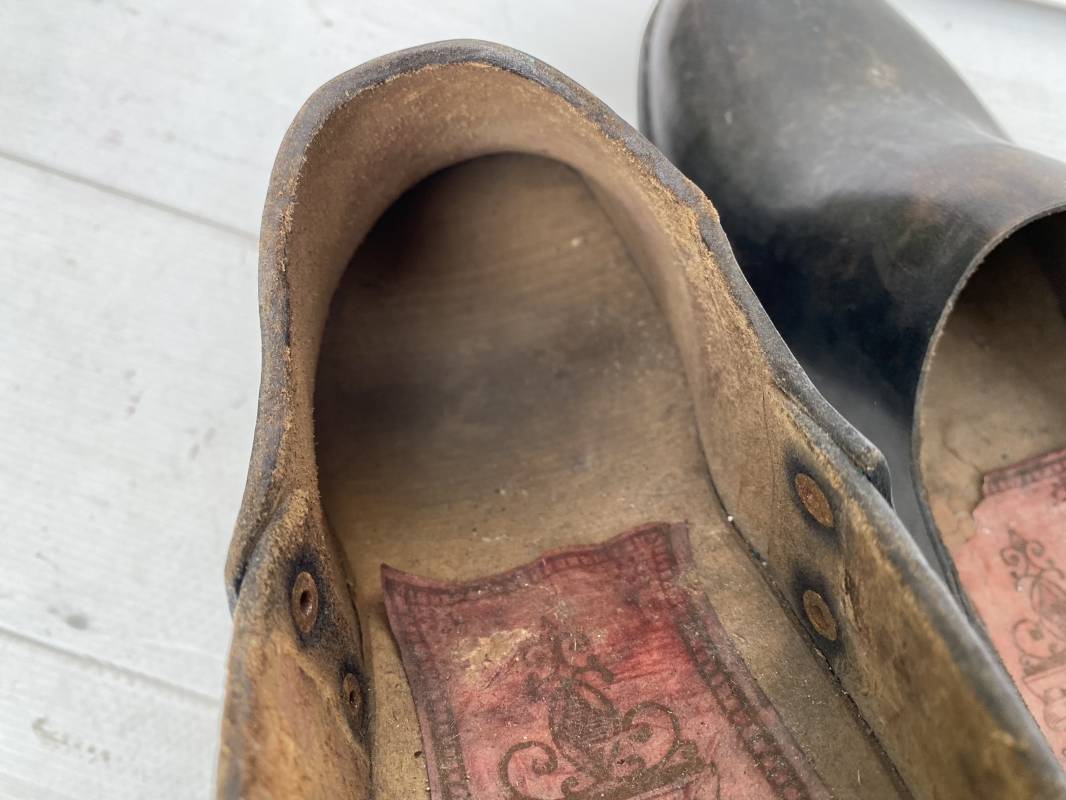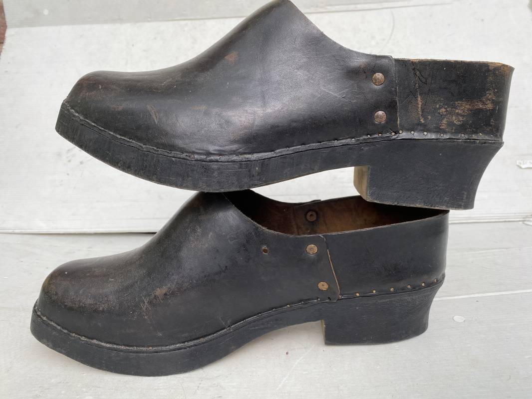 Paire de galoches de corvée réglementaire . Semelle bois , corps en cuir . Etiquette fabricant , receptionnées 1939 . Parfait état . Rare équipement francais . Ref 12360