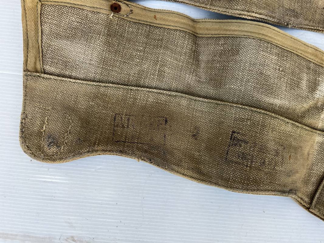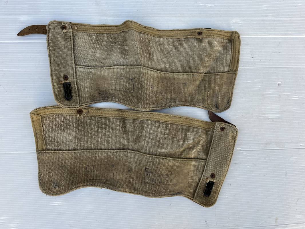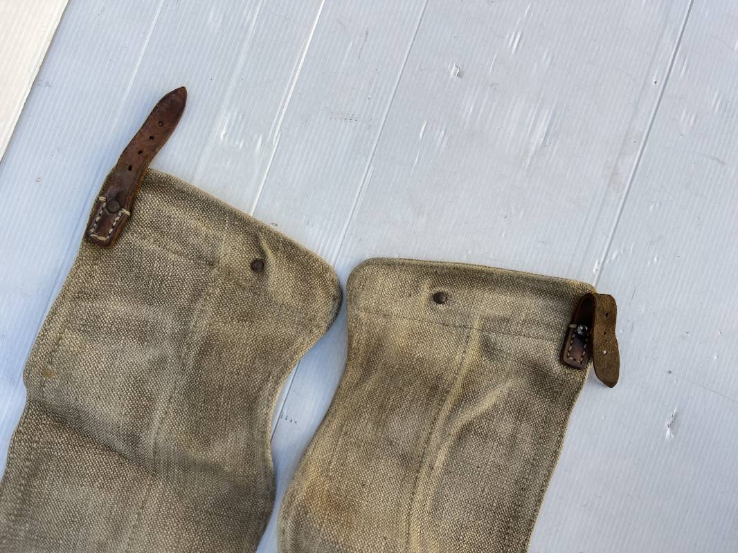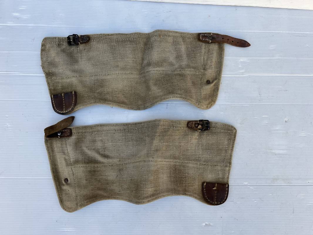 Paire de guètres modéle 1945 . Paire de guètres de dotation en forte toile kaki clair , lanières en cuir et boucles metalliques , Renforts latéral par tiges metalliques . Marquages encre noire Armée ' . Porté en bon état Ref 19318