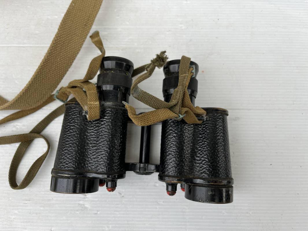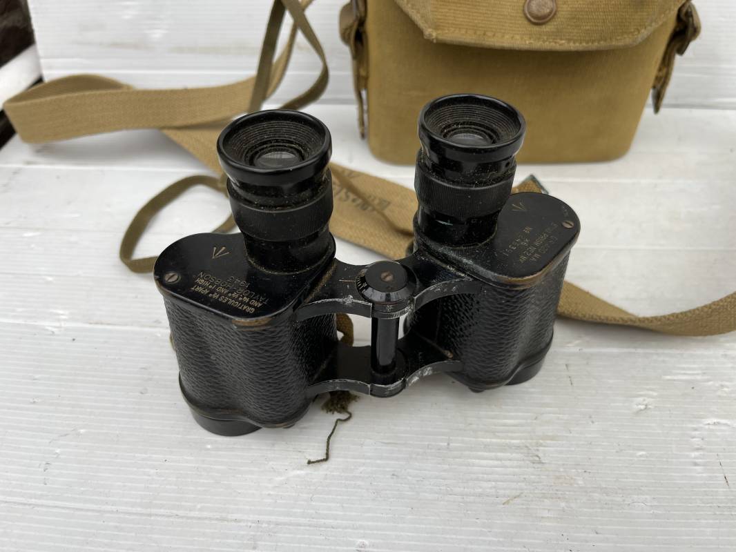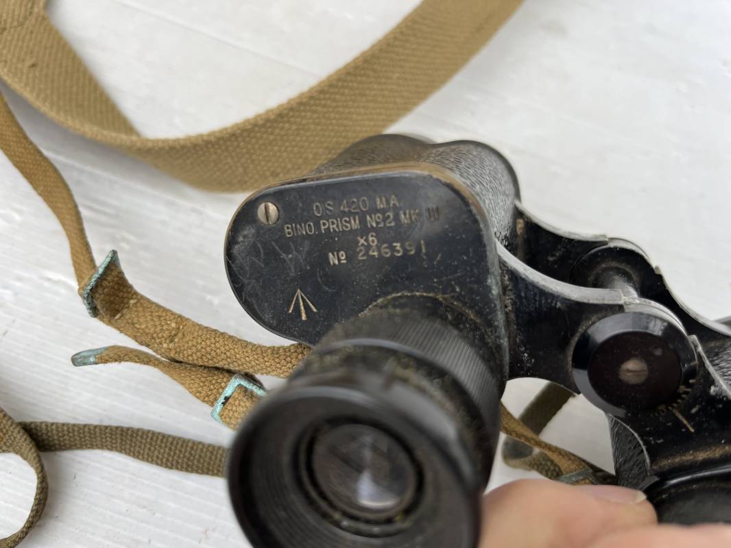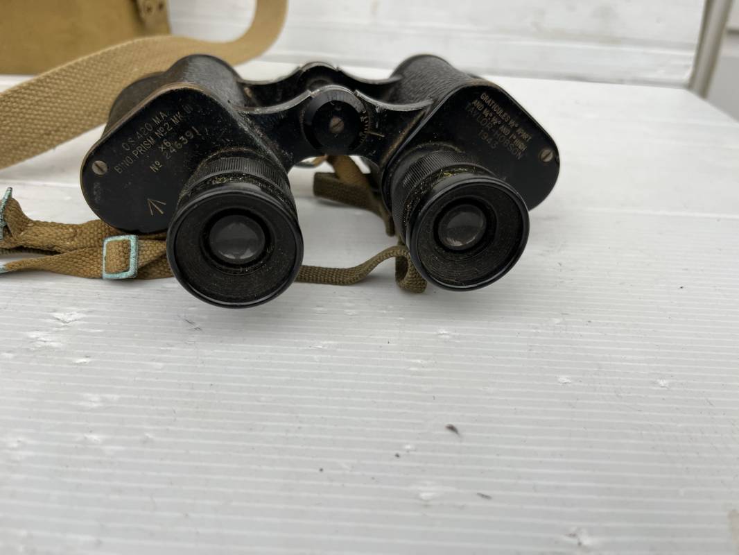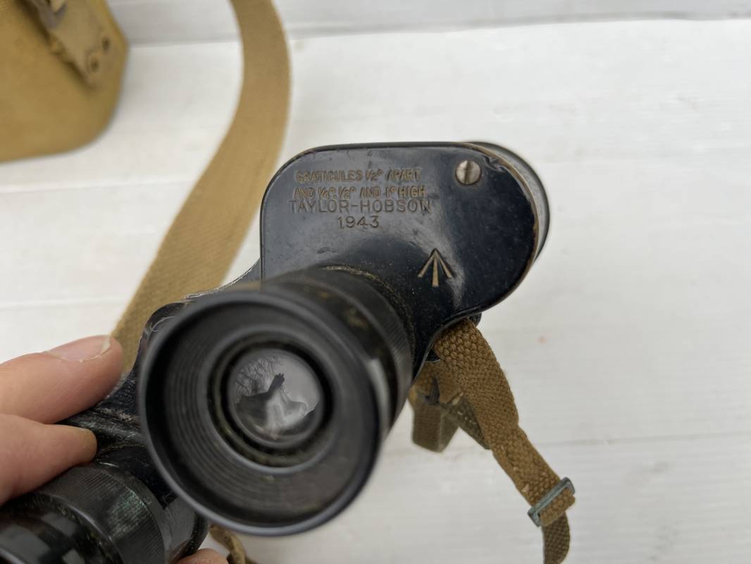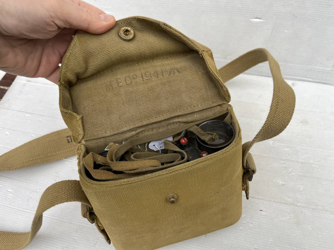 Trés belle paire de jumelles MKIII et étui Pattern 1937 . Paire de jumelles MKIII Bino Prism n °2 MKIII Grossissement 6 . Marquage fabricant Taylor Hobson 1943 Optique en bel état . Métal et laiton avec peinture noire d origine . Lanières en coton filet et boucles métallique de réglage . Etui porte jumelles de dotation pattern 1937 en coton filé beige . Intérieur avec feutrine de protection . Rabat avec pression . Marquage fabricant MECo 1941 . Crochets en laiton sur le derrière pour la fixation au ceinturon . Sangle en coton filet pour le port en sautoir , marquage fabricant daté 1940 . Bel ensemble en parfait état Ref 17079