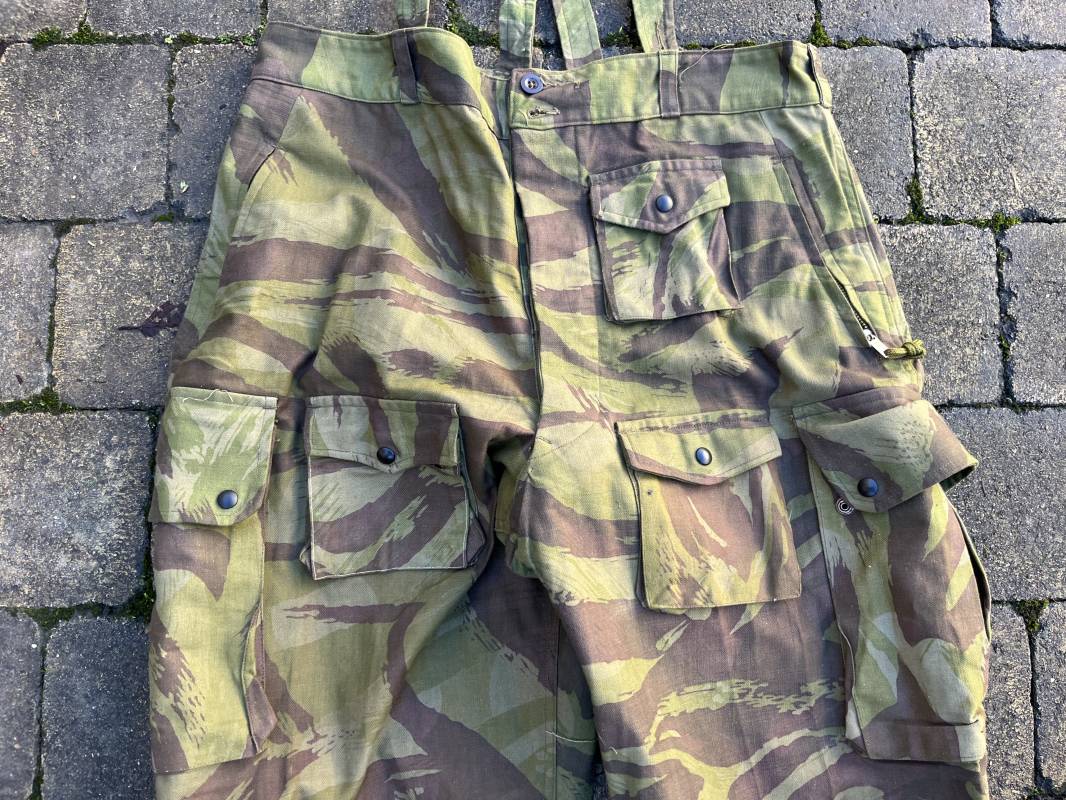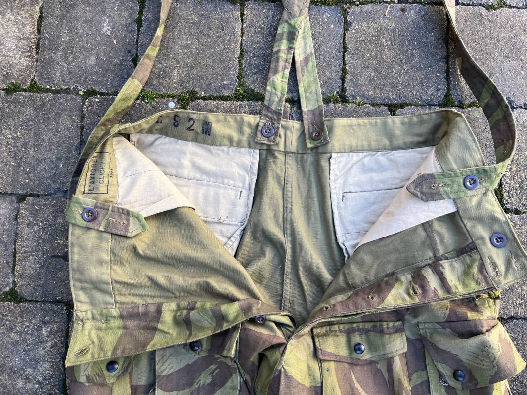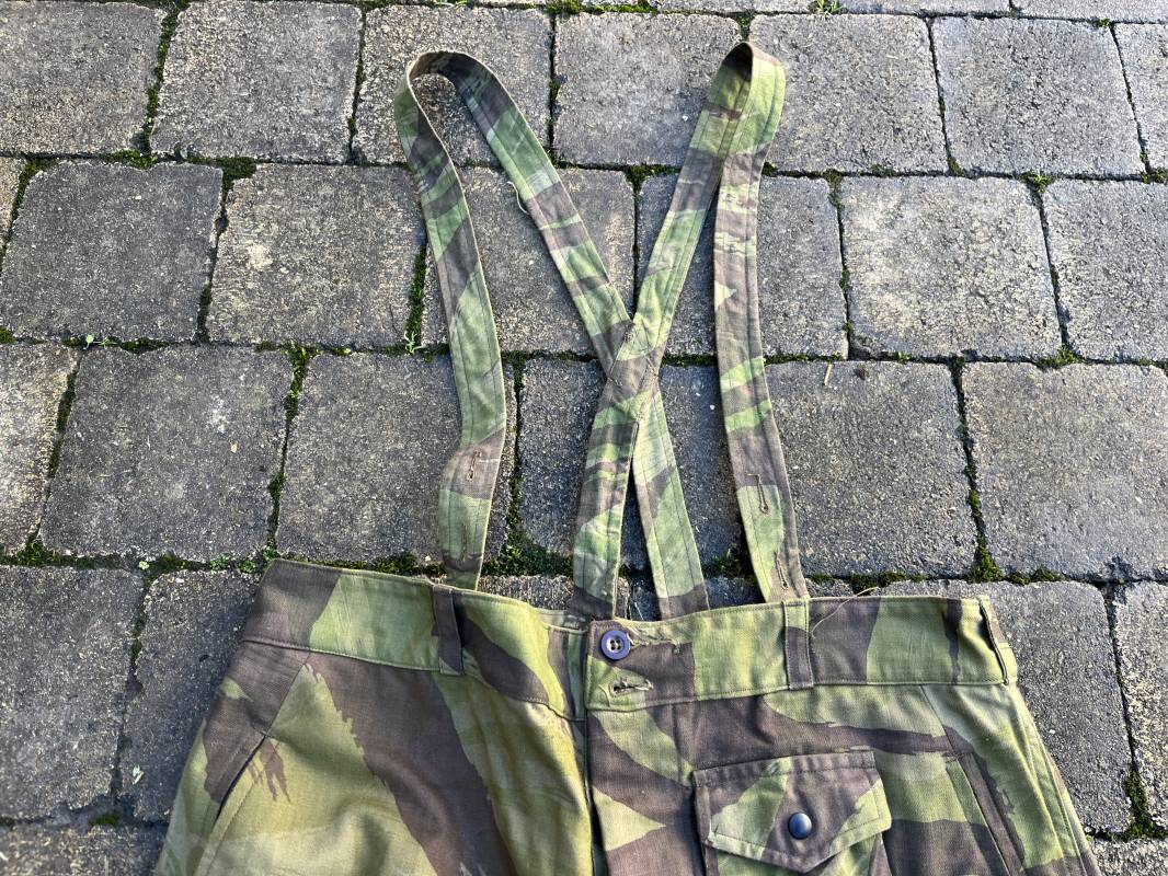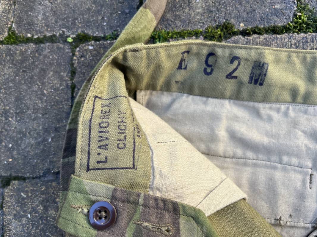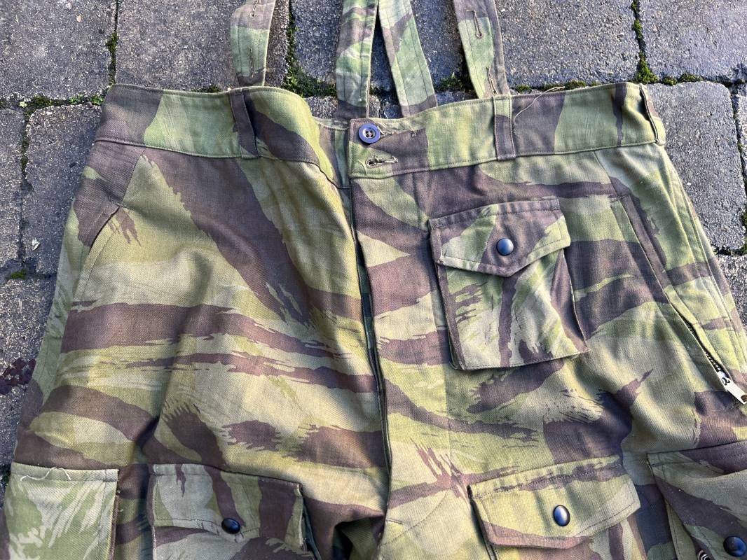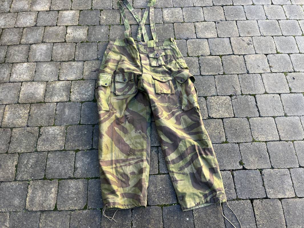 Rare Pantalon de saut camouflé pour parachutiste modéle TAP 47/52 . Deux poches cargo et trois poches à grenades avec rabats à boutons pression . Quatre poches dont deux fessières ,glissière sur une poche d'origine et fonctionnelle fabricant LFF avec tirette en coton ( suspente parachute) . . Deux pattes de serrage latérales avec boucles métalliques . Bas de jambes à lacets . Boutons plastique cousus d'origine . Passants tissu de ceinturon Marquage fabricant L AVIORX CLICHY 1953 Taille E 92 M Taille 46 longueur 110 cm .Paire de bretelles en toile camouflée . Ce rare pantalon de saut est dans un état de conservation exceptionnel . Aucun défaut Rare pantalon parachutiste typique de la Bataille de Dien Bien Phu . Piéce définitive en collection Para Indo Ref 21312