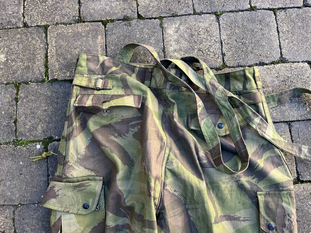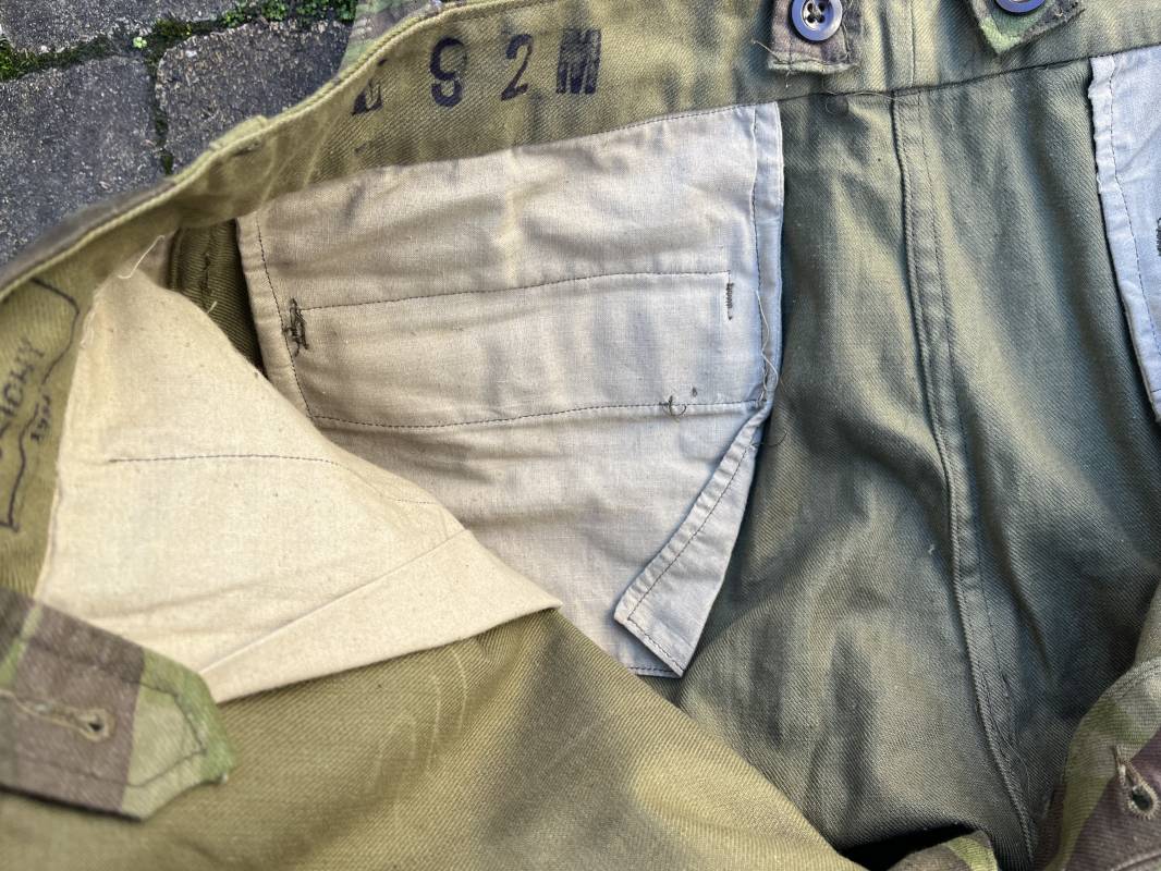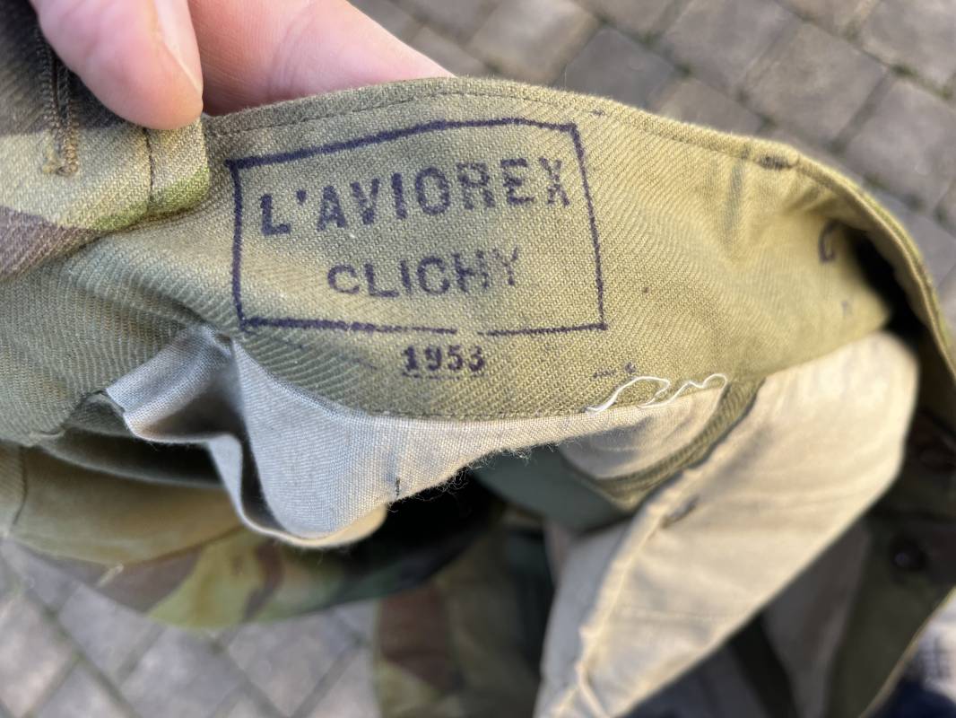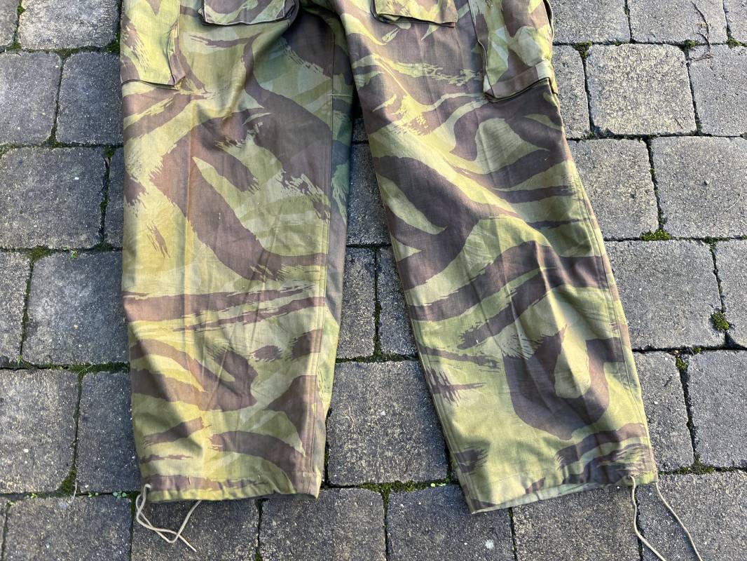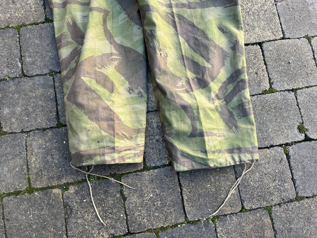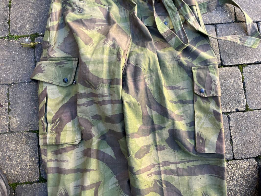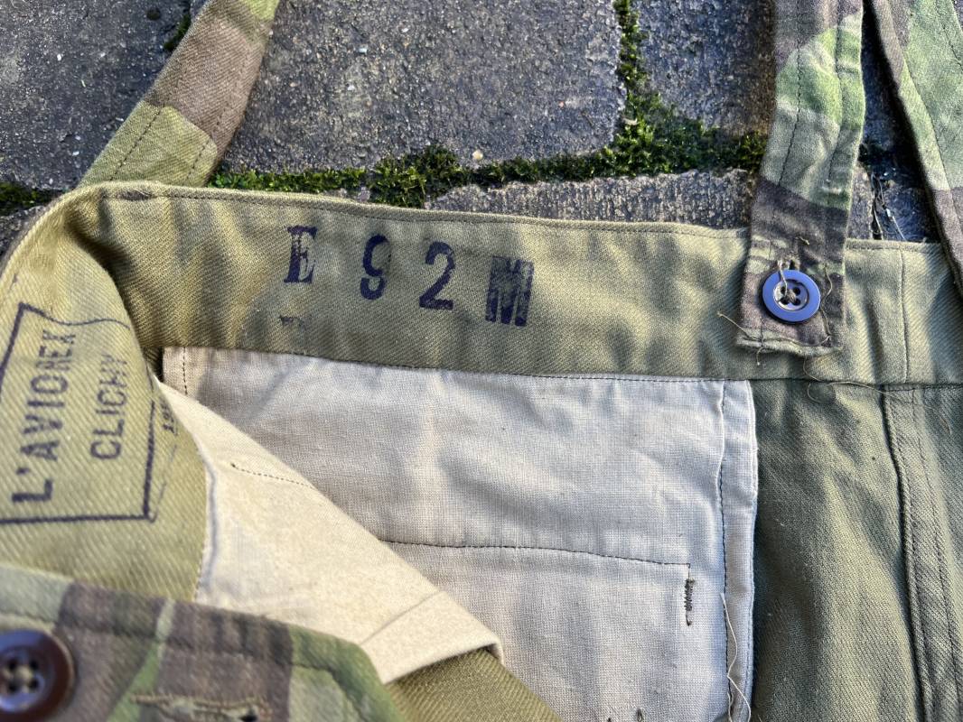 Rare Pantalon de saut camouflé pour parachutiste modéle TAP 47/52 . Deux poches cargo et trois poches à grenades avec rabats à boutons pression . Quatre poches dont deux fessières ,glissière sur une poche d'origine et fonctionnelle fabricant LFF avec tirette en coton ( suspente parachute) . . Deux pattes de serrage latérales avec boucles métalliques . Bas de jambes à lacets . Boutons plastique cousus d'origine . Passants tissu de ceinturon Marquage fabricant L AVIORX CLICHY 1953 Taille E 92 M Taille 46 longueur 110 cm .Paire de bretelles en toile camouflée . Ce rare pantalon de saut est dans un état de conservation exceptionnel . Aucun défaut Rare pantalon parachutiste typique de la Bataille de Dien Bien Phu . Piéce définitive en collection Para Indo Ref 21312