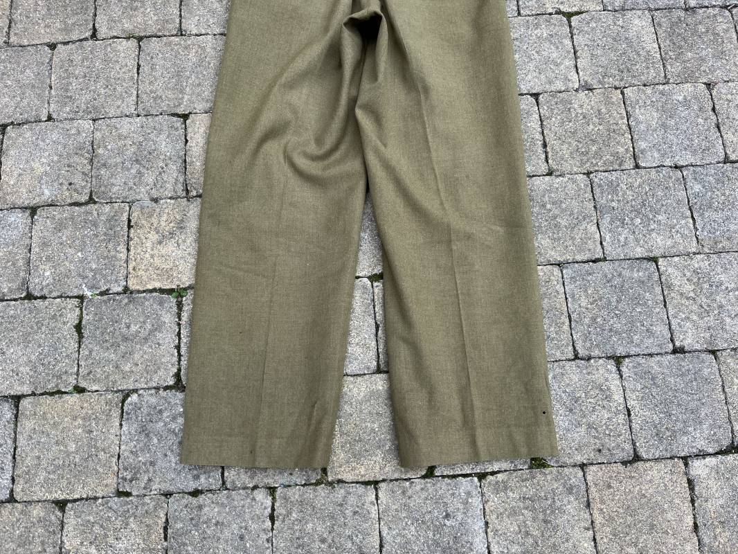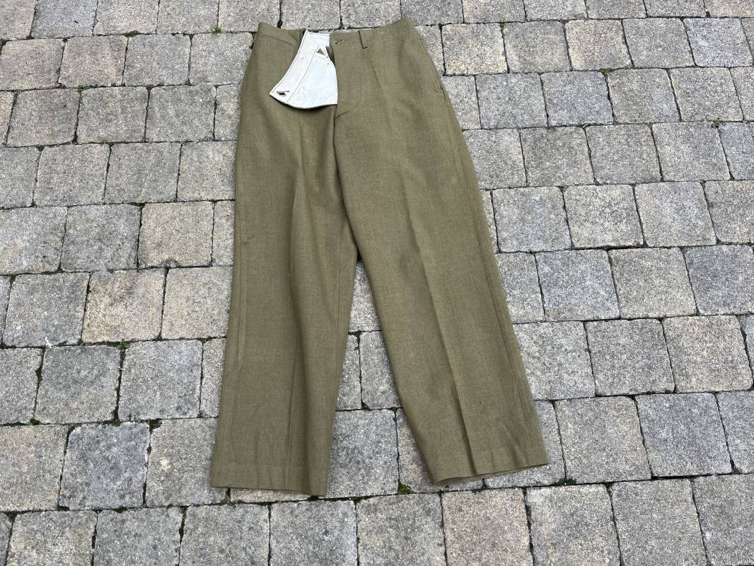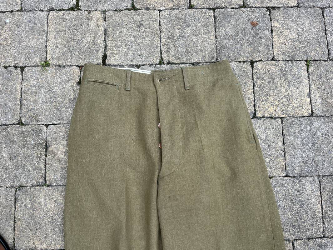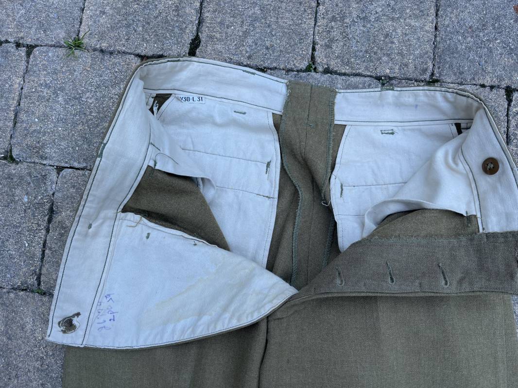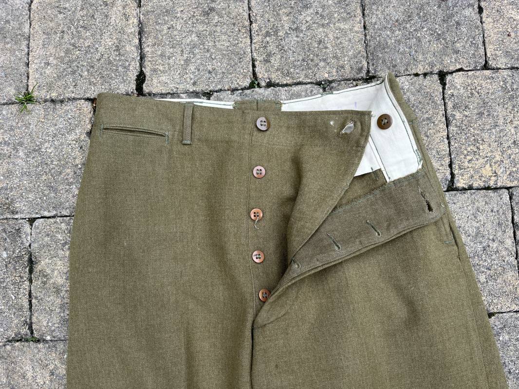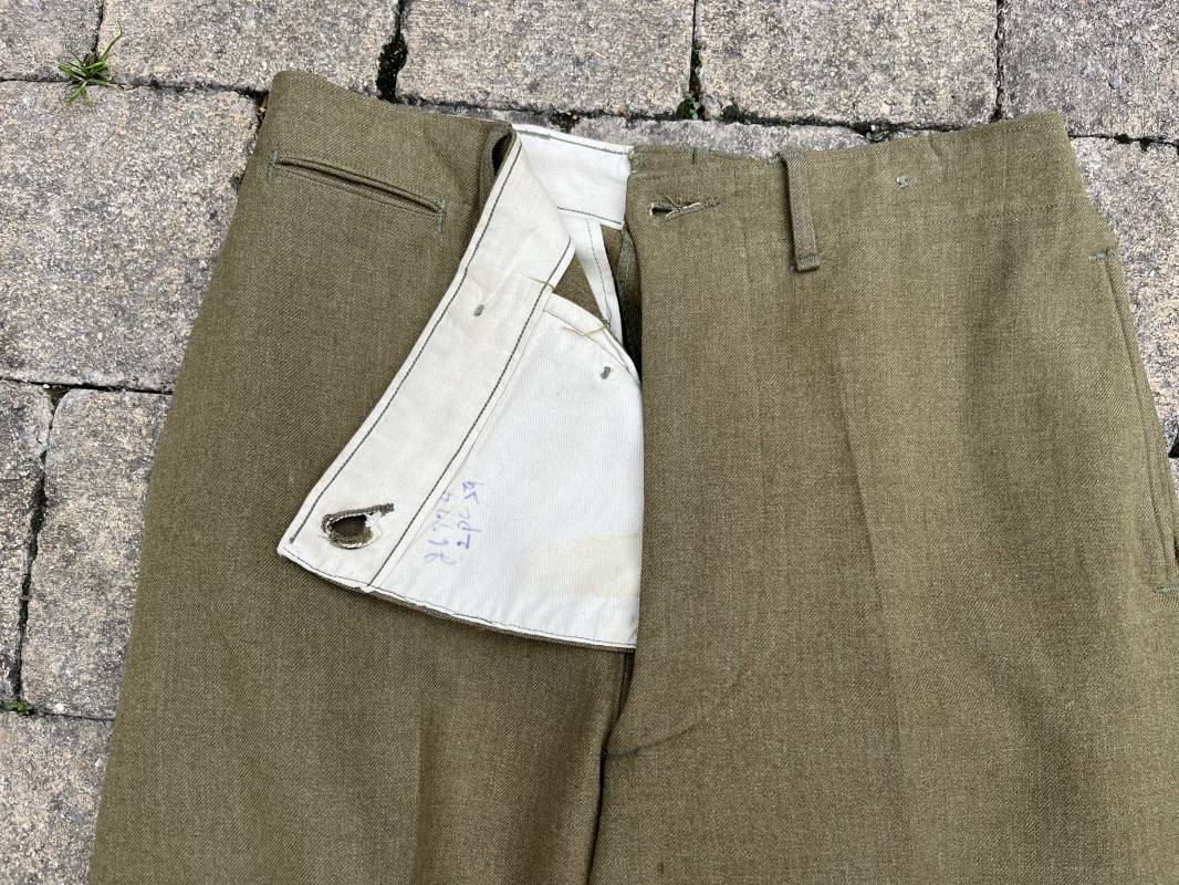 Pantalon modéle 1937 trousers wool serge OD Special . Drap de laine moutarde . Intérieur doublé coton blanc . Passants tissu ceinturon , poche à gousset . Rabat anti gaz . Boutons plastiques cousus d'origine . Etiquette taille W 30 L 31 . Etiquette fabricant présente mais illisible . Matricule manuscrit . Taille 39Longueur 104 cm . Pantalon légérement porté en parfait état . Bon pantalon de combat du GI 1942/44 Ref 21164