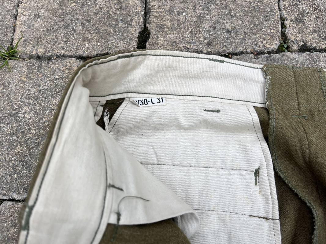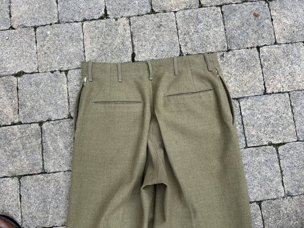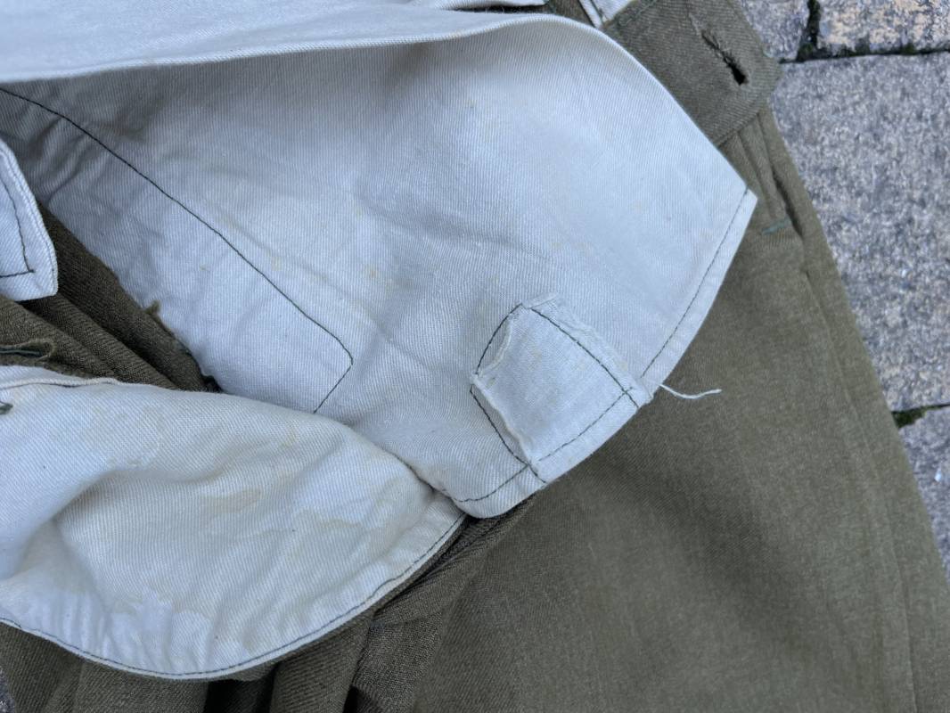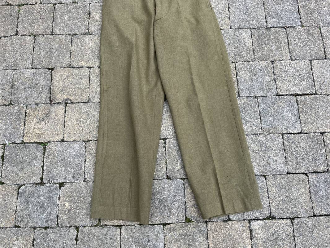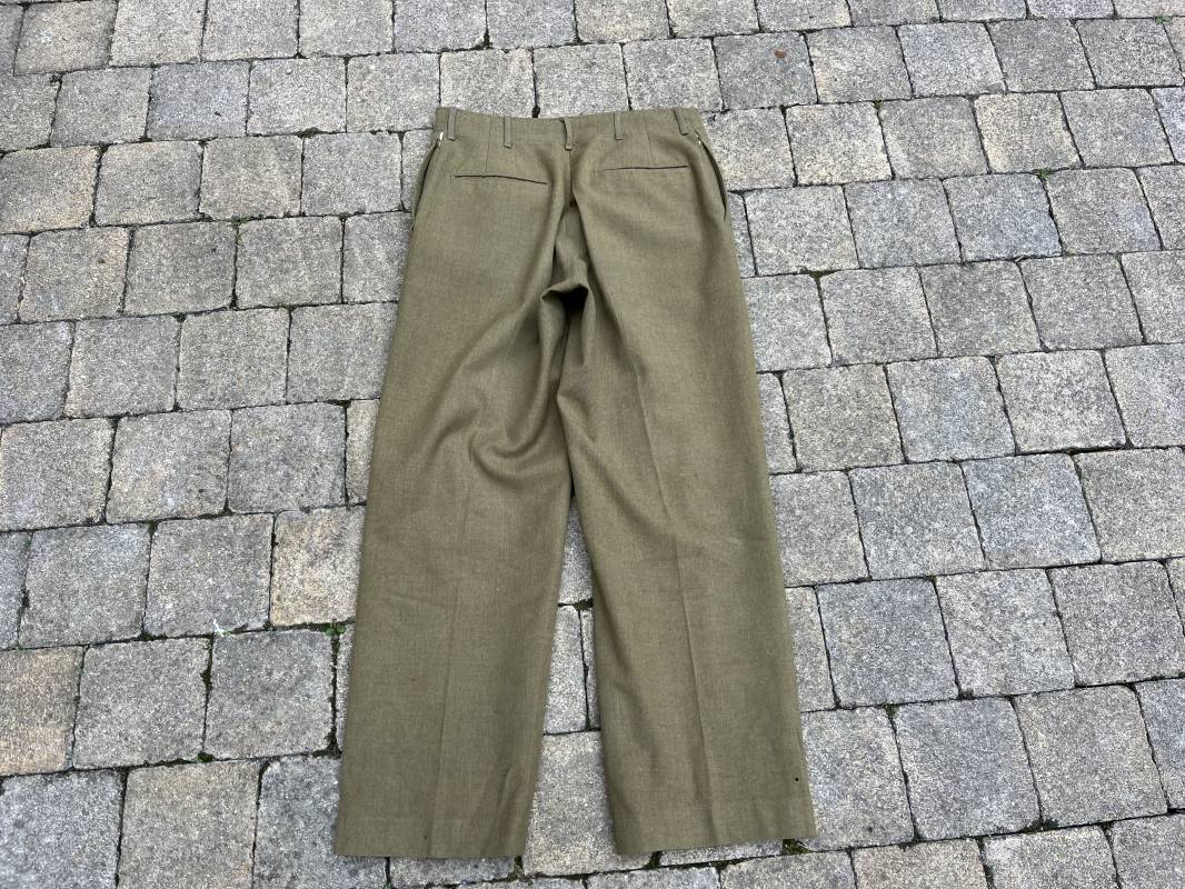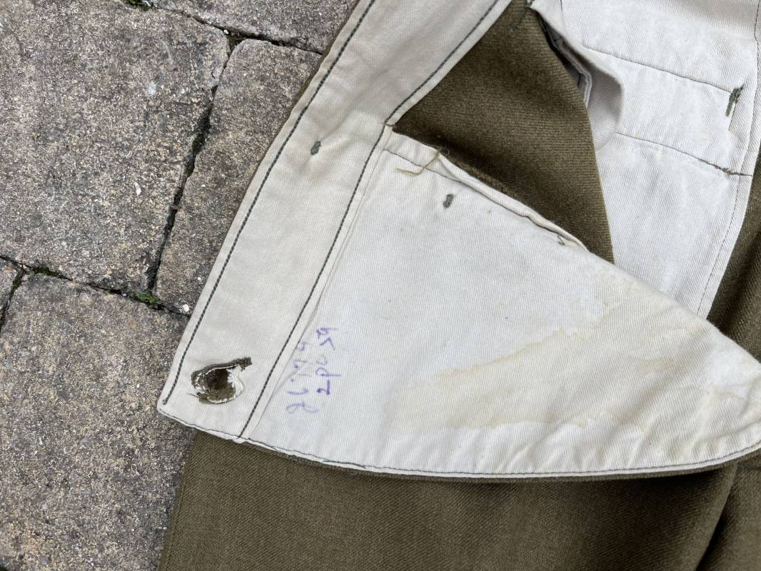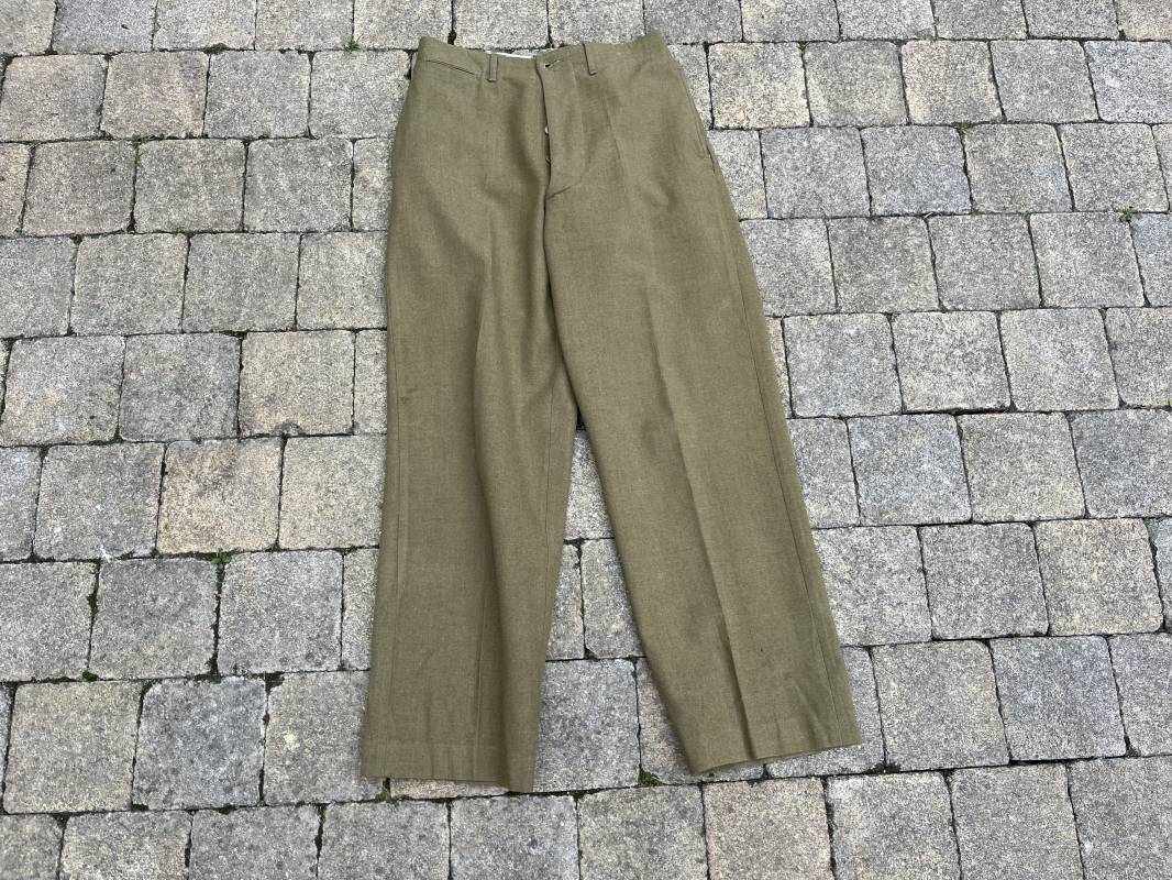 Pantalon modéle 1937 trousers wool serge OD Special . Drap de laine moutarde . Intérieur doublé coton blanc . Passants tissu ceinturon , poche à gousset . Rabat anti gaz . Boutons plastiques cousus d'origine . Etiquette taille W 30 L 31 . Etiquette fabricant présente mais illisible . Matricule manuscrit . Taille 39Longueur 104 cm . Pantalon légérement porté en parfait état . Bon pantalon de combat du GI 1942/44 Ref 21164