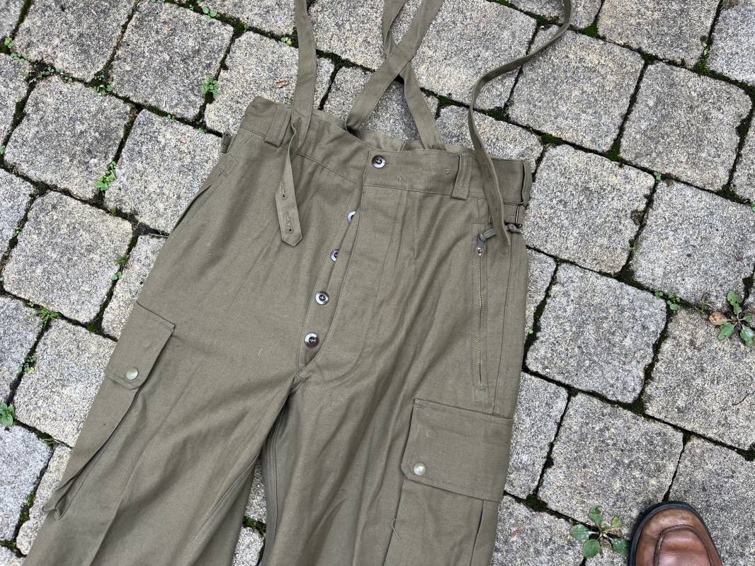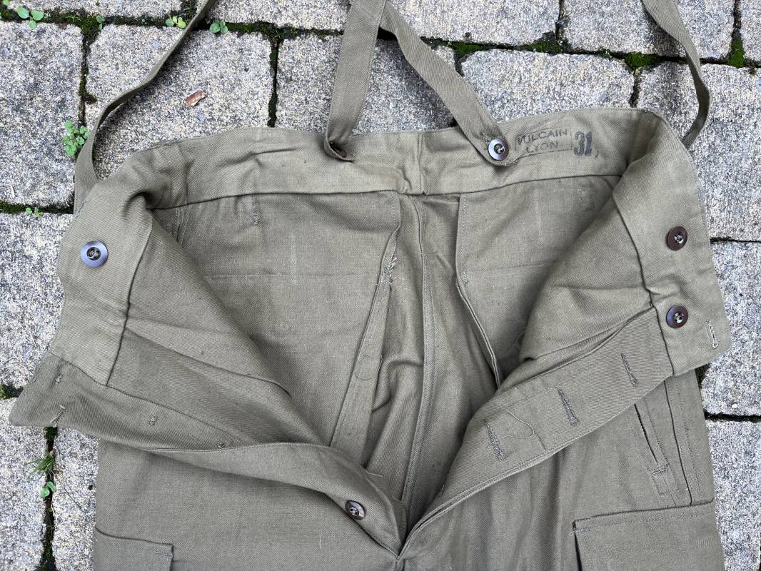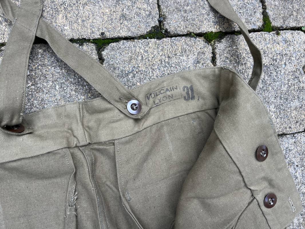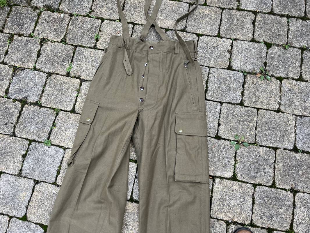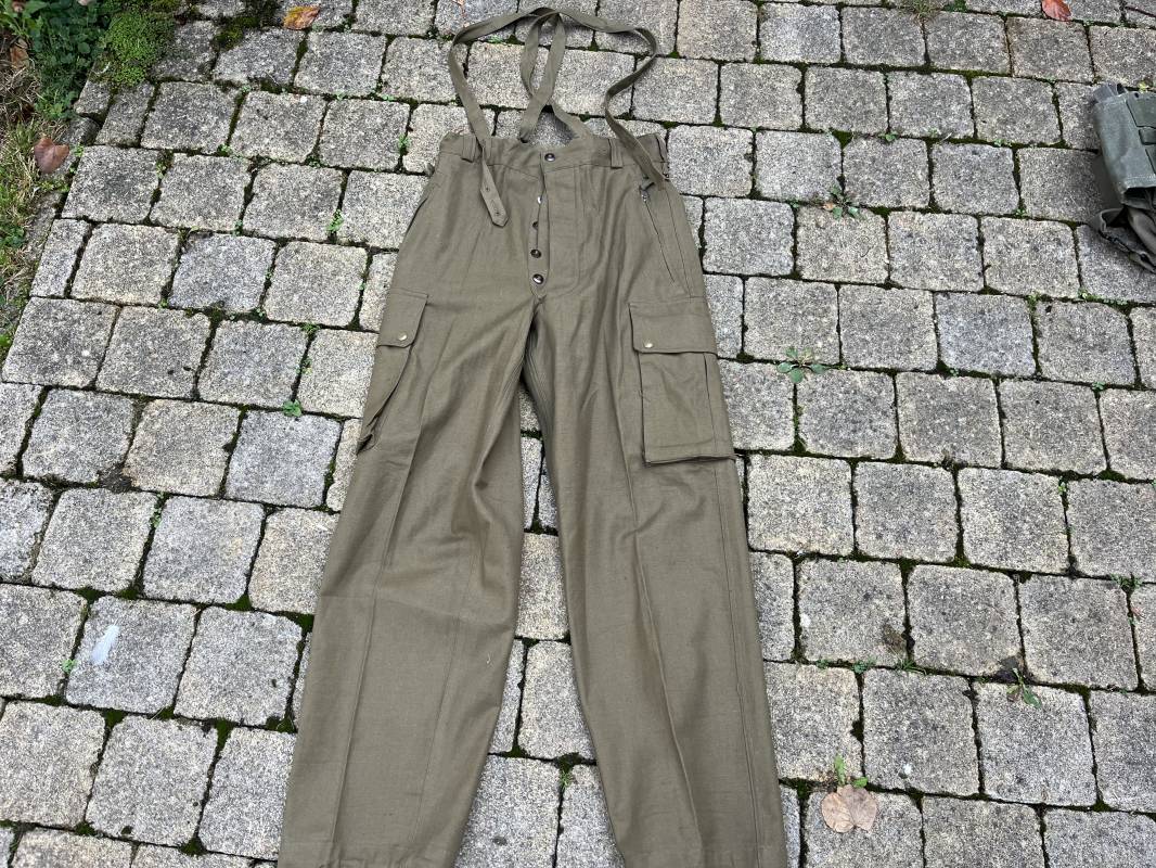 Pantalon de saut Mdle 1947 en coton croisé 320 kaki avec bretelles toile . Deux poches cargo sur les cotés et deux poches fessières a rabats pression . Deux poches lattérales dont une a fermeture par glissière fonctionnelle et d origine avec tirette toile Passants de ceinture en toile . Bas de jambes a lacets en coton . Boutons en plastique pour fermeture de la braguette . Paire de bretelles en toile de coton . Marquage fabricant Vulcain Lyon Daté 4 1954 ARMEE . Taille 41 longueur 115 cm . Pantalon de saut dans un état quasi neuf de stoc . Etat de conservation exceptionnel Ref 21218