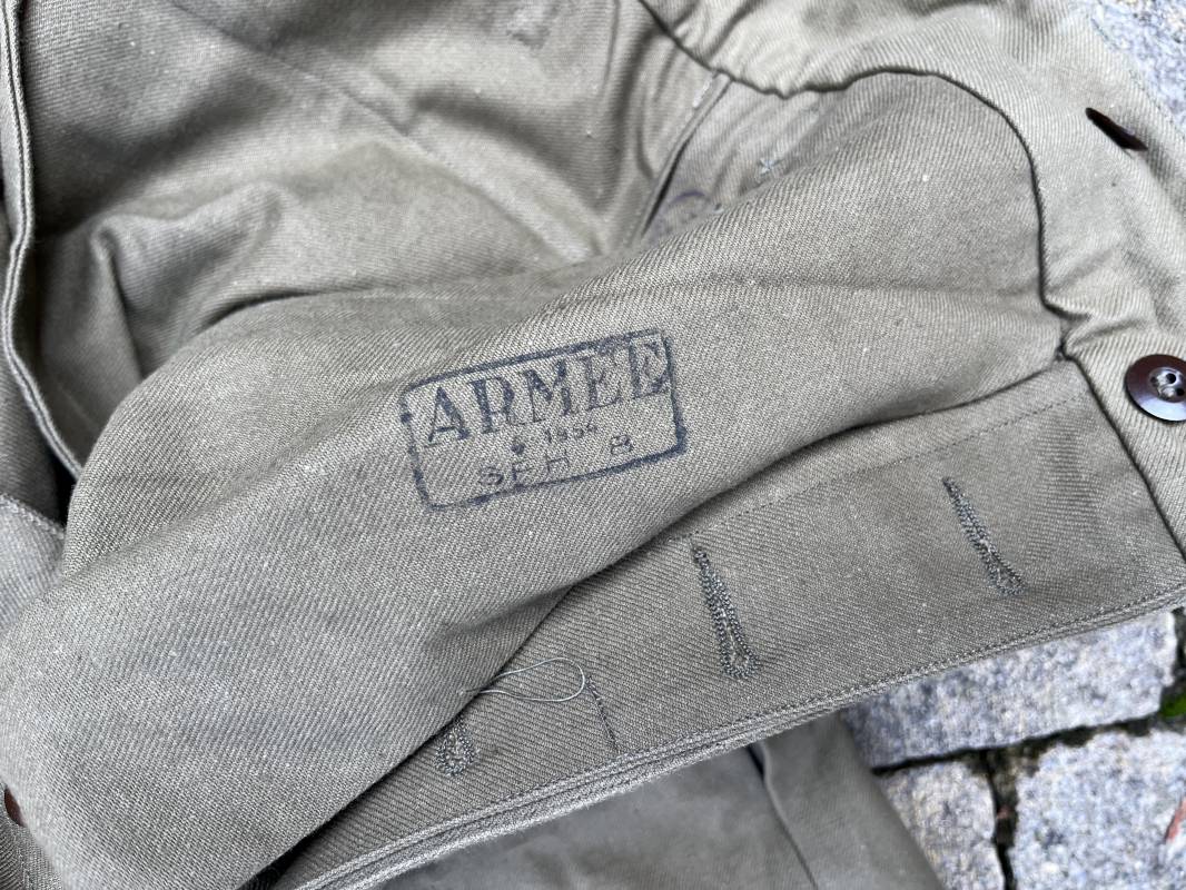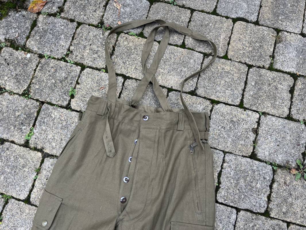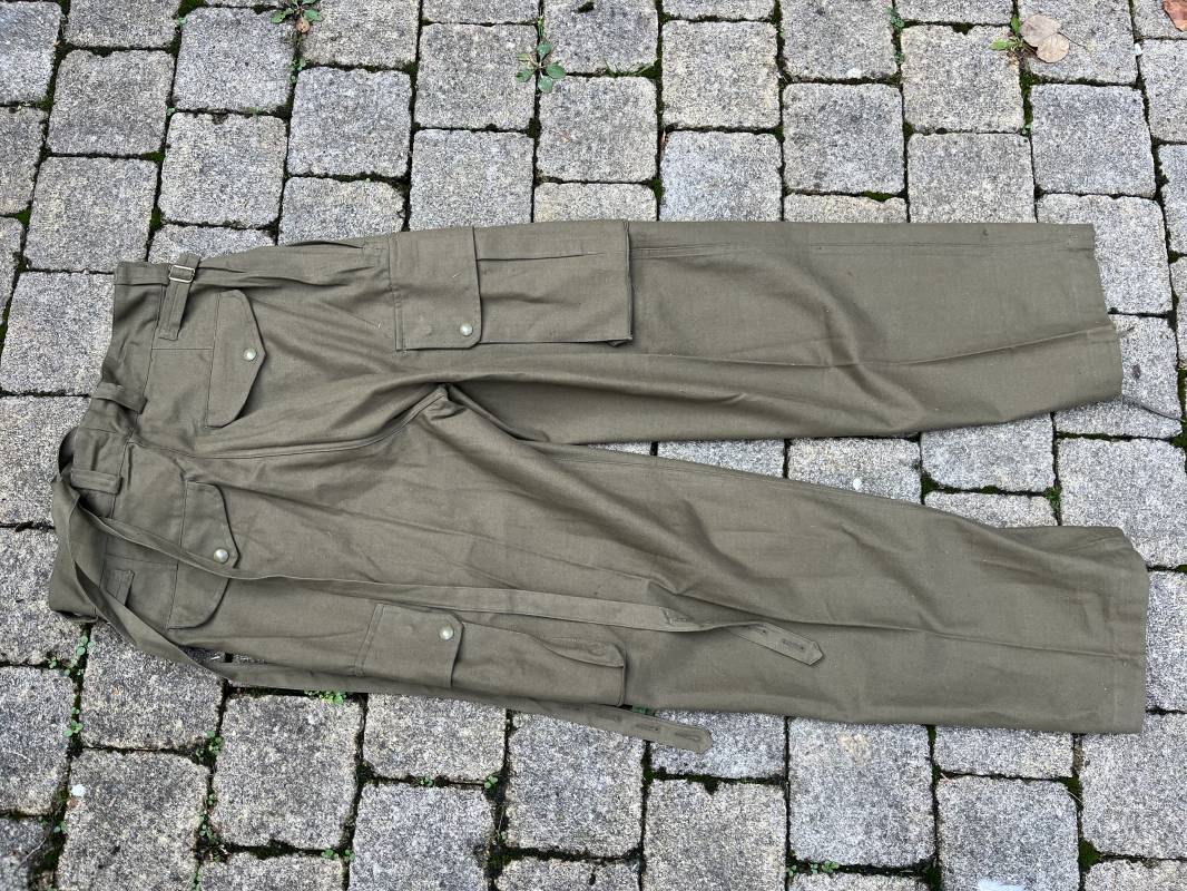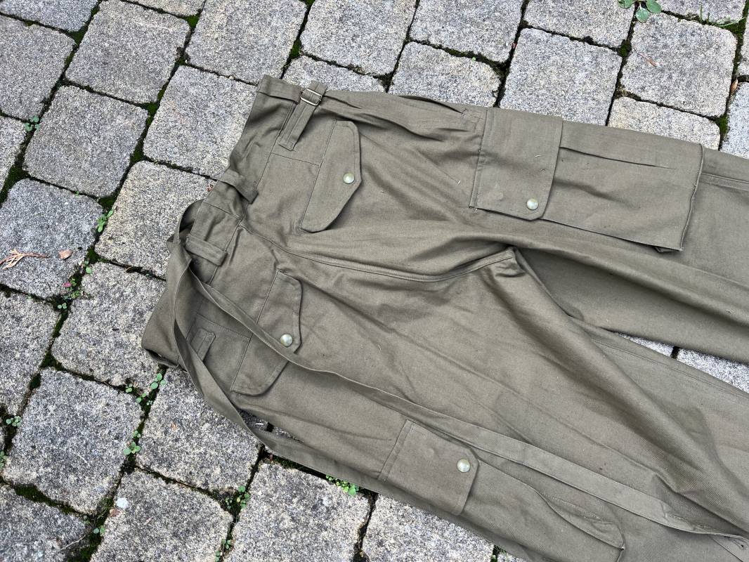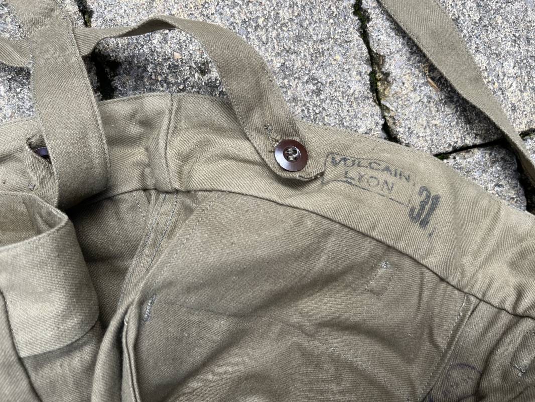 Pantalon de saut Mdle 1947 en coton croisé 320 kaki avec bretelles toile . Deux poches cargo sur les cotés et deux poches fessières a rabats pression . Deux poches lattérales dont une a fermeture par glissière fonctionnelle et d origine avec tirette toile Passants de ceinture en toile . Bas de jambes a lacets en coton . Boutons en plastique pour fermeture de la braguette . Paire de bretelles en toile de coton . Marquage fabricant Vulcain Lyon Daté 4 1954 ARMEE . Taille 41 longueur 115 cm . Pantalon de saut dans un état quasi neuf de stoc . Etat de conservation exceptionnel Ref 21218