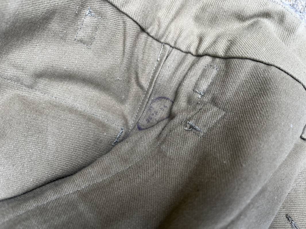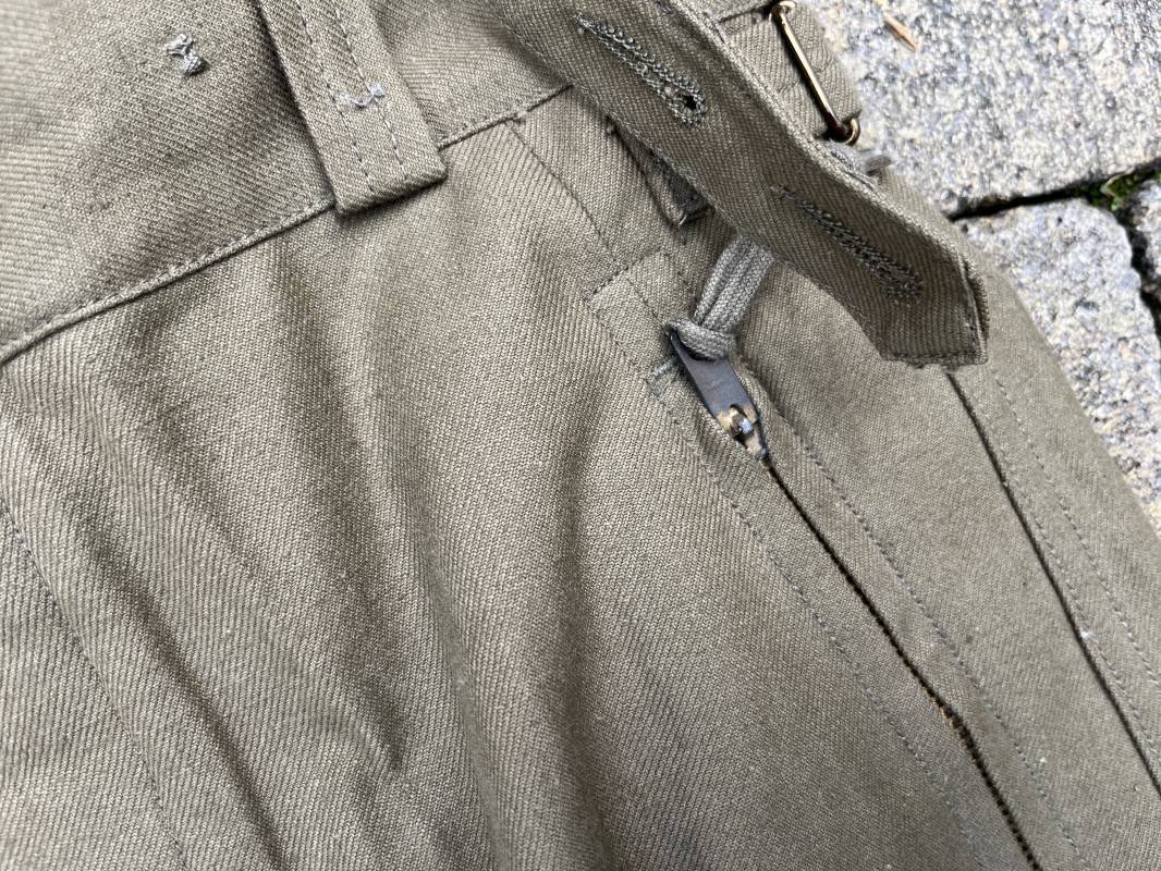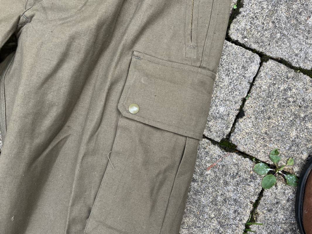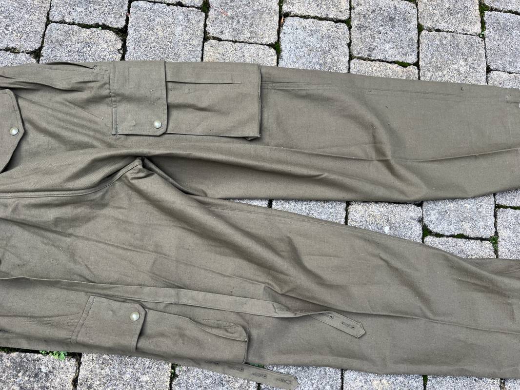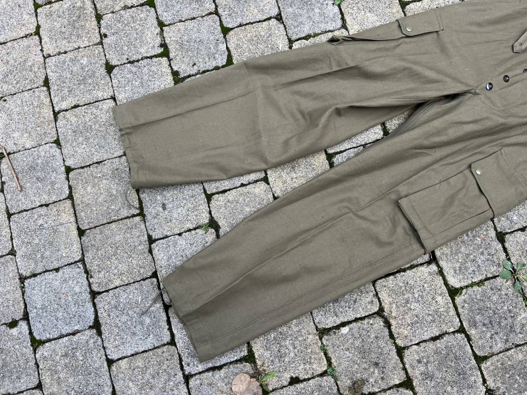 Pantalon de saut Mdle 1947 en coton croisé 320 kaki avec bretelles toile . Deux poches cargo sur les cotés et deux poches fessières a rabats pression . Deux poches lattérales dont une a fermeture par glissière fonctionnelle et d origine avec tirette toile Passants de ceinture en toile . Bas de jambes a lacets en coton . Boutons en plastique pour fermeture de la braguette . Paire de bretelles en toile de coton . Marquage fabricant Vulcain Lyon Daté 4 1954 ARMEE . Taille 41 longueur 115 cm . Pantalon de saut dans un état quasi neuf de stoc . Etat de conservation exceptionnel Ref 21218