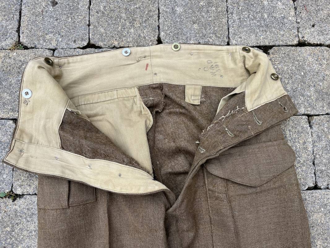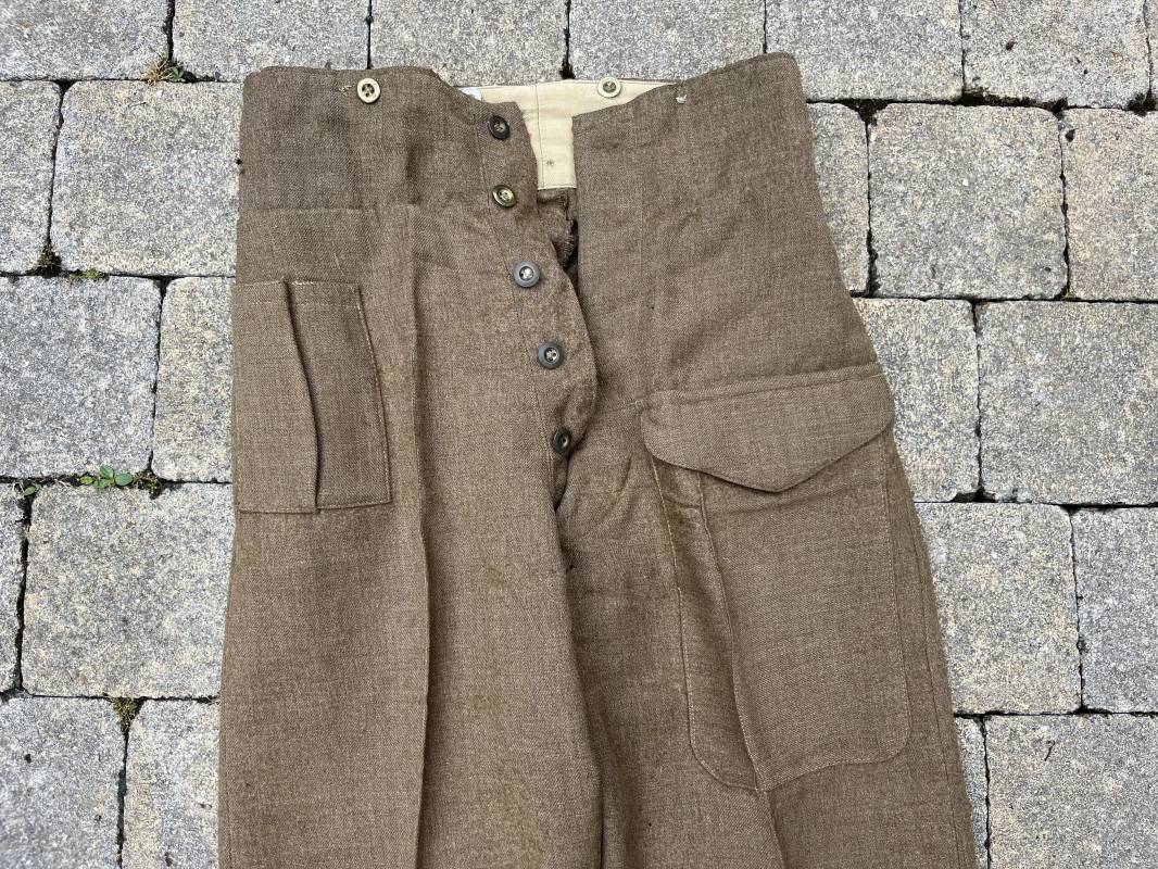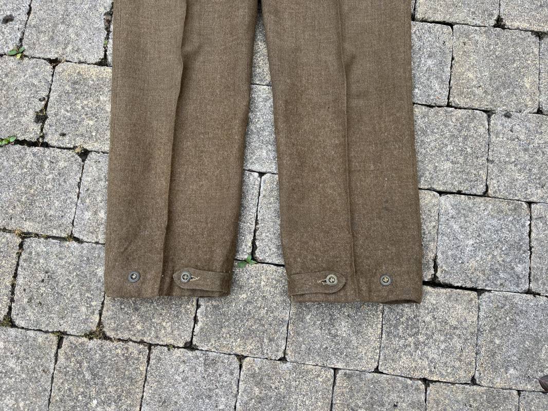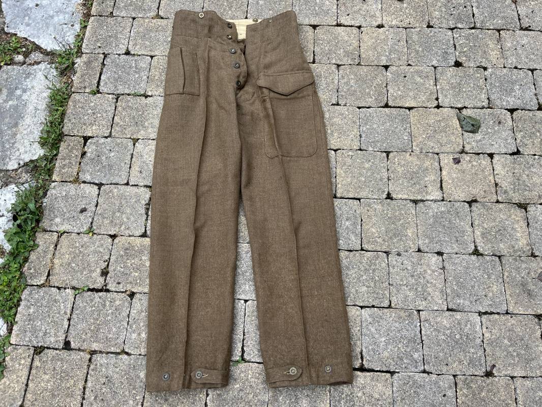 Beau pantalon réglementaire Pattern 1937 en drap kaki. Ce pantalon de dotation de l'Armée anglaise a été trouvé a CAEN en brocante il y a 30 ans . Pantalon réglementaire avec poche de cuisse, poche à pansement, deux poches lattérales, poche fessière à rabat. Passants de ceinturon en drap . Boutons en laiton cousus d'origine . Pattes de serrages en drap en bas de chaque jambes Intérieur doublé toile de coton beige. Marquage WD et flèche code 391 lettre 0 (pour année 1942). Pantalon légèrement porté . Drap très frais . Taille 38. Longueur 112 cm. Trés belle patine generale . Drap tres frais quelques legers petits trous de mites ( voir photos , ce panatalon n'a jamais été restauré . Ref Ref 19694