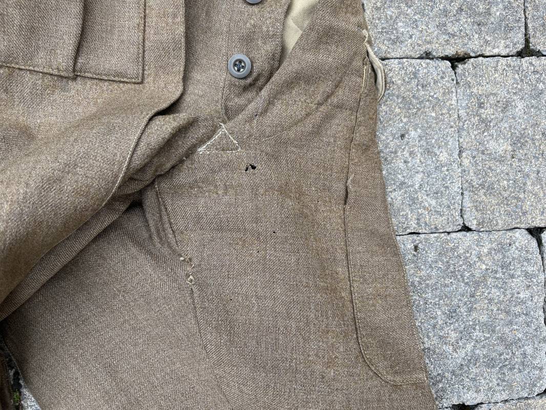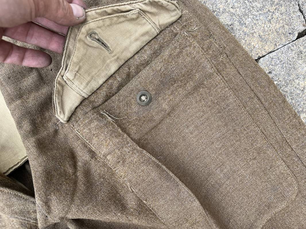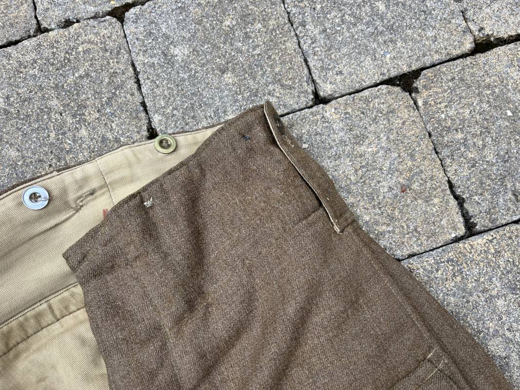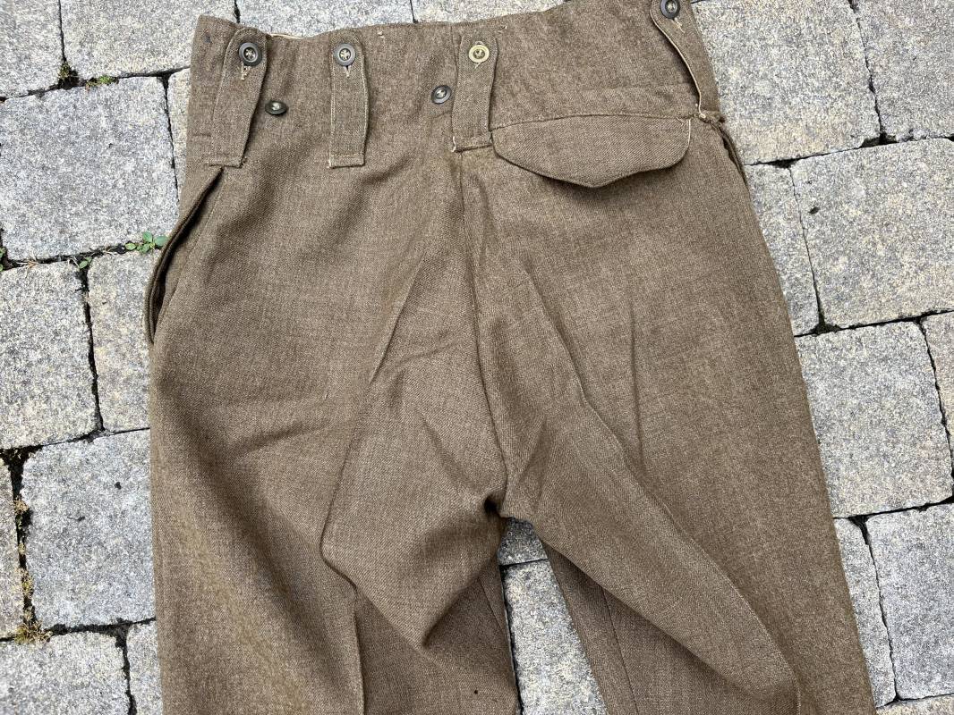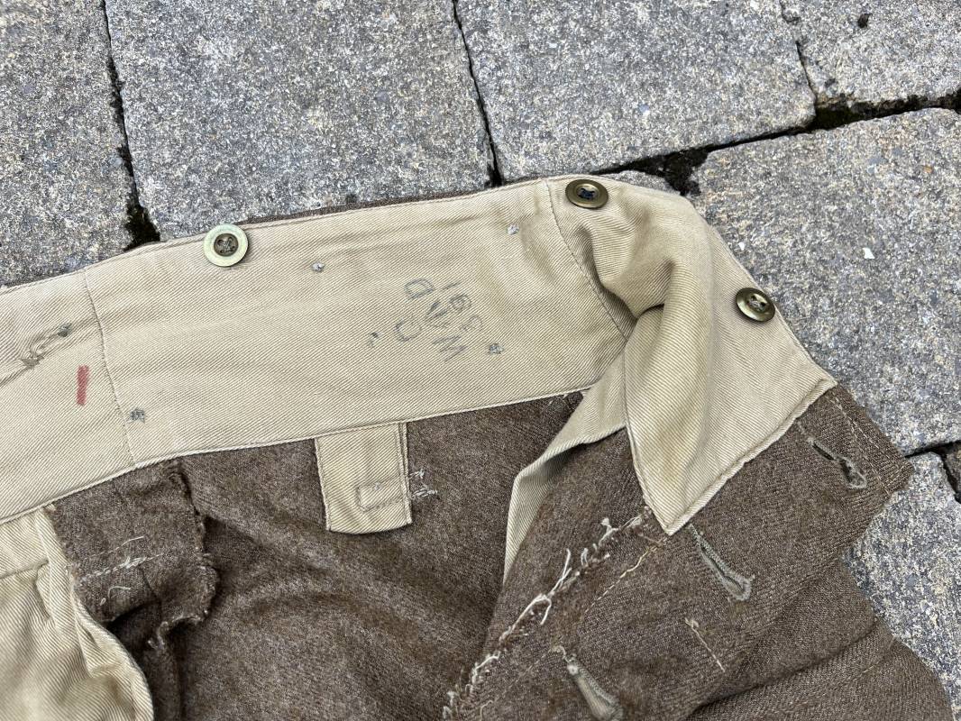 Beau pantalon réglementaire Pattern 1937 en drap kaki. Ce pantalon de dotation de l'Armée anglaise a été trouvé a CAEN en brocante il y a 30 ans . Pantalon réglementaire avec poche de cuisse, poche à pansement, deux poches lattérales, poche fessière à rabat. Passants de ceinturon en drap . Boutons en laiton cousus d'origine . Pattes de serrages en drap en bas de chaque jambes Intérieur doublé toile de coton beige. Marquage WD et flèche code 391 lettre 0 (pour année 1942). Pantalon légèrement porté . Drap très frais . Taille 38. Longueur 112 cm. Trés belle patine generale . Drap tres frais quelques legers petits trous de mites ( voir photos , ce panatalon n'a jamais été restauré . Ref Ref 19694