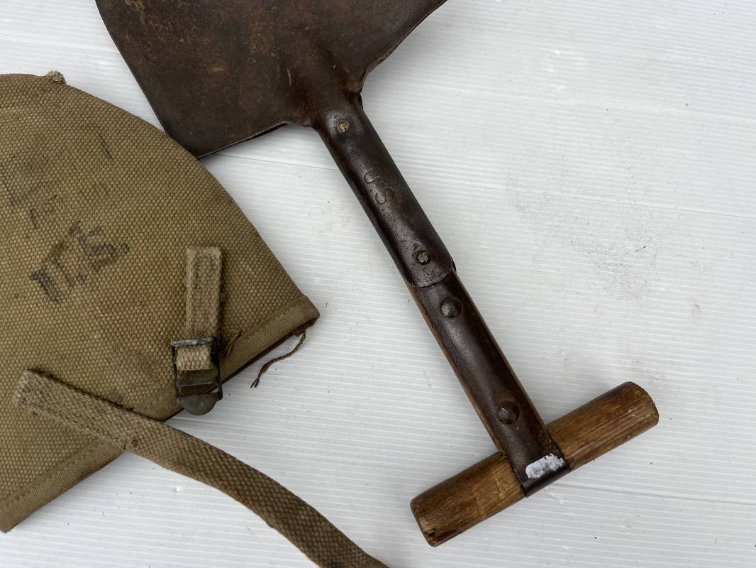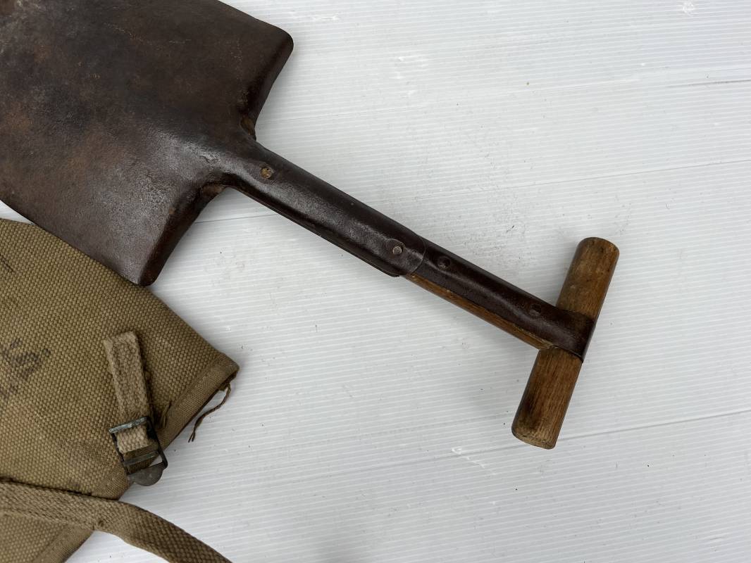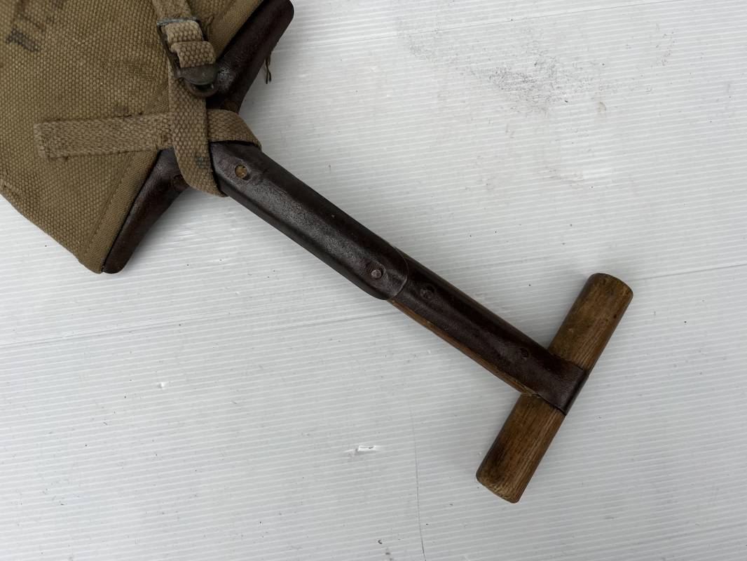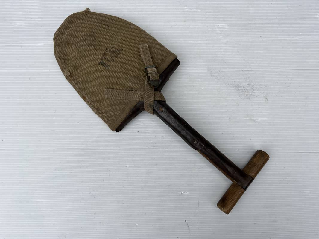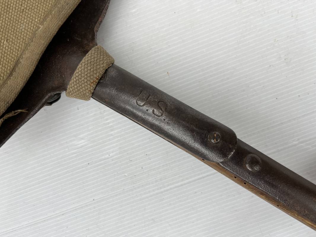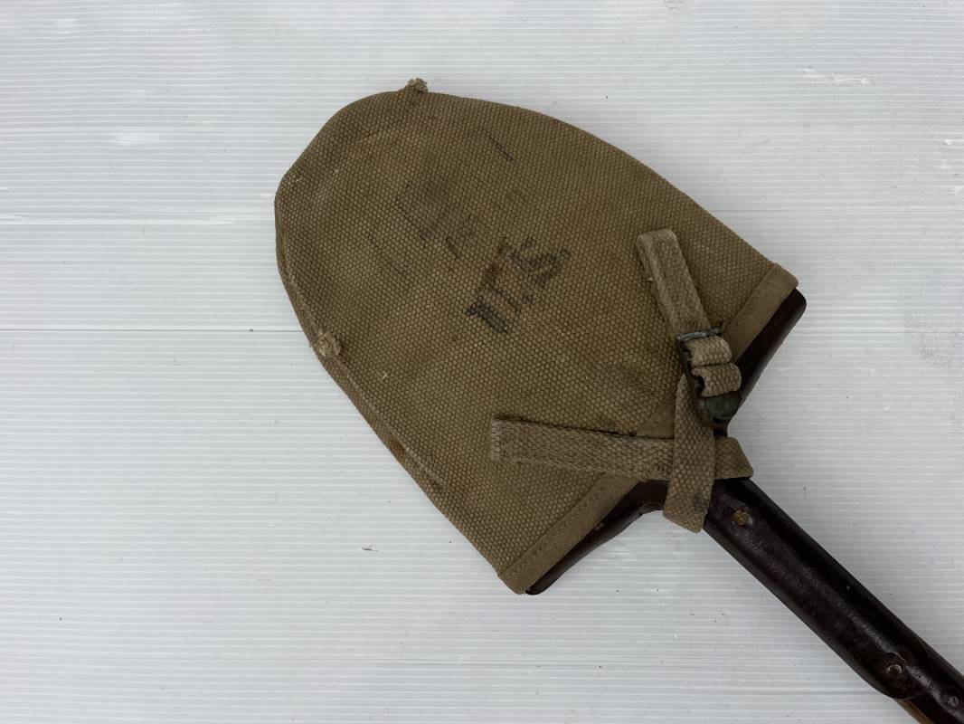 Rare pelle Mdle 1910 droite dont le manche a été raccourci pour reduire l'encombrement , ce mode de transformation est typique des unités parachutistes americaine . Pelle droite individuelle Américaine modèle 1910 et son étui toile. Pelle avec manche bois en T. Marquage US sur tube métallique . Housse en toile de coton filé olive drab. Crochet fer de suspension. Marquage US et fabricant daté 1942 . Sangle en toile, boucle métallique. bel ensemble utilisé 100 % dans son jus . Ce rare outil individuel a été trouvé en brocante en région parisienne . 1942/45. Ref 21066