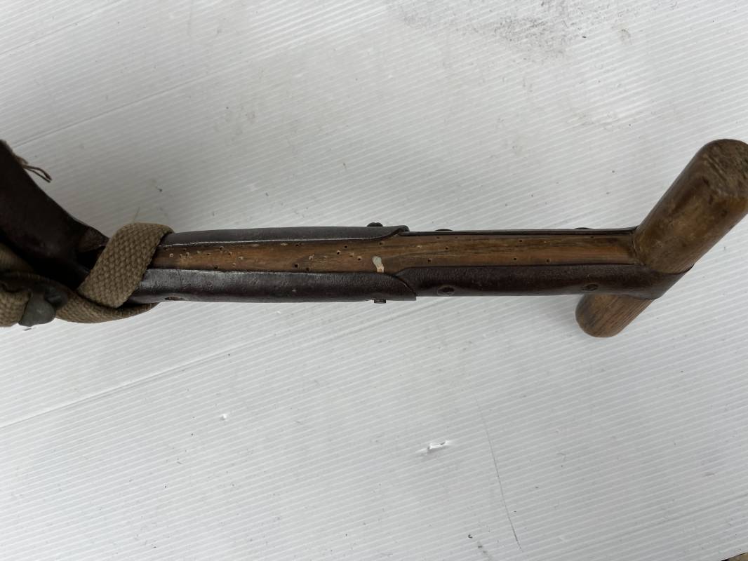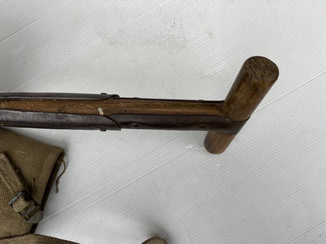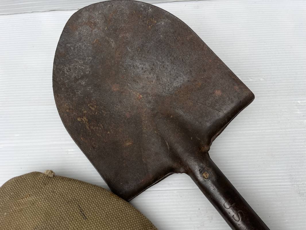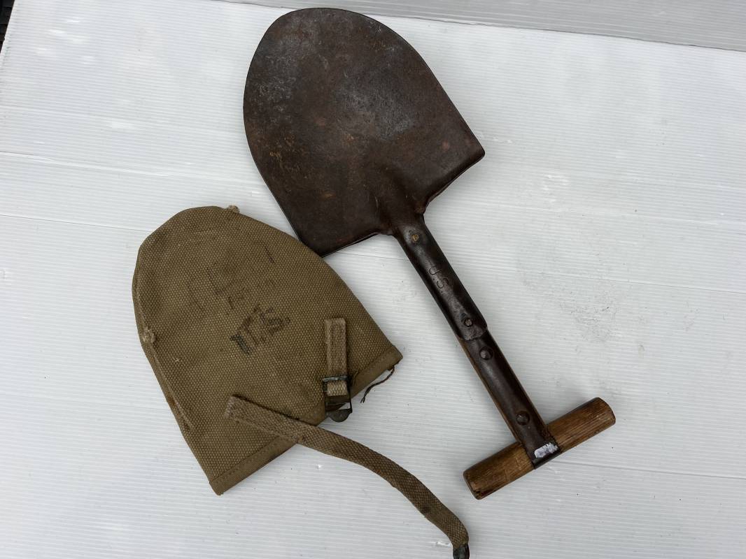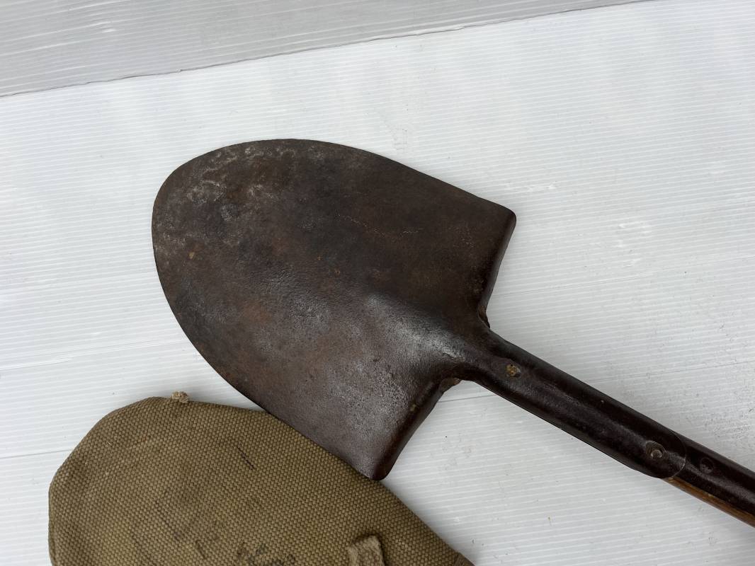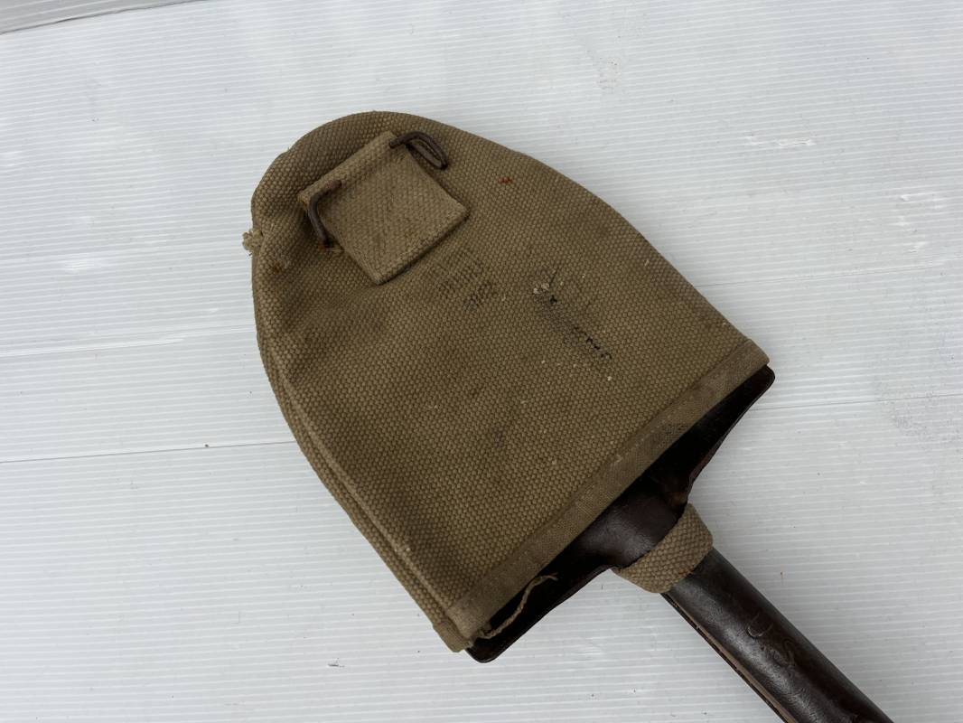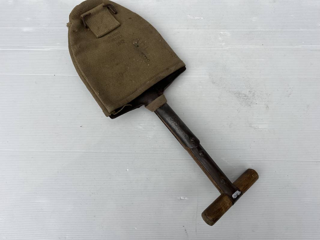 Rare pelle Mdle 1910 droite dont le manche a été raccourci pour reduire l'encombrement , ce mode de transformation est typique des unités parachutistes americaine . Pelle droite individuelle Américaine modèle 1910 et son étui toile. Pelle avec manche bois en T. Marquage US sur tube métallique . Housse en toile de coton filé olive drab. Crochet fer de suspension. Marquage US et fabricant daté 1942 . Sangle en toile, boucle métallique. bel ensemble utilisé 100 % dans son jus . Ce rare outil individuel a été trouvé en brocante en région parisienne . 1942/45. Ref 21066
