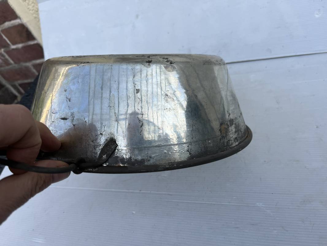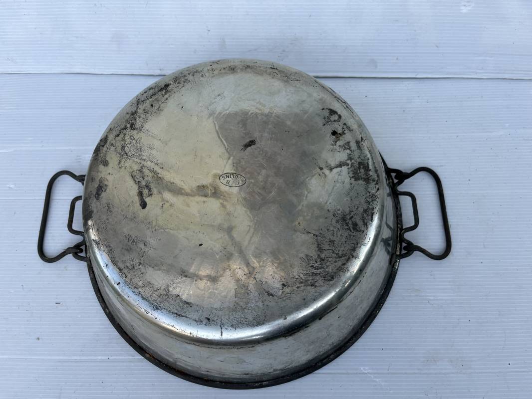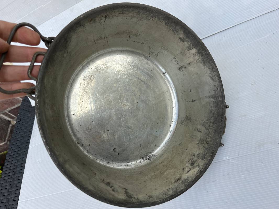 Plat à quatre en fer étamé pour soldats en campagne. Marquage fabricant au cul 'C.B. Moulin '. Passants métalliques de fixation au sac à dos. Poignées métalliques articulées. Légèrement utilisé en parfait état 191418. Ref 19760