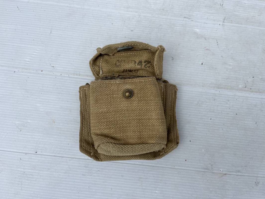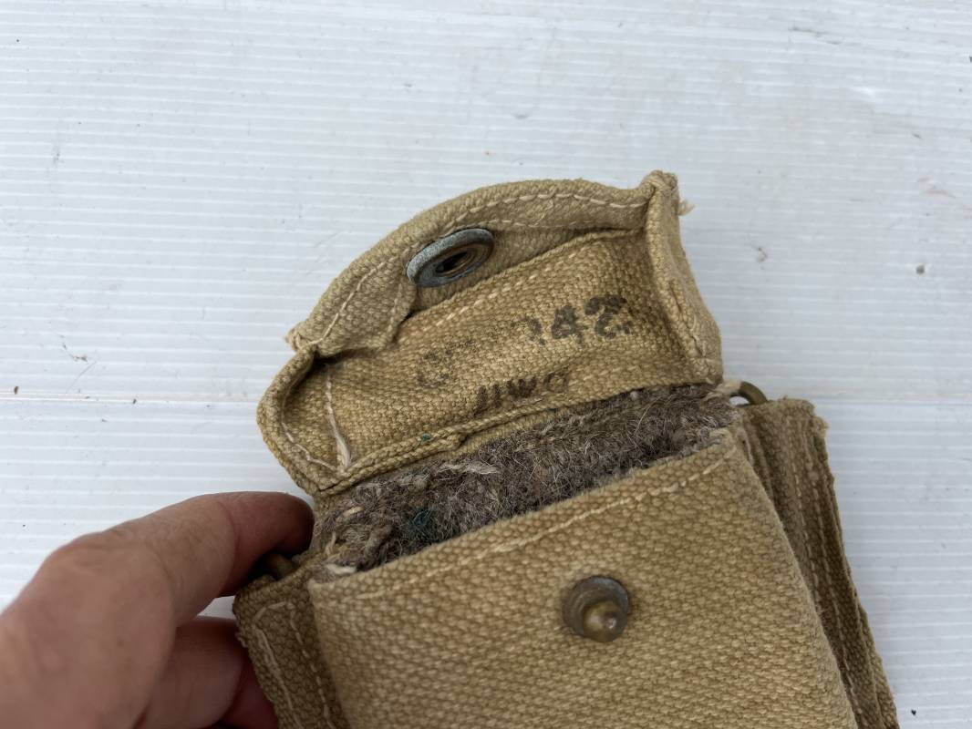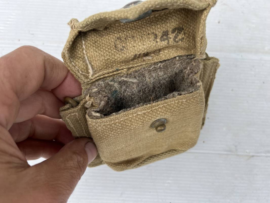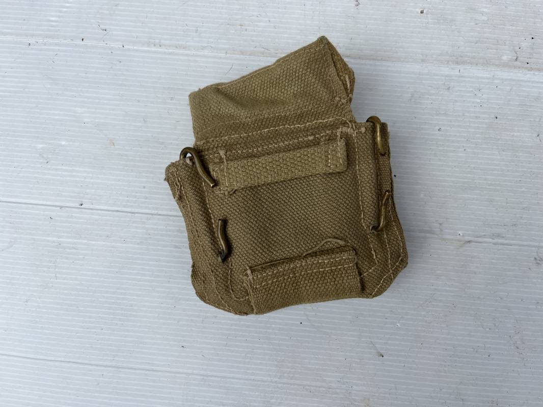 Pochette à boussole pattern 1937 en coton filet beige . Rabat avec bouton pression , crochets laiton de fixation . Passants toile . Intérieur doublé en feutrine marron , legerement portée n parfait état Ref 22104