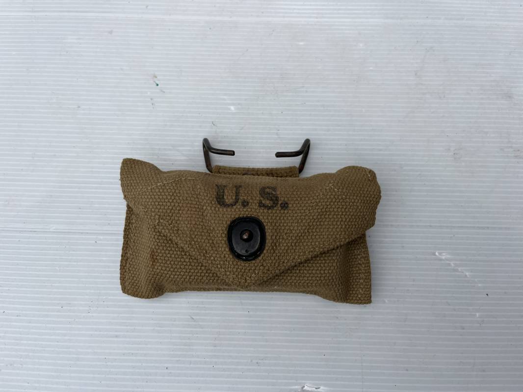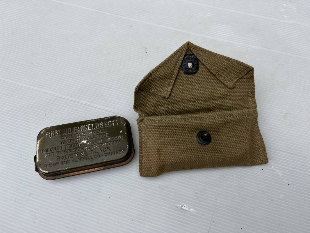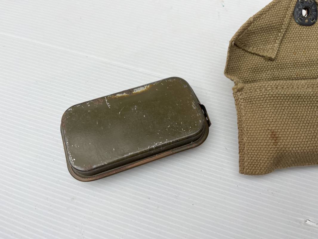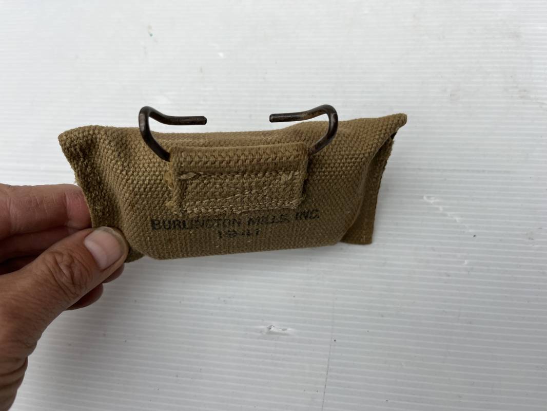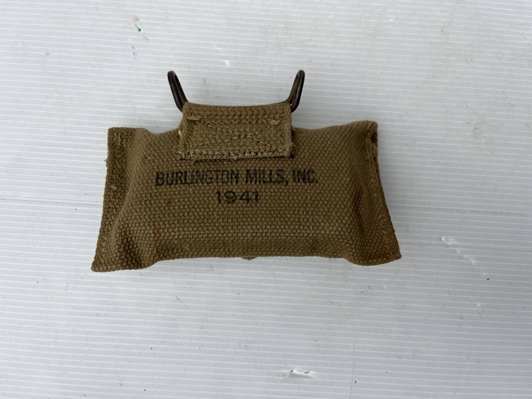 Pochette en coton filé modéle 1924 à pansement individuel . Teinte olive drab , un seul bouton pression , crochet métallique de suspension . Marquage fabricant 'Burlington Mills 1941' . Boite métallique Carlisle Modéle contenant un pansement individuel . Boite peinte en kaki d'origine . Bel ensemble homogéne en pafait état Ref 19301