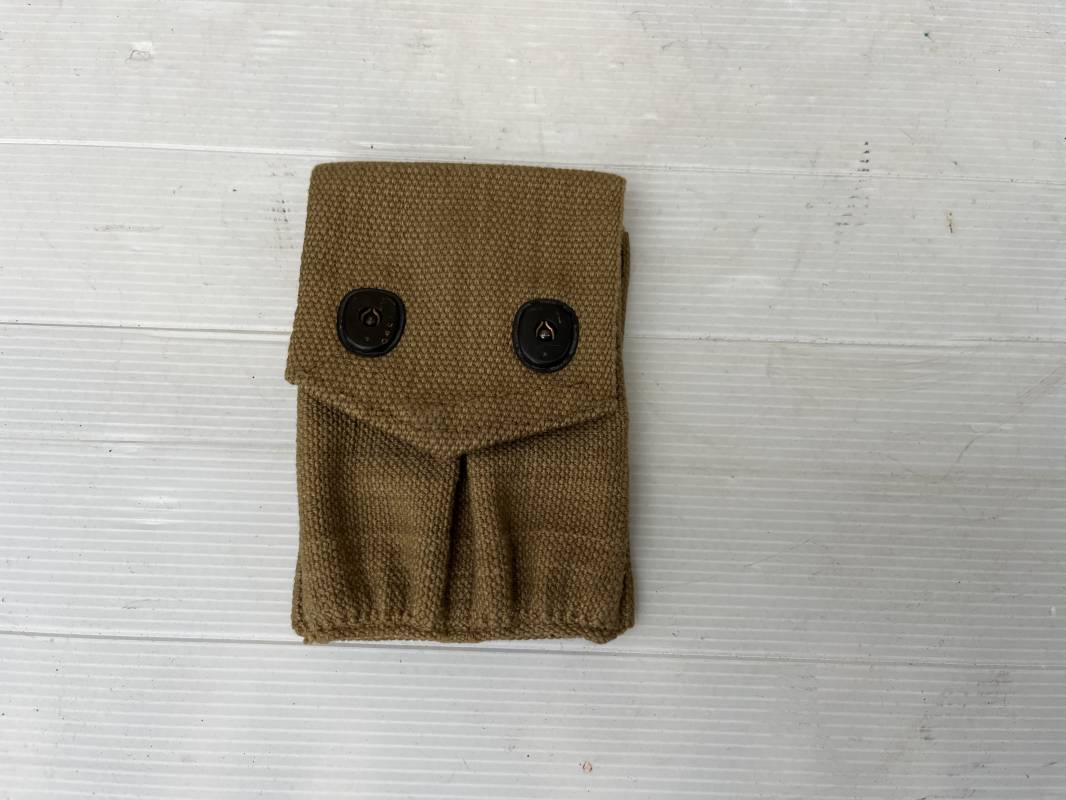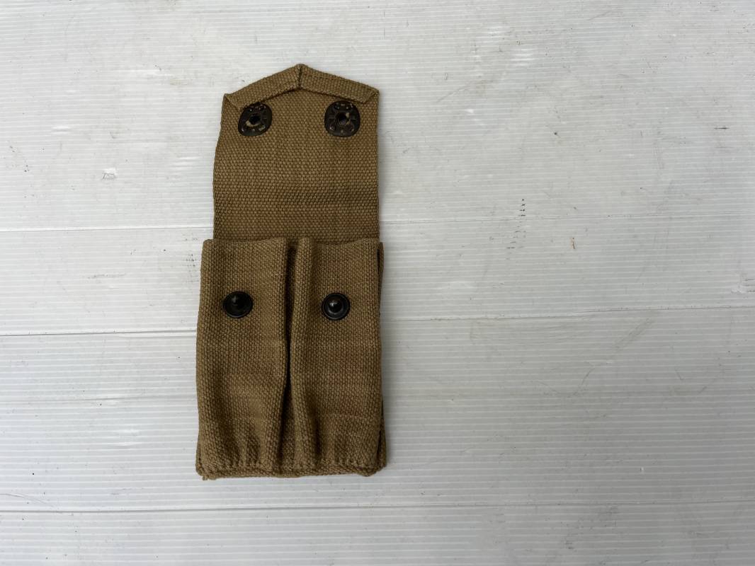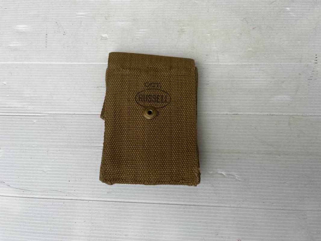 Pochette modèle 1912 porte chargeurs Colt 45 en coton filé beige . Pochette avec bouton pression de fixation au ceinturon. Deux boutons pressions de fermeture . Marquage fabricant Russel Oct 1918 ( date masque par bouton pression de ceinturon ) . Parfait état. Ref 5395