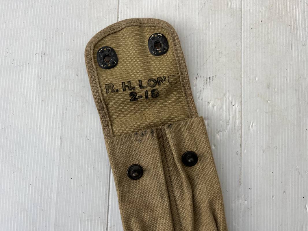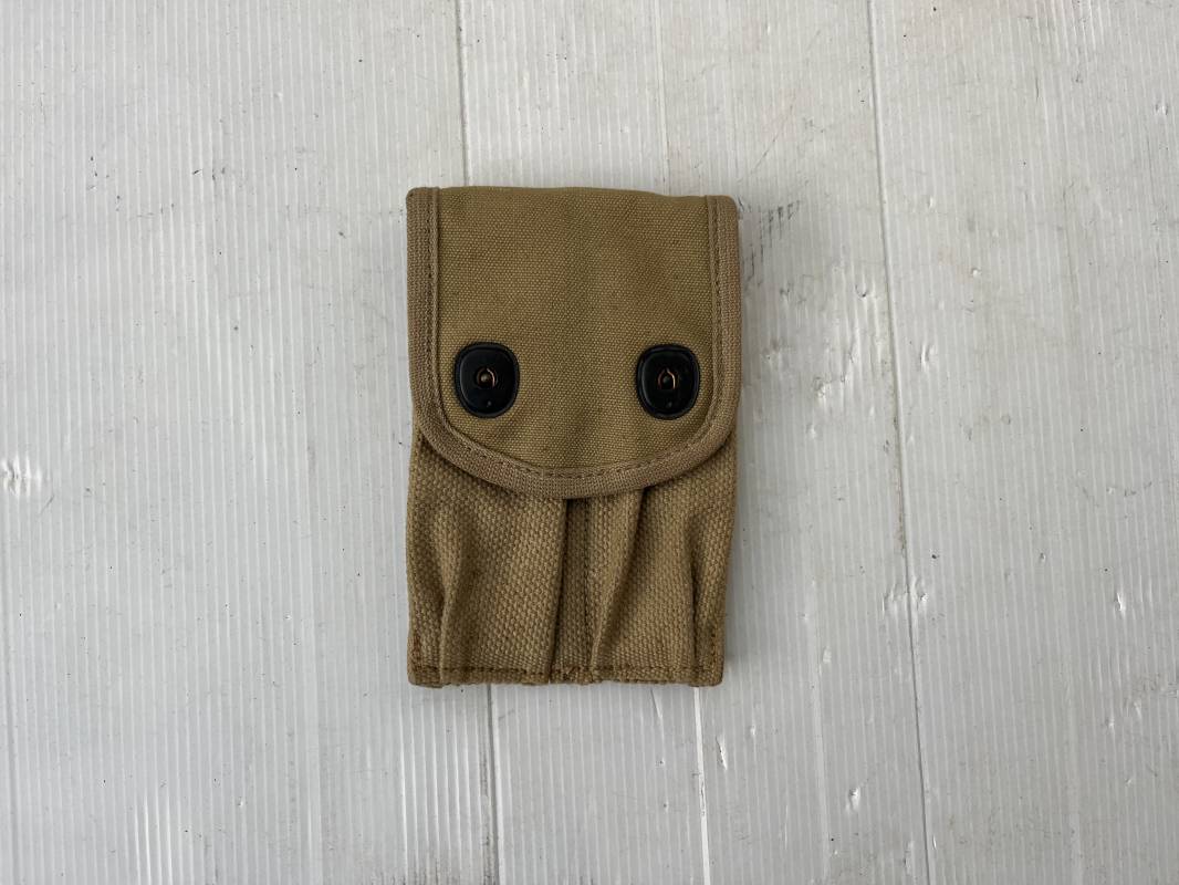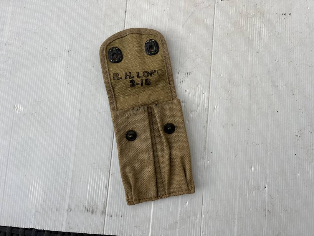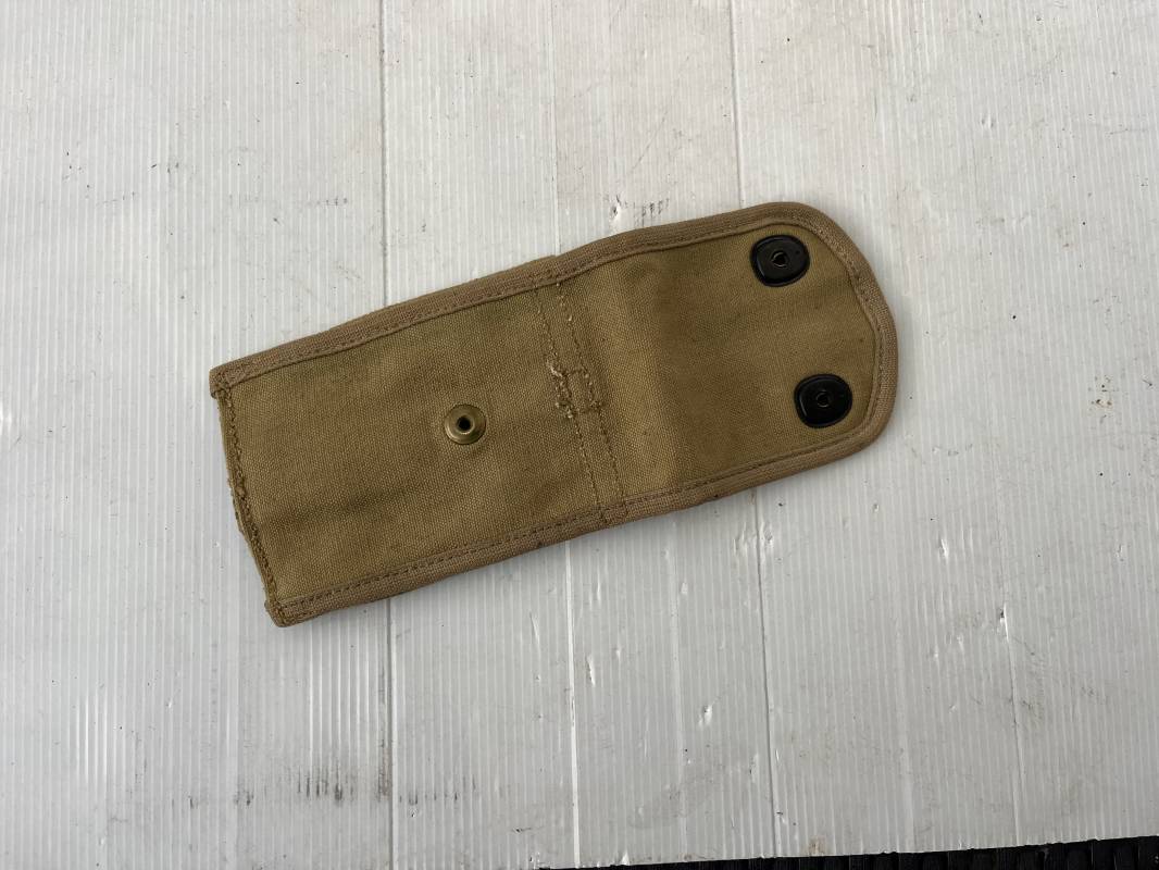 Pochette modèle 1918 porte chargeurs Colt 45 en coton filé kaki clair . Pochette avec bouton pression de fixation au ceinturon. Deux boutons pressions de fermeture . Marquage fabricant R.H. LONG 2- 1918. Parfait état. Ref 21728